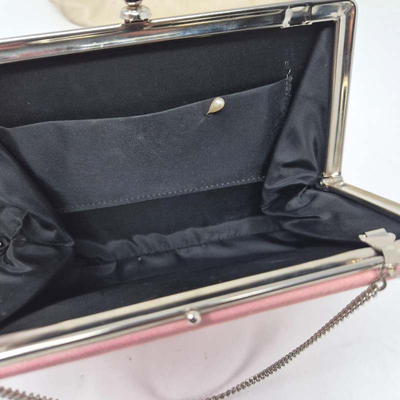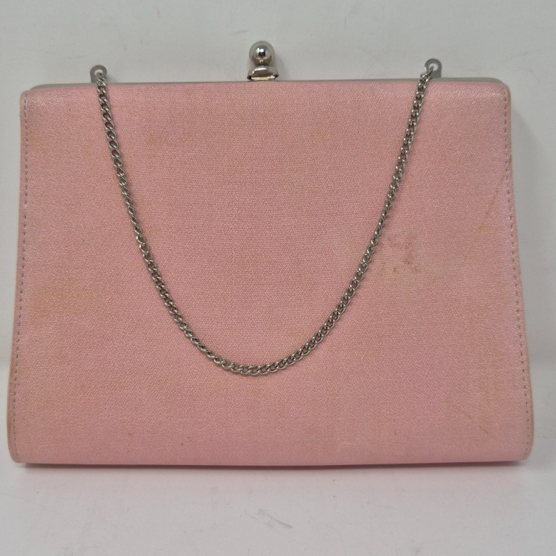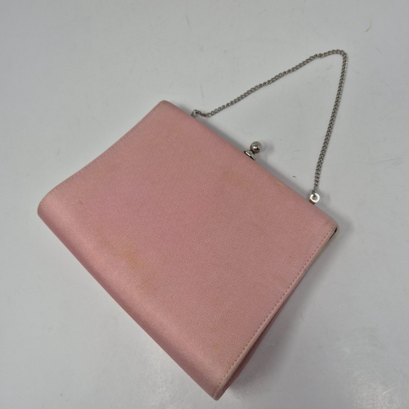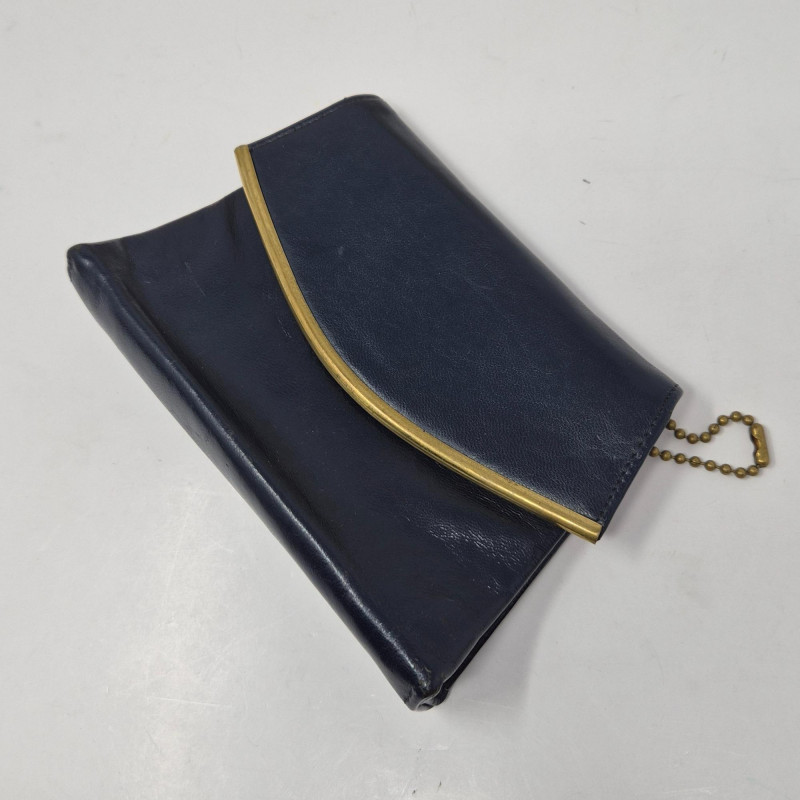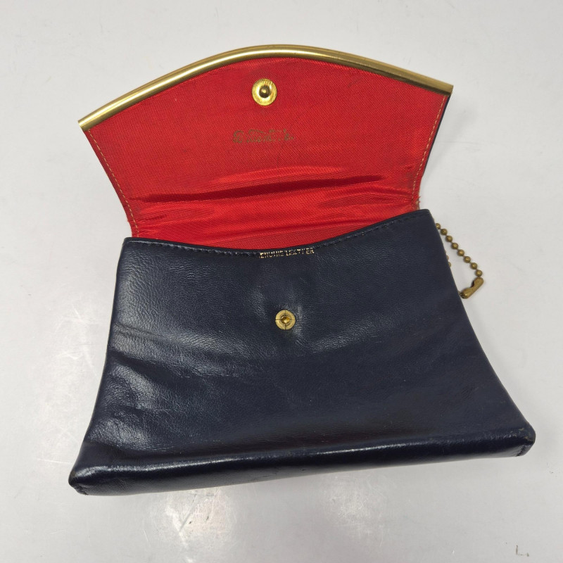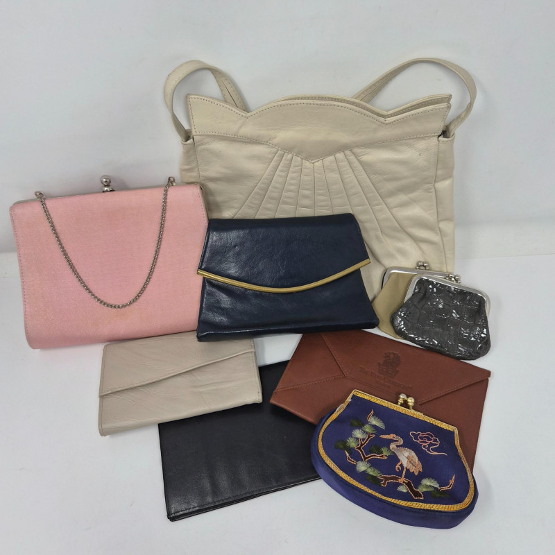 This collection of vintage wallets and handbag offers a touch of timeless style for any occasion. The centerpiece is a versatile beige leather purse with a unique scalloped design and comfortable strap, perfect for everyday elegance. Measures 10" L x 9" T. For a night out, the pink evening purse with its delicate silver-tone chain adds a pop of soft color (7.5" x 6" x 1.5"), while the dark navy blue cosmetic clutch is a chic and practical accessory (6" x 4" x 1.5") You'll also find a variety of smaller pieces, including a collection of compact wallets and coin purses that are perfect for keeping your essentials organized.