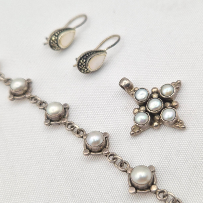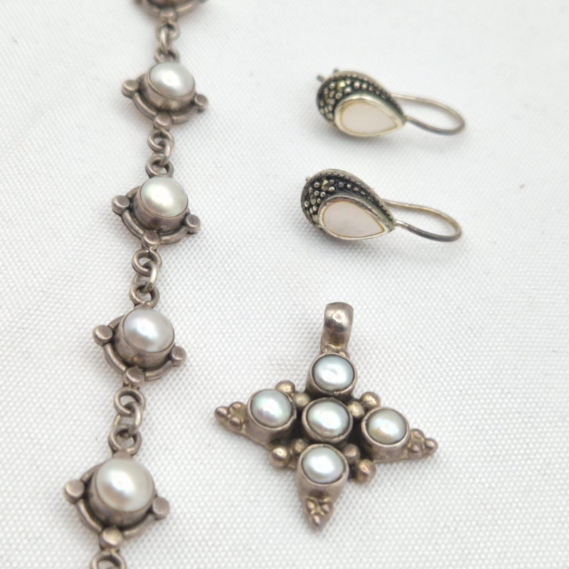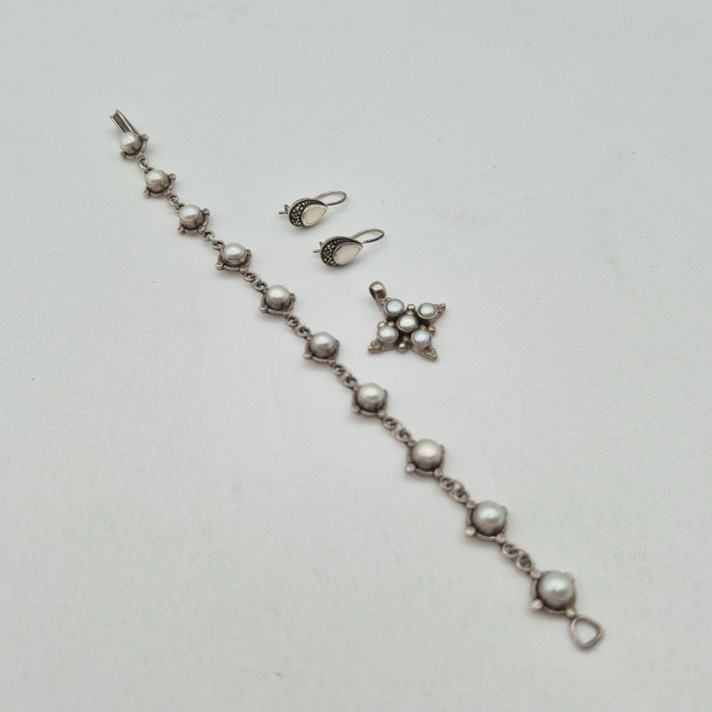 Lot # 83 - Elegant Pearl, MOP - 925 Bracelet, Earrings, Maltese Pendant