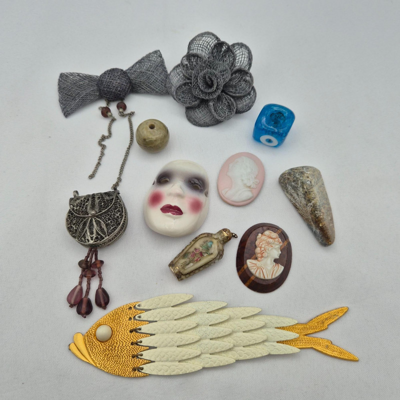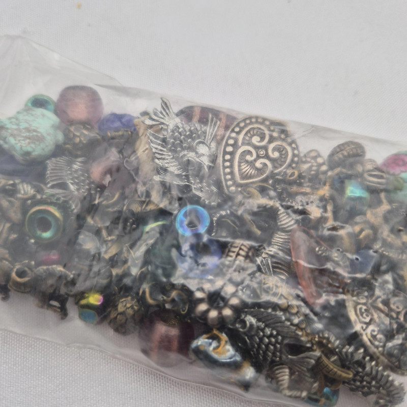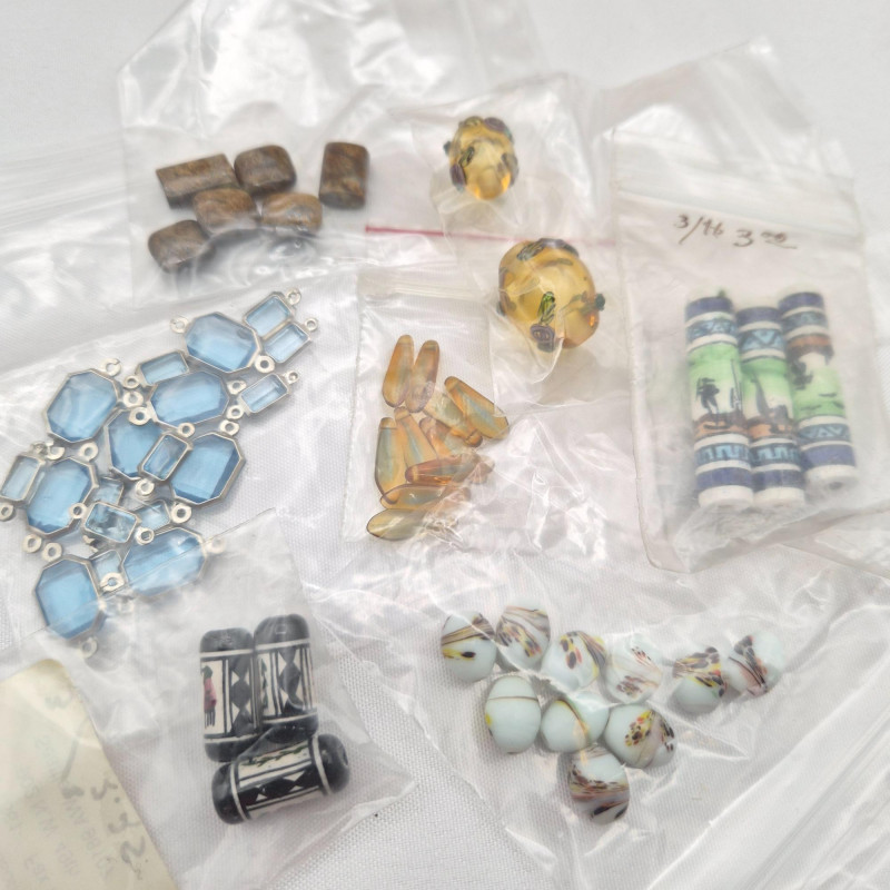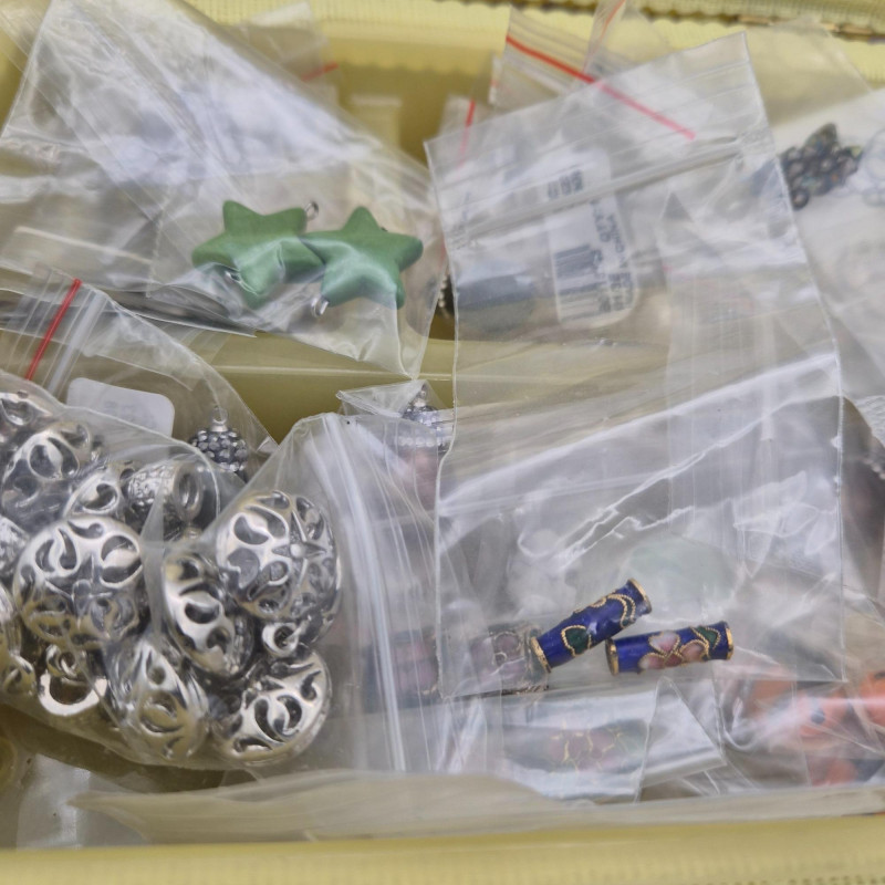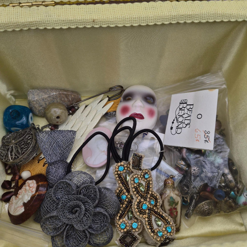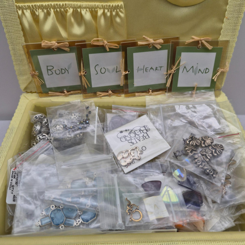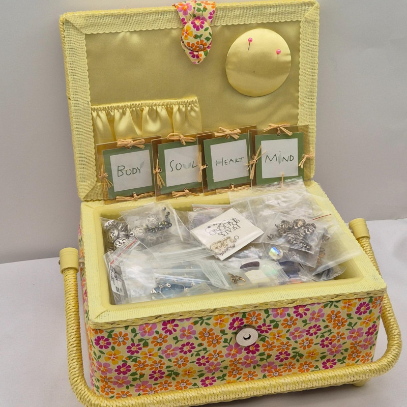 Lot # 85 - Sunny Yellow Floral Sewing Box with Beads, Charms & Craft Pieces