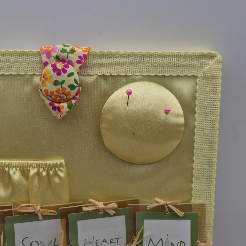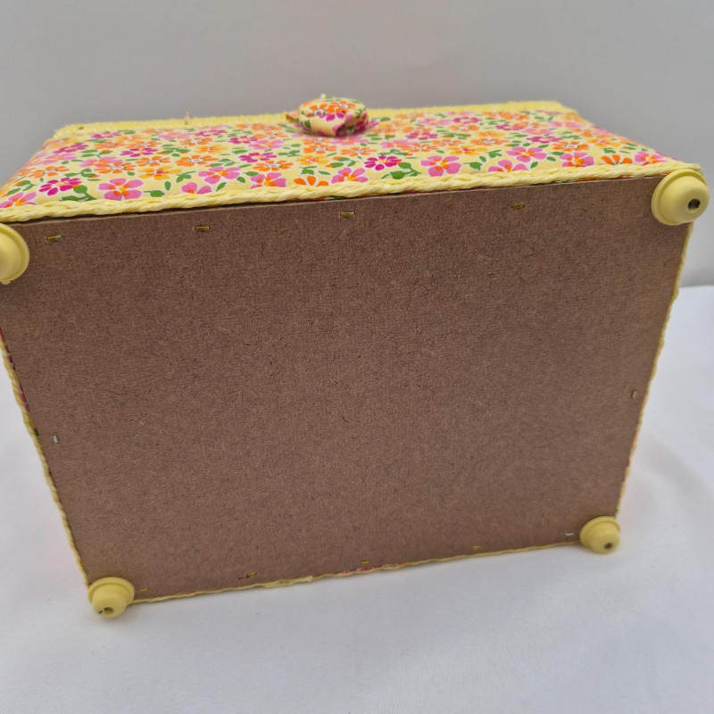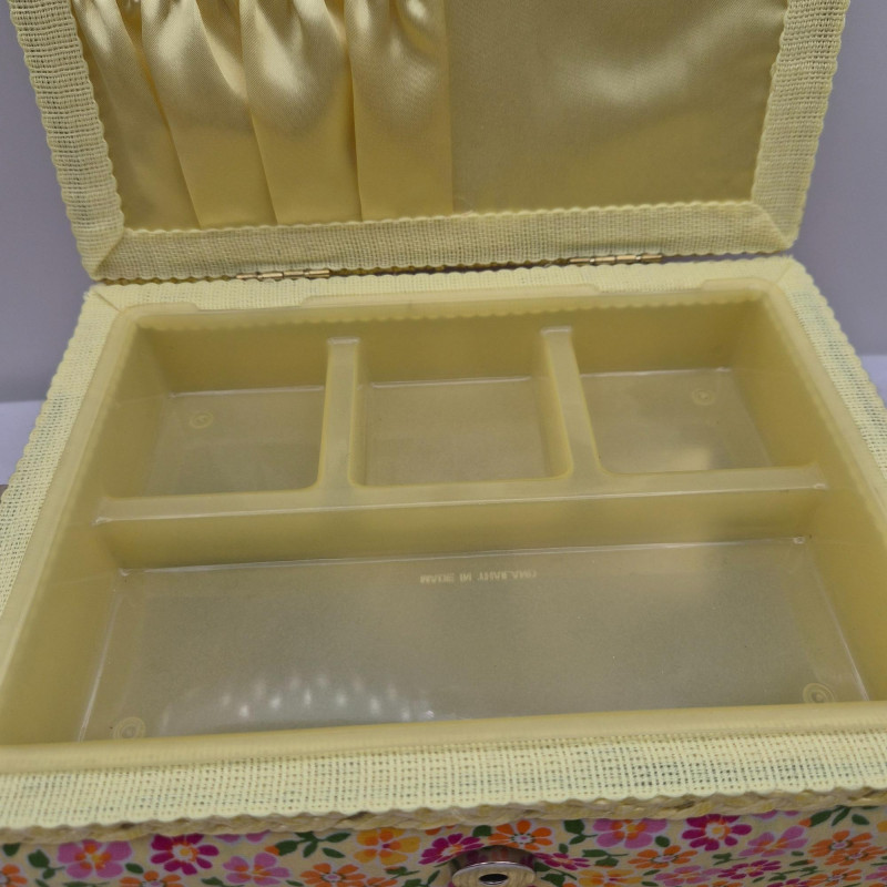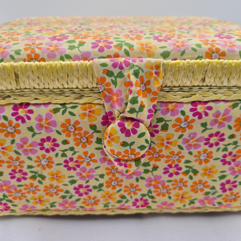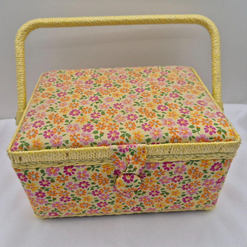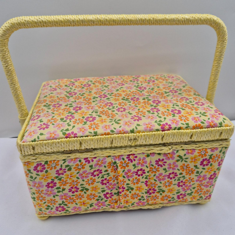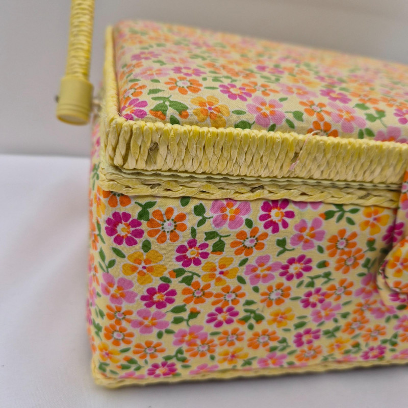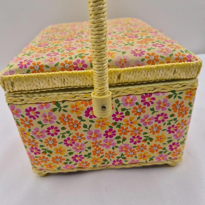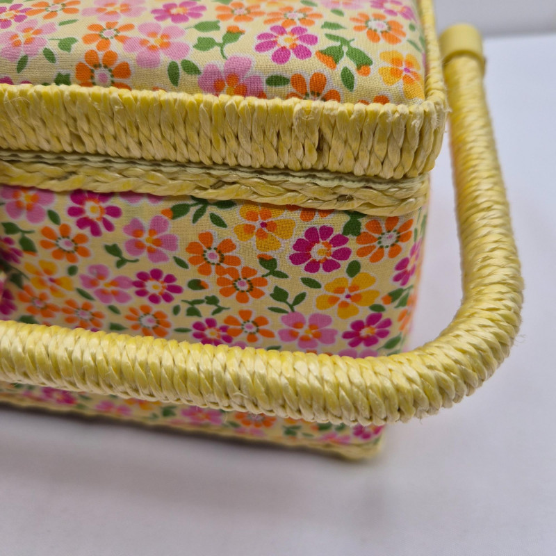 A burst of sunshine for the creative soul. This cheerful yellow floral sewing basket opens to reveal a delightful trove of crafting treasures, including: