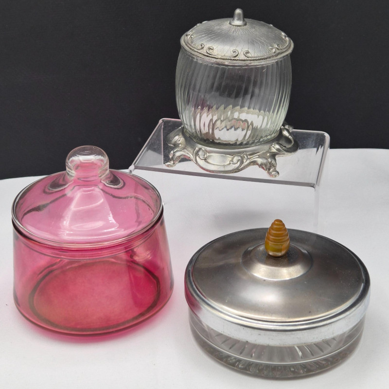 Trio of vintage vanity jars, each with distinctive character and collectible appeal: