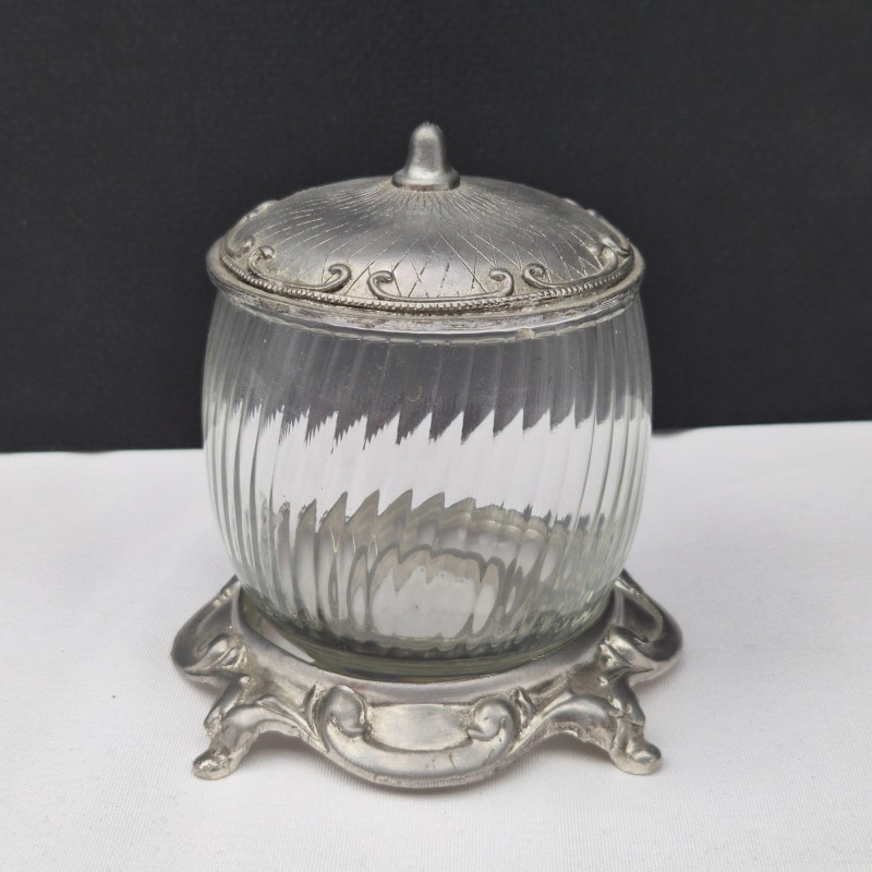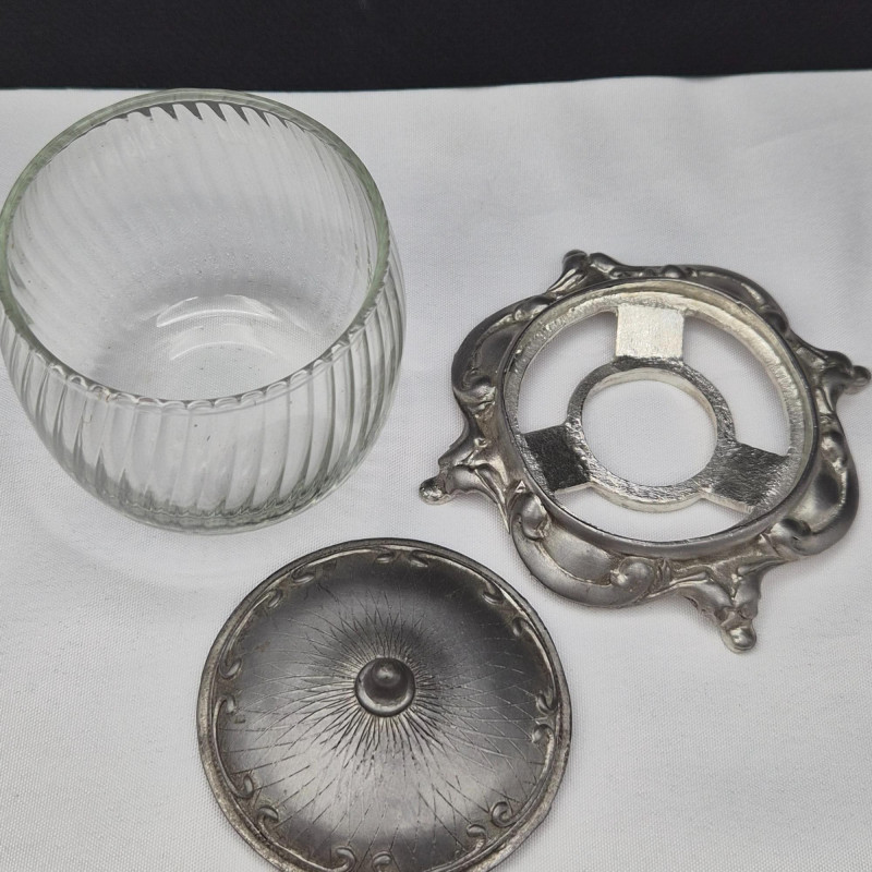 Ribbed clear glass body with a sculptural pewter lid and base. Signed Metzke USA, dated 1996. A blend of industrial edge and feminine refinement.