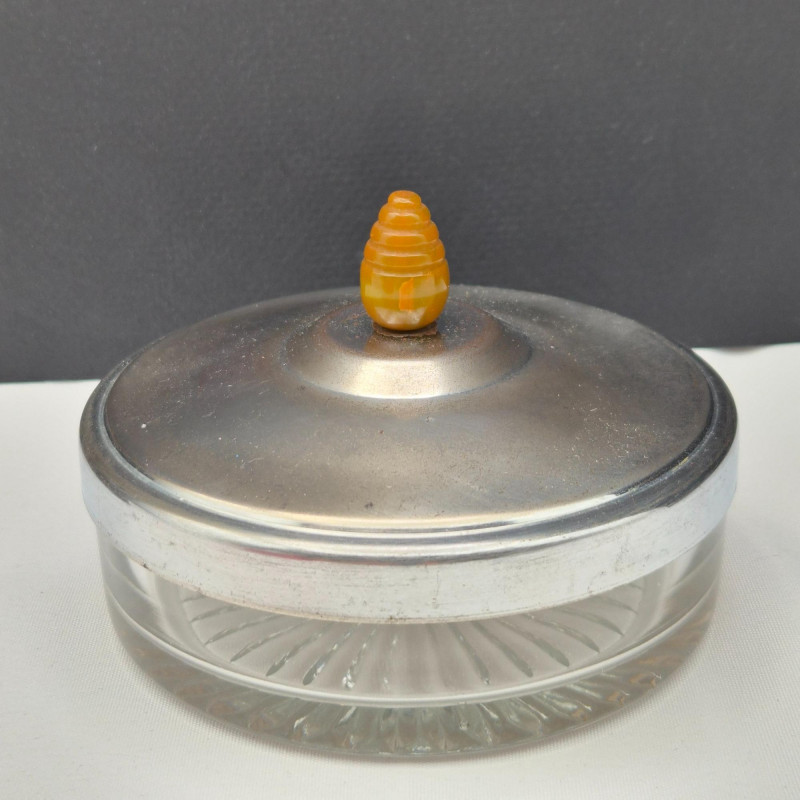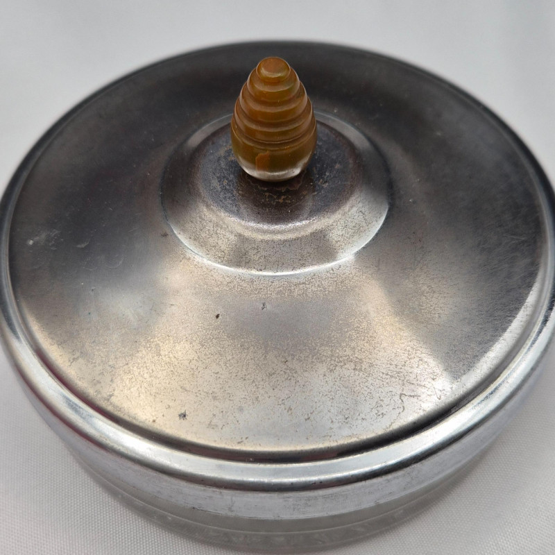 Low-profile glass jar topped with a metal lid and classic Bakelite handle. A nod to mid-century glamour and tactile design.