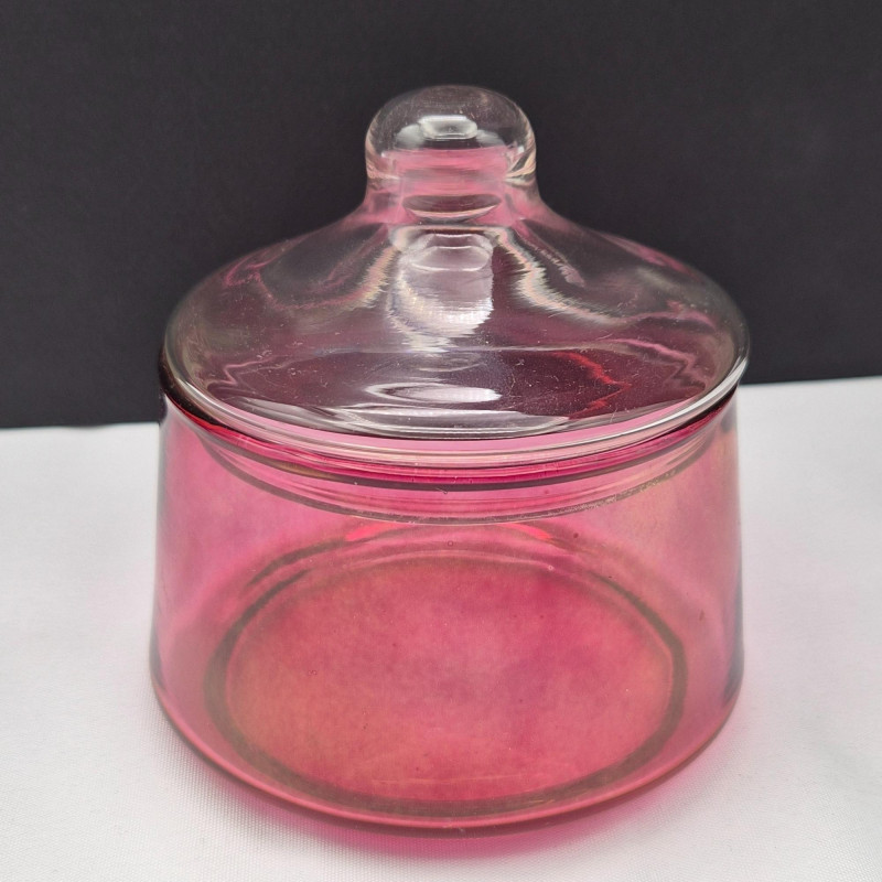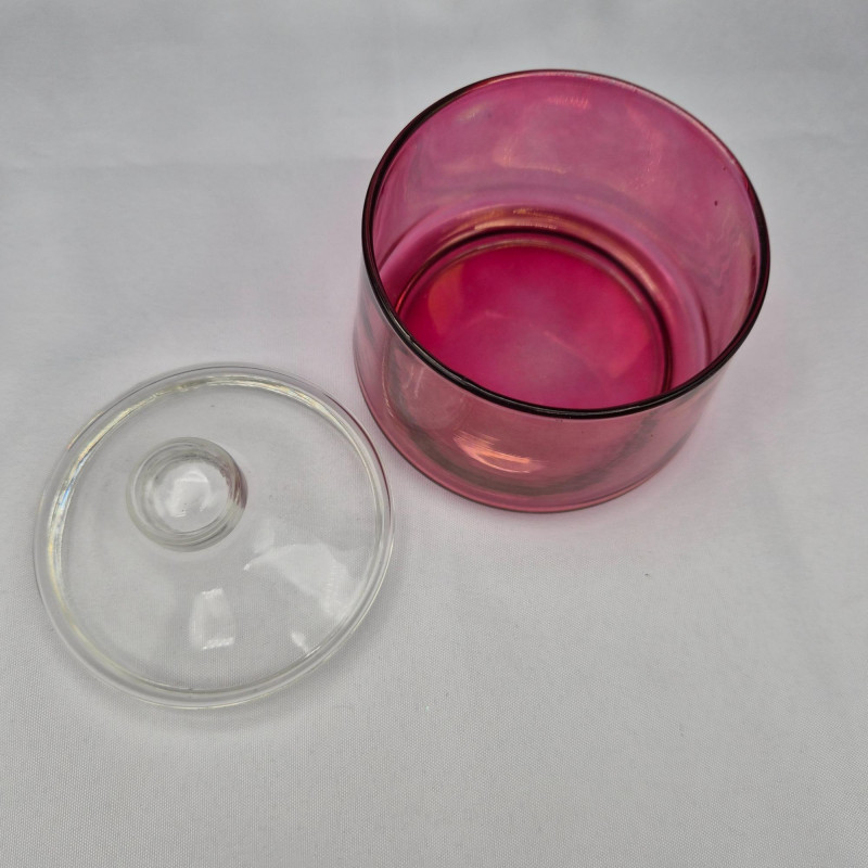 Rich cranberry glass base paired with a clear glass lid. A romantic accent piece with saturated color and graceful form.