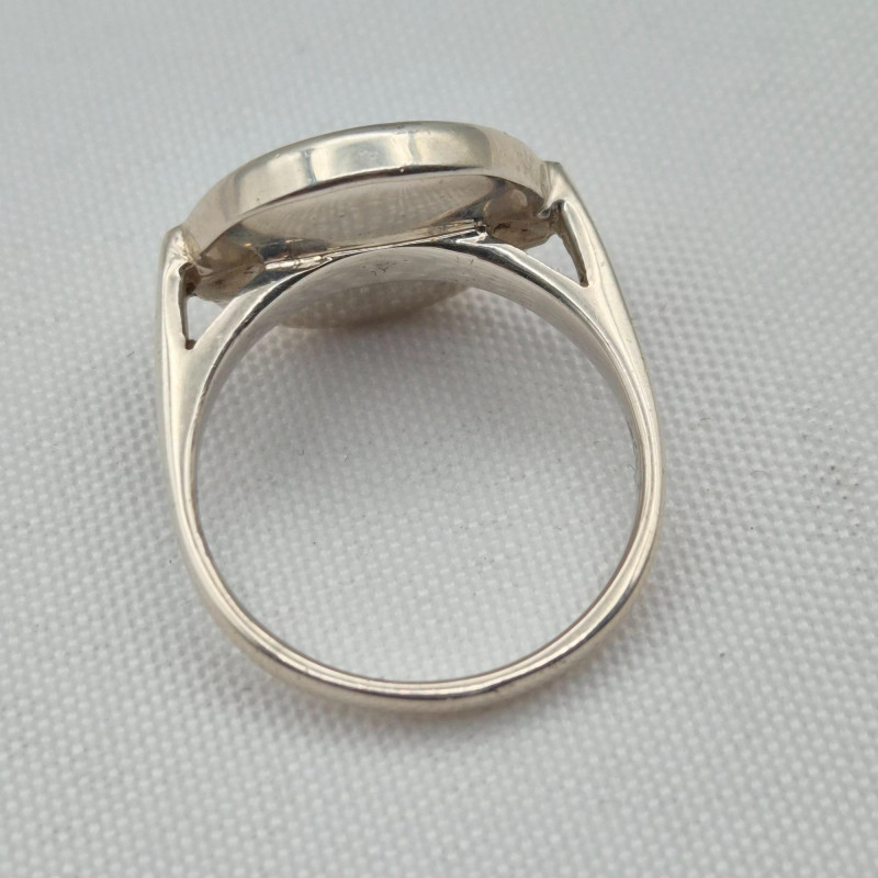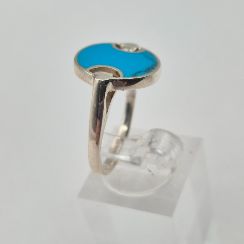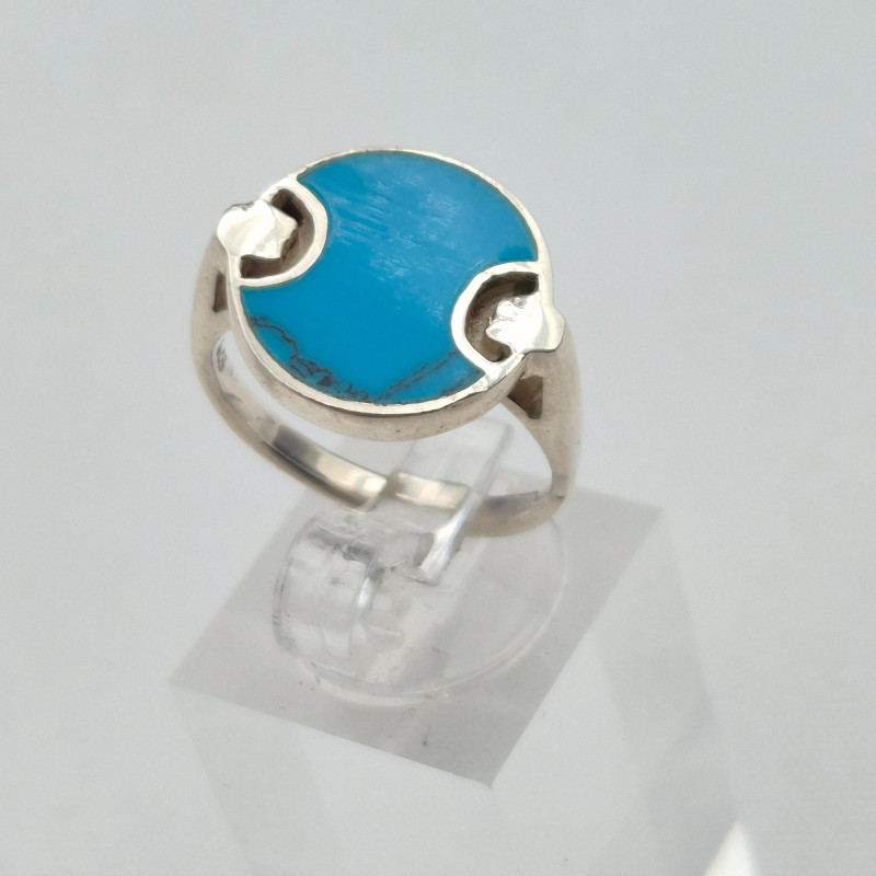 A flat, disk-like silhouette with turquoise inlay set into 925 sterling silver. Minimalist yet bold, this ring blends Southwestern influence with modernist restraint. A collectible accent for lovers of natural stone and sculptural design.