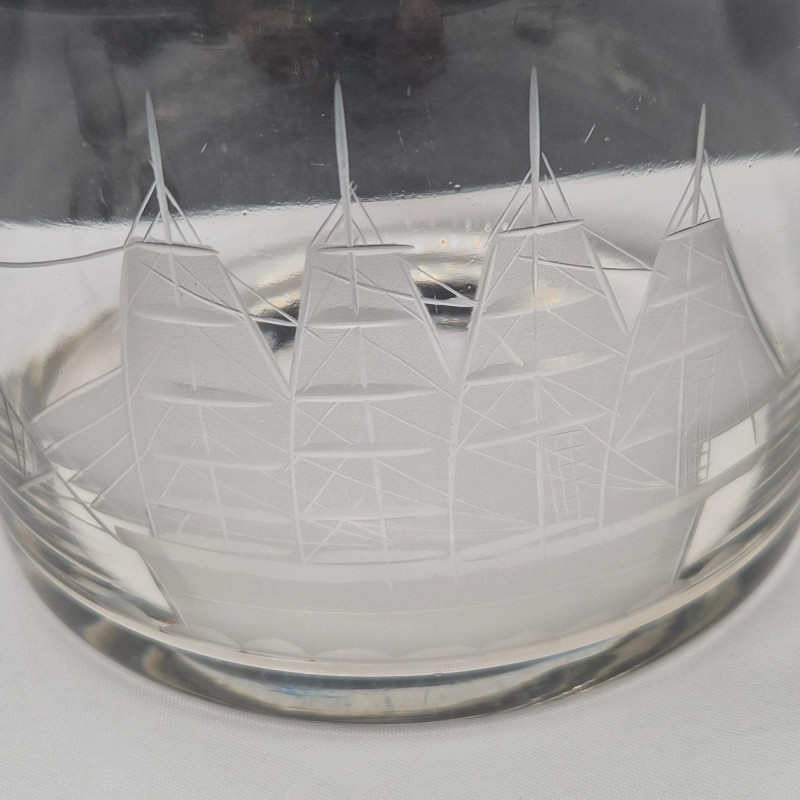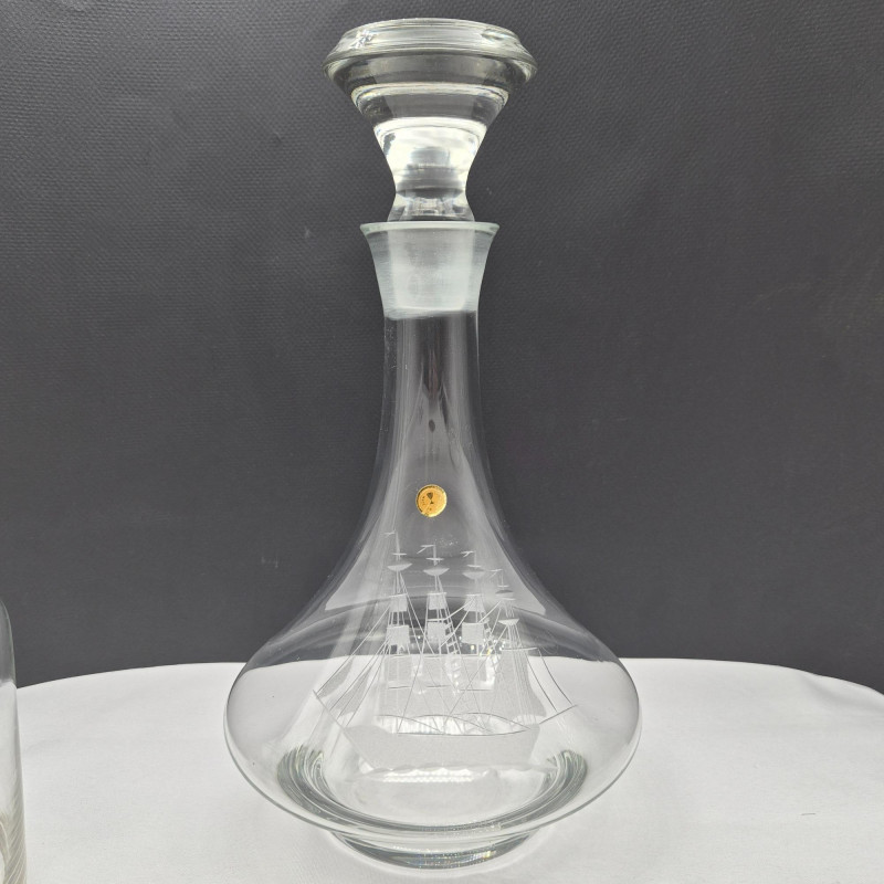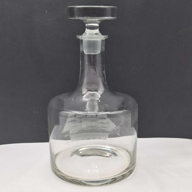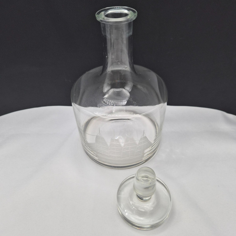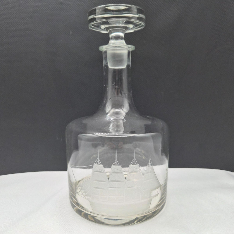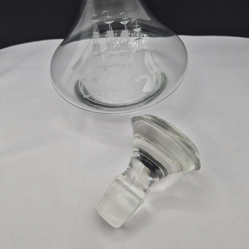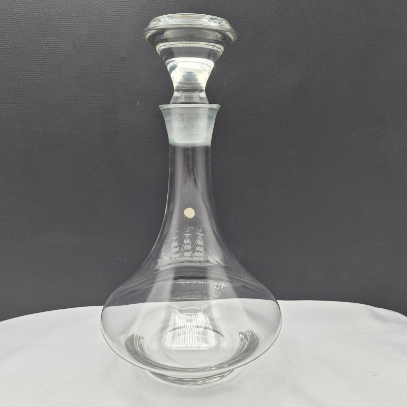 Classic rounded form with matching frosted ship etching. Topped with a clear glass stopper for a clean finish.
