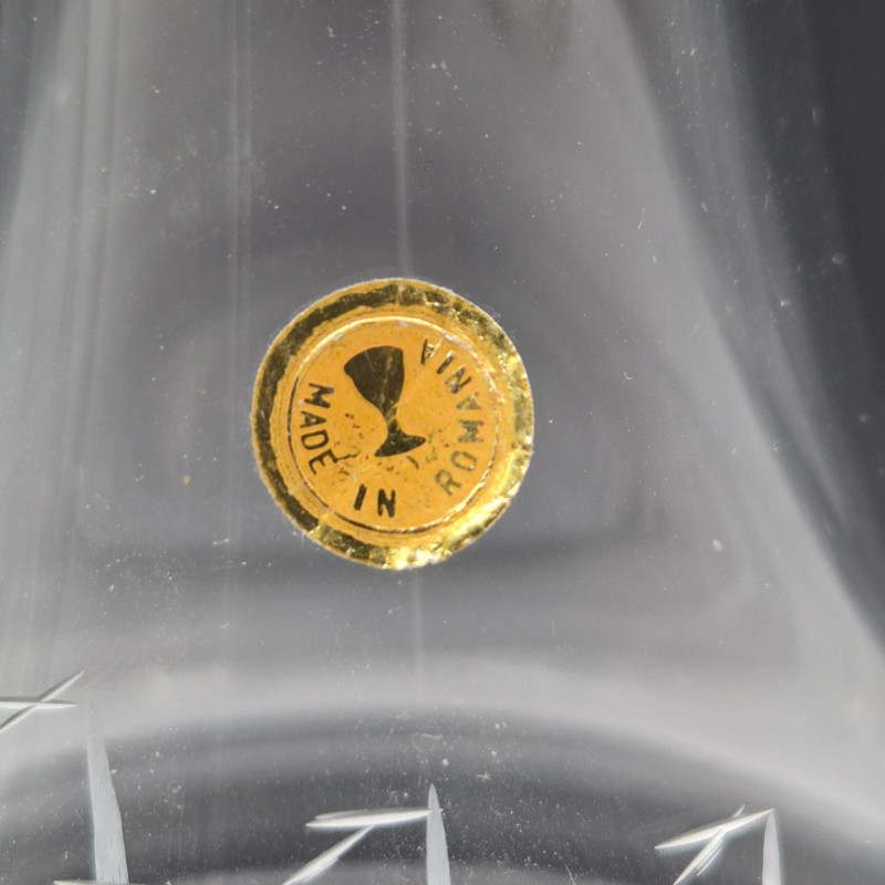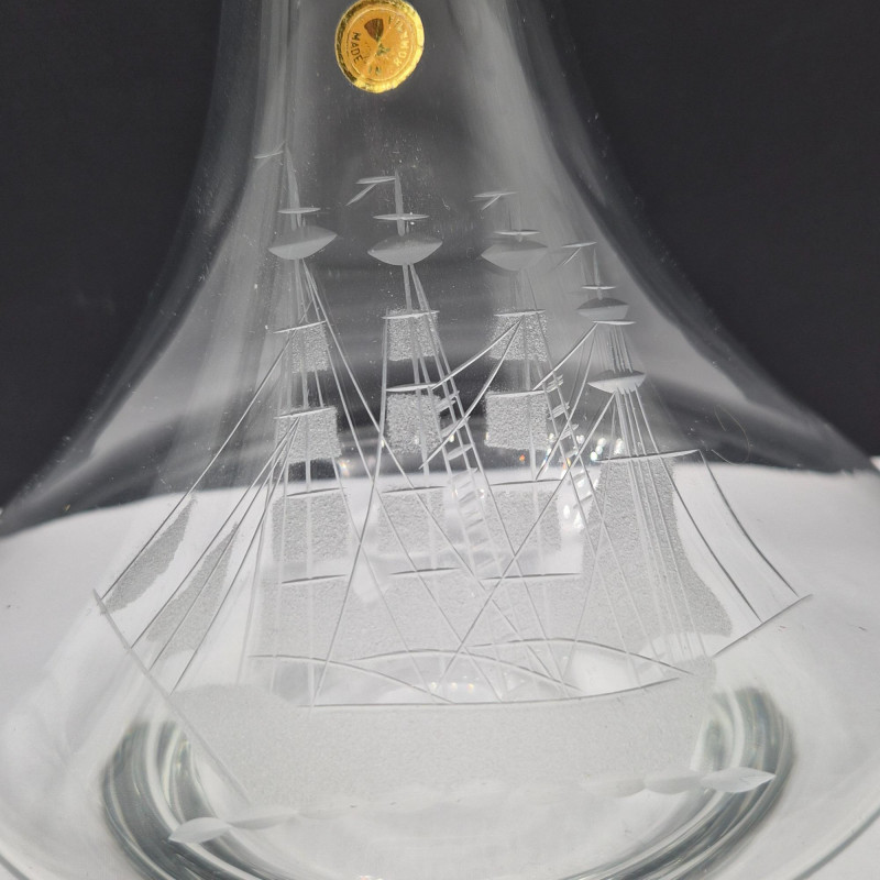 Sculptural silhouette with a wide base and slender neck. Frosted sailing ship etched on the front. Includes original stopper and “Made in Romania” sticker.