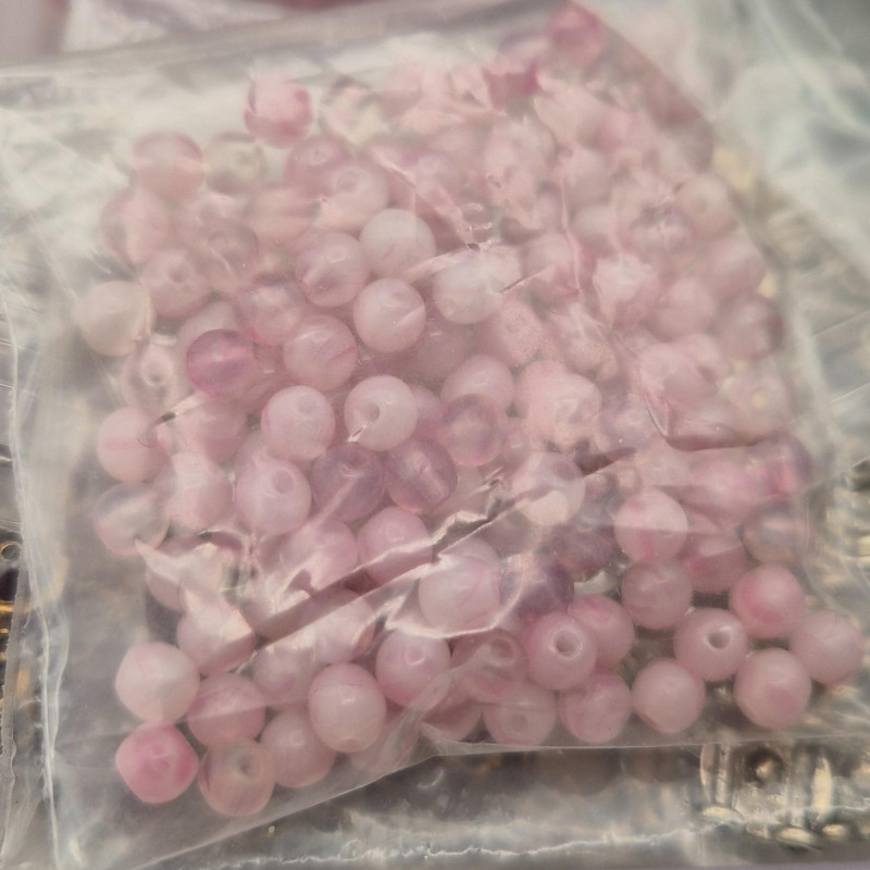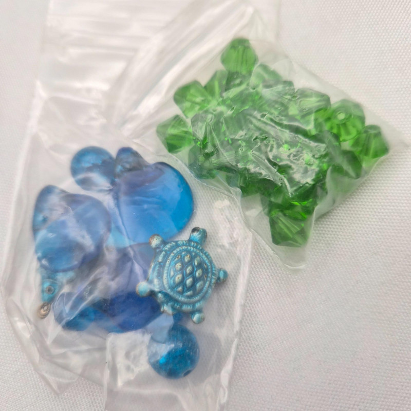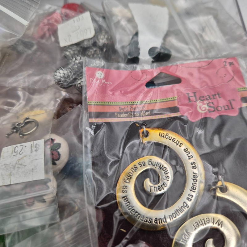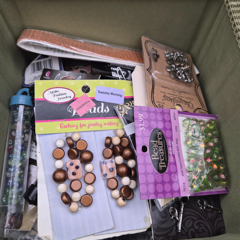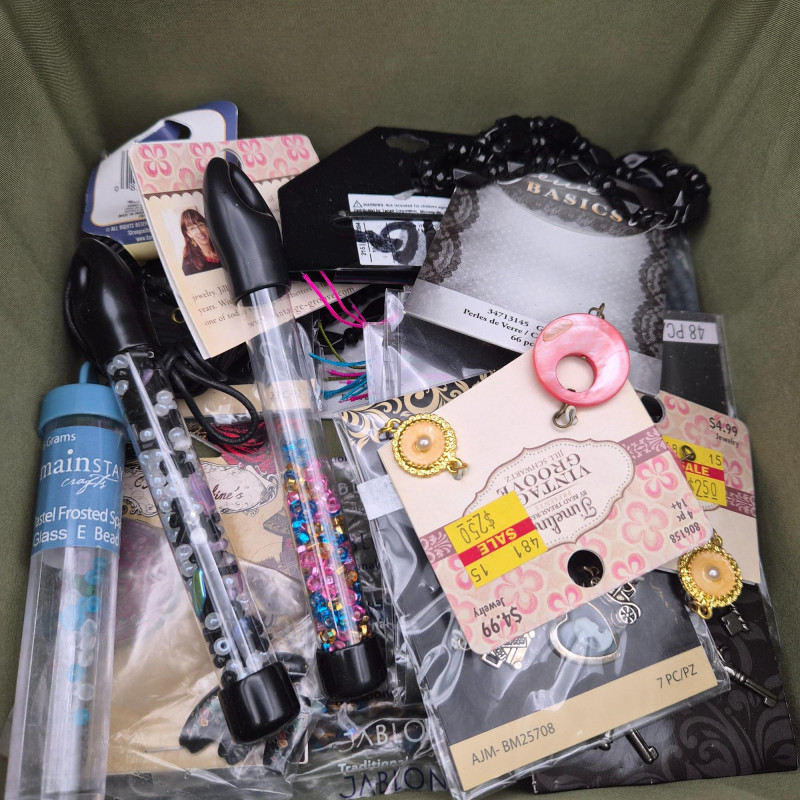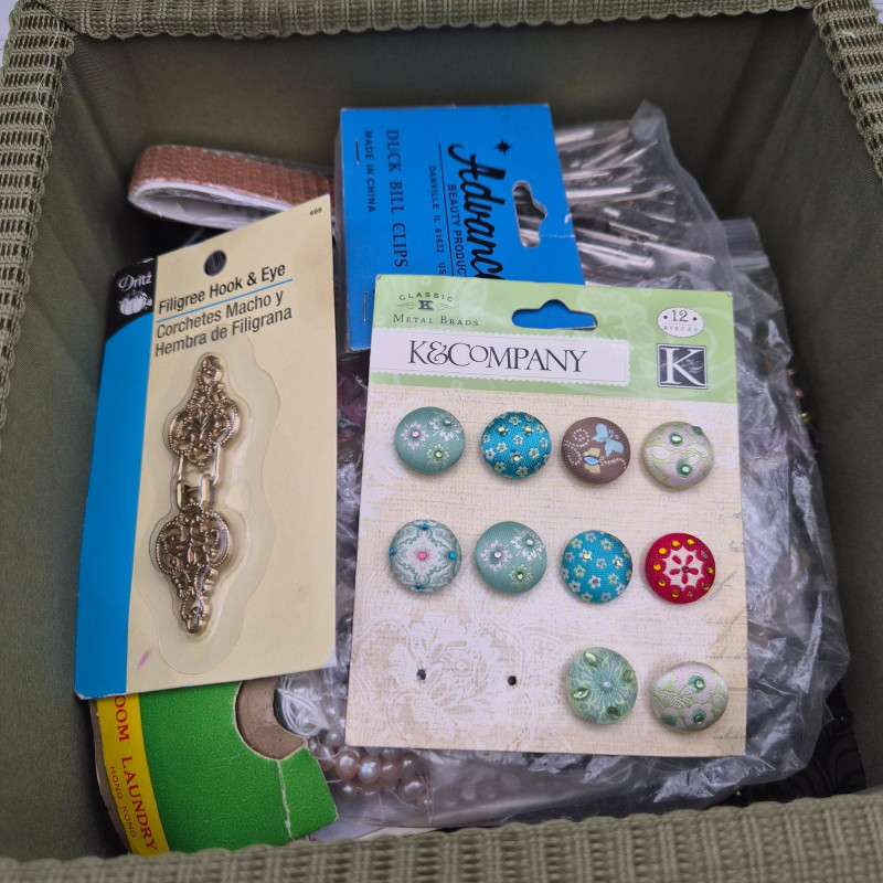 Darling bird fabric wrapped sewing basket/box made in the Philippines. Filled with all kinds of beading surprises.