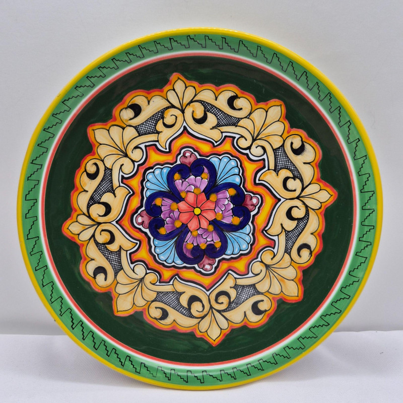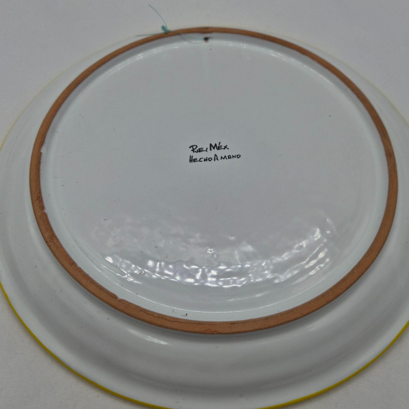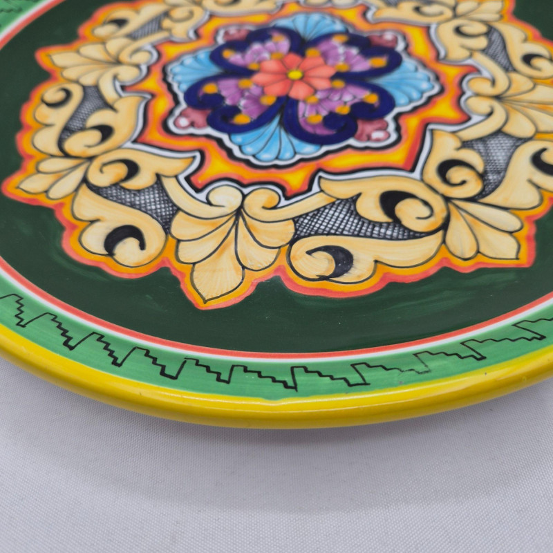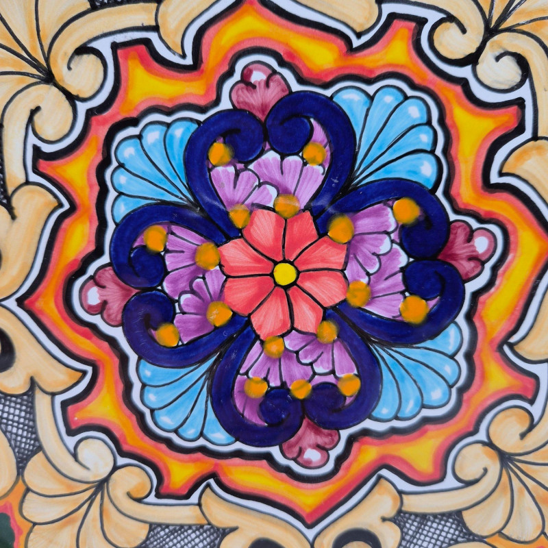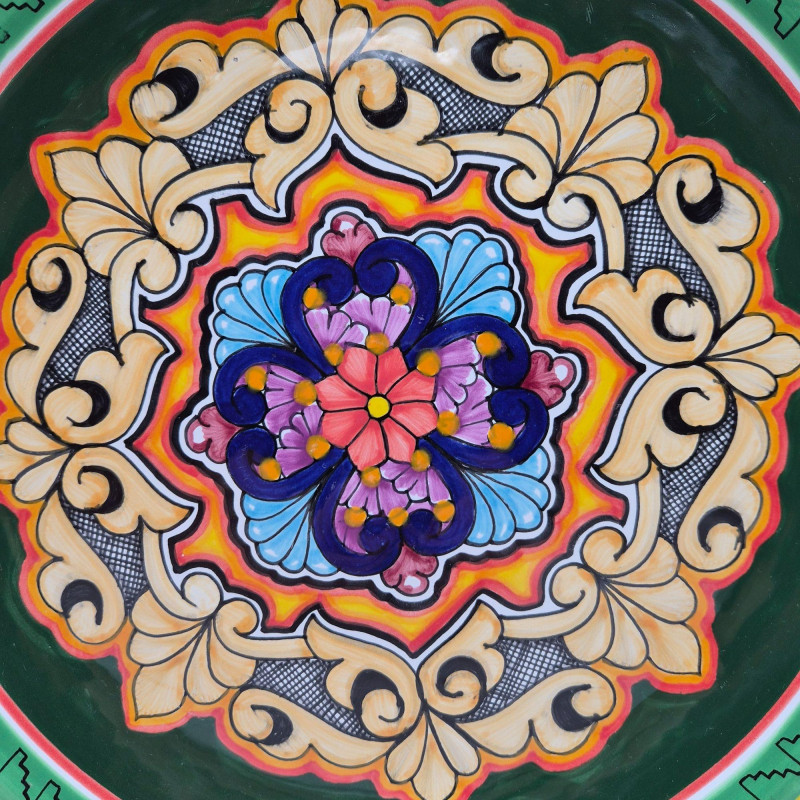A stunning hand painted terracotta wall plate from Puebla, Mexico, marked Hecho a Mano. This decorative piece showcases intricate floral and scrollwork motifs in vivid hues of blue, red, purple, and gold, framed by a zigzag border and warm yellow rim. The symmetrical design and textured detailing reflect traditional Mexican folk artistry, making it a striking accent for wall display or cultural collections. A beautiful fusion of craftsmanship and heritage. “PUE, MÉX – HECHO A MANO”