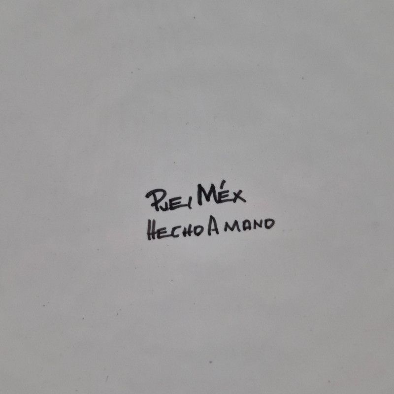 Which translates to: Puebla, Mexico – Handmade Puebla - a region in Mexico known for its rich ceramic traditions, especially Talavera pottery. Hecho a mano means handmade, indicating artisanal craftsmanship.