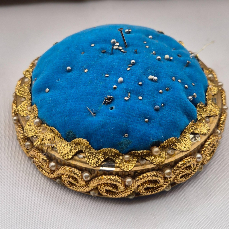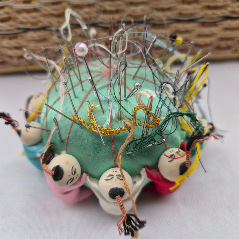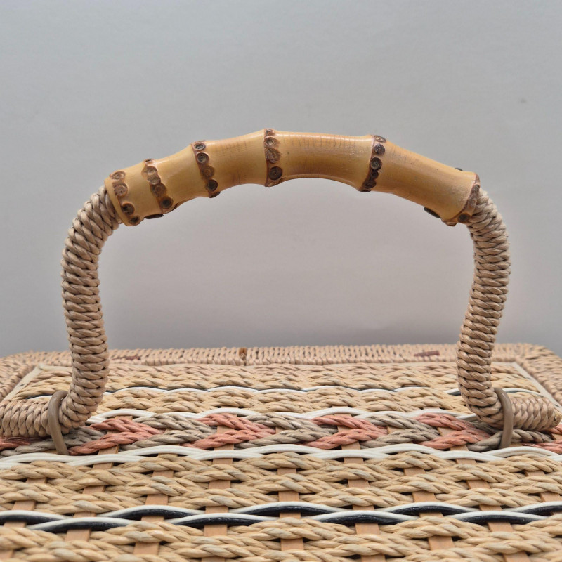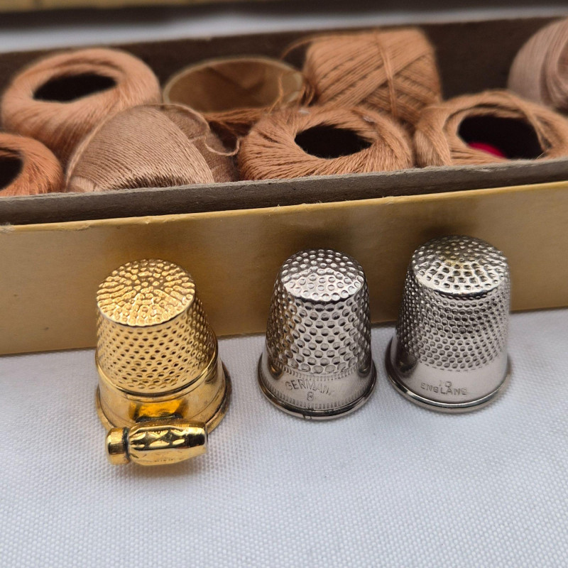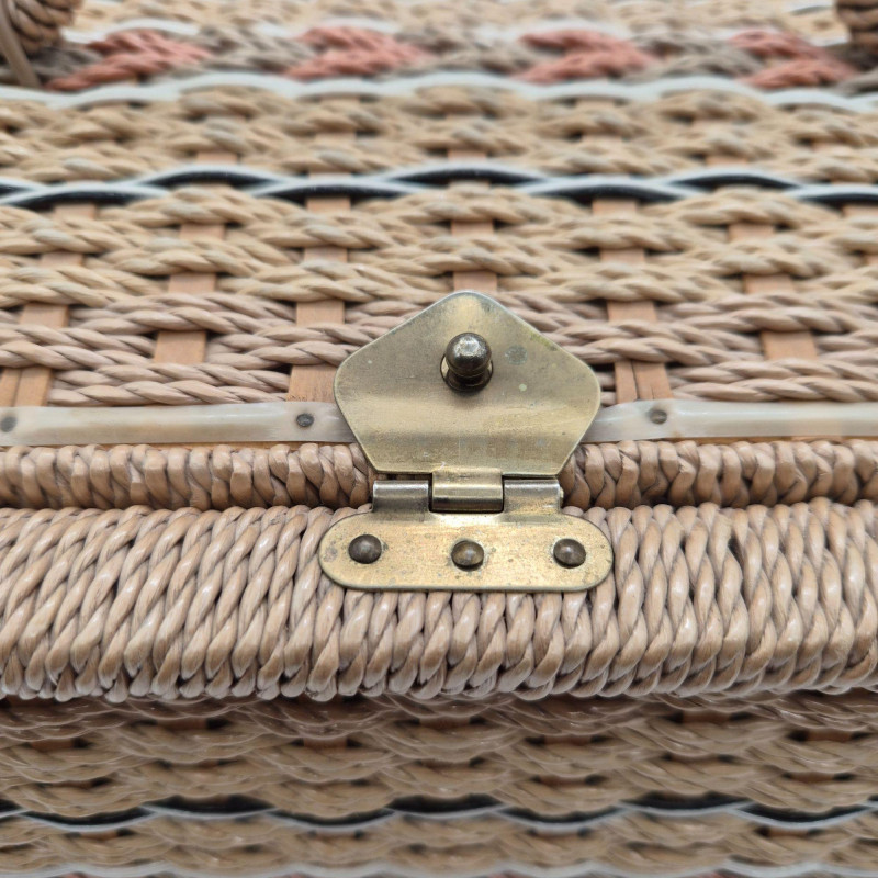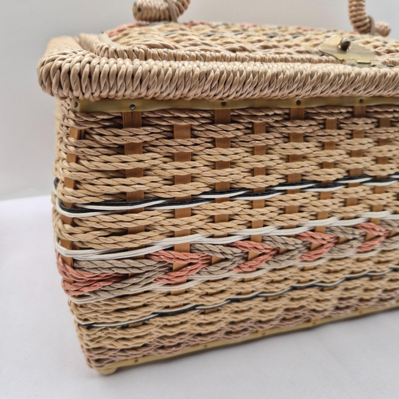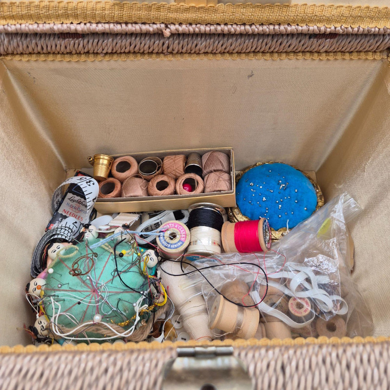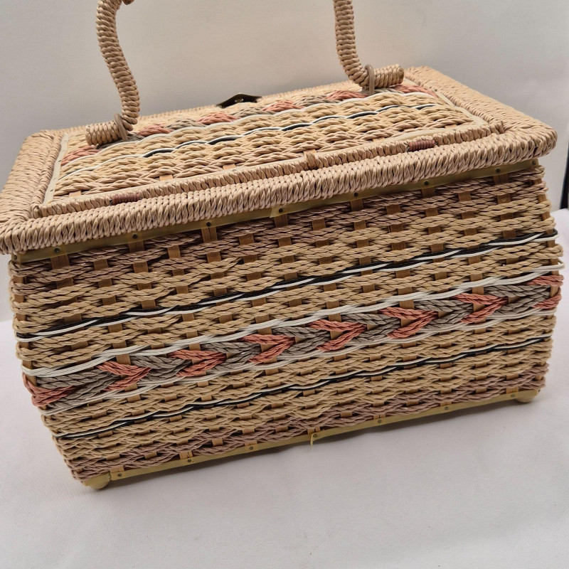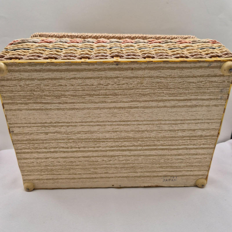A beautifully woven wicker sewing basket, exclusively sold by (J.C.) Penneys and made in Japan, measuring approximately 12.5" x 9.25" x 7". This charming storage piece features a hinged lid with metal latch, a sturdy woven handle, and a rich natural finish with reddish undertones. Inside, you’ll find a delightful assortment of vintage sewing notions including thimbles, thread spools, measuring tapes, pin cushions, and more—each evoking the quiet joy of handcraft and homemaking. A lovely find for collectors, crafters, or anyone drawn to the timeless elegance of mid-century domestic design.