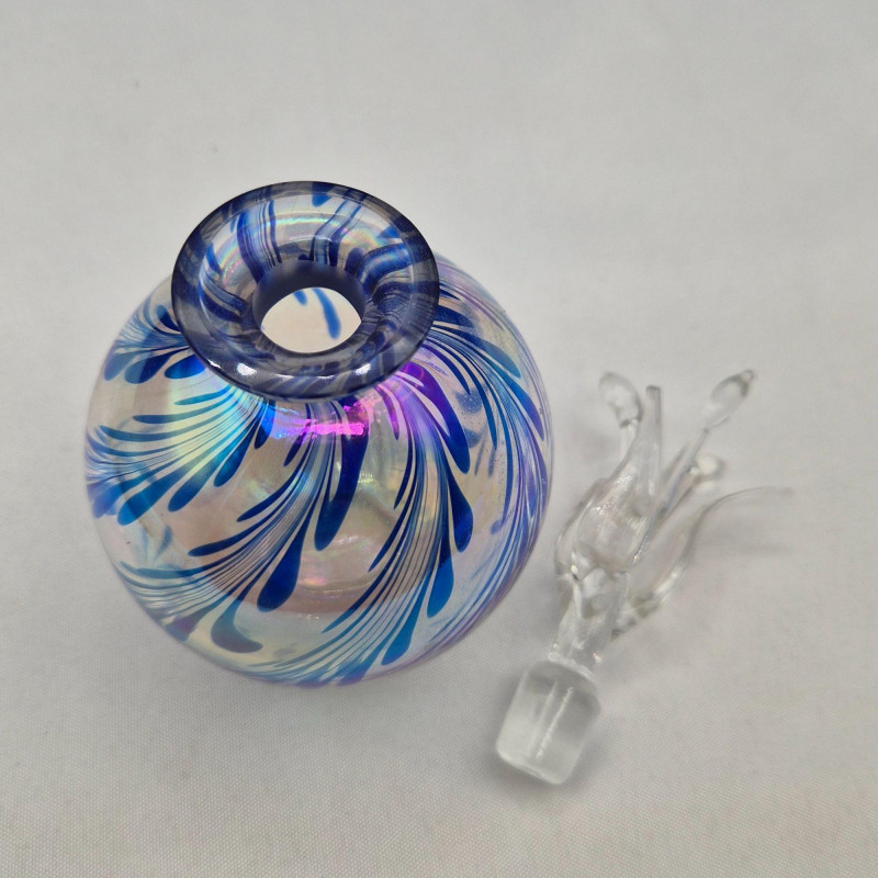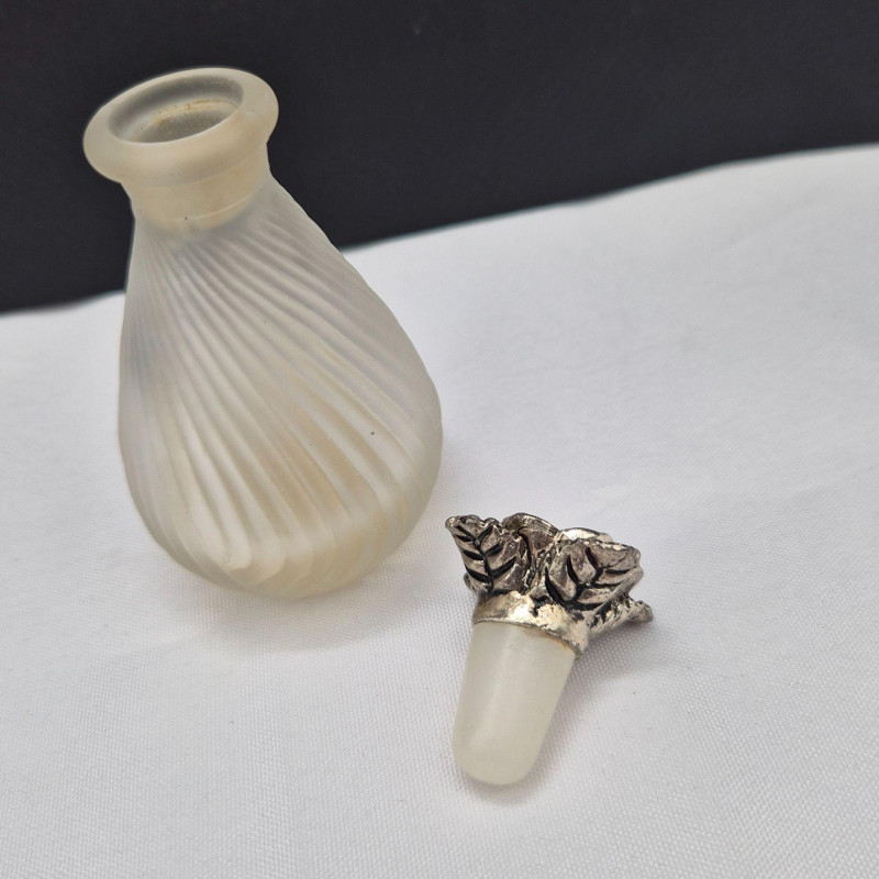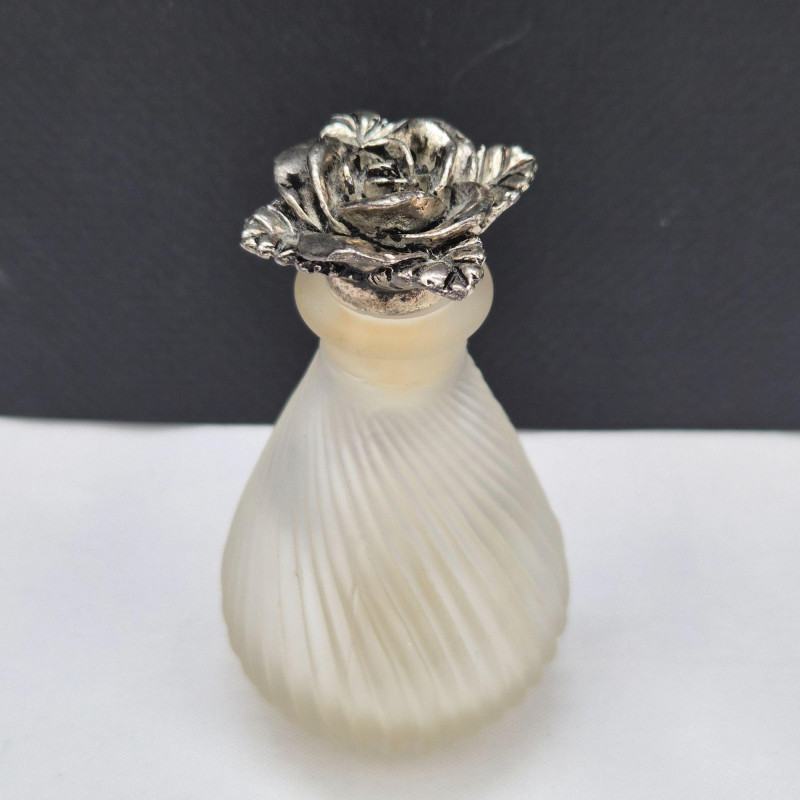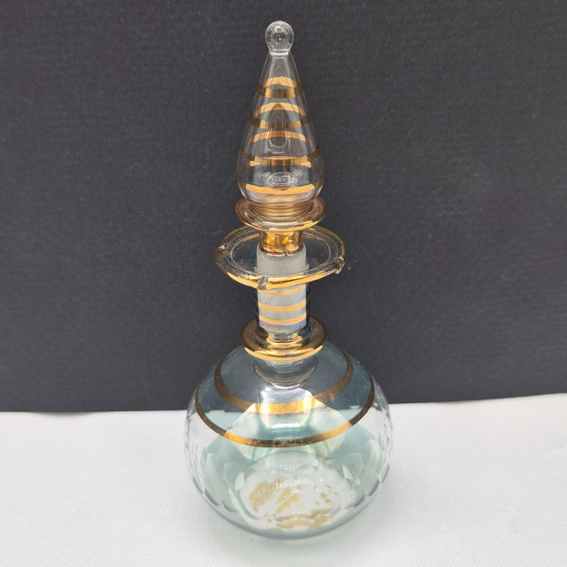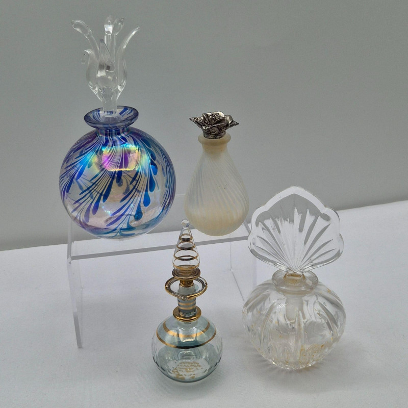 A charming quartet of glass perfume bottles, each with its own distinctive character and decorative appeal. Ranging in size from 3" to 5.5", this lot includes: Perfect for vanity display, vintage decor, or collectors of perfume ephemera. These bottles evoke a sense of nostalgia and artistry, each one a miniature vessel of beauty.