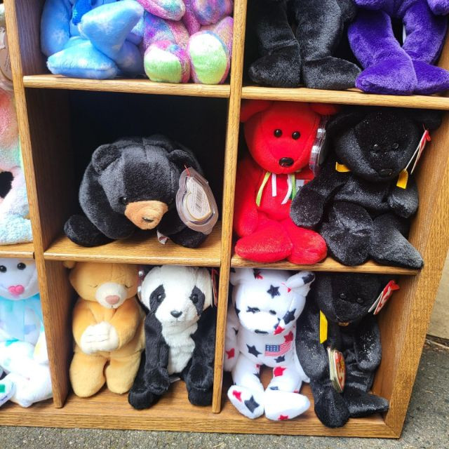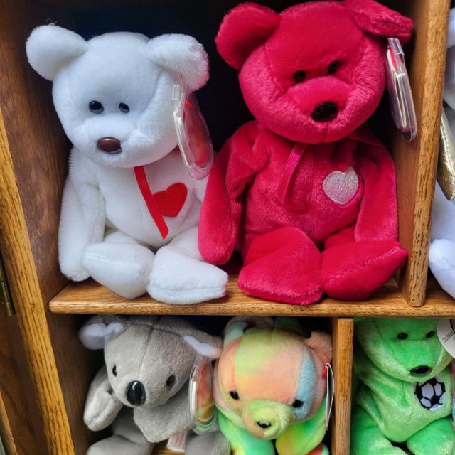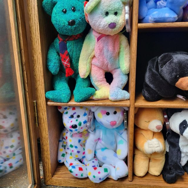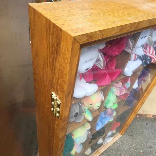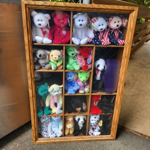 Collectible Beanies and wood display case. Most have tags and range in dates from 1990's-2000's. Have been stored in a nice wood and glass display shelf that can be mounted on a wall. Dimensions are 20" x 30" x 5".