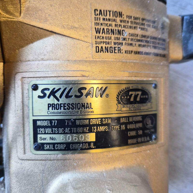 Skilsaw Model 77, a 7¼-inch Professional Commemorative Edition celebrated for its power, precision, and legacy in the trades. This commemorative model honors decades of trusted performance, making it a standout for collectors, contractors, or anyone who appreciates classic, jobsite-ready gear. Built tough and designed for serious cutting tasks, it’s a piece of tool history with real-world utility. Works.