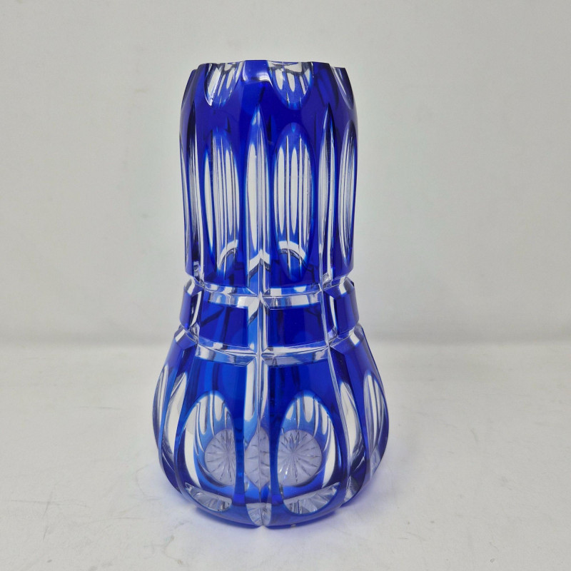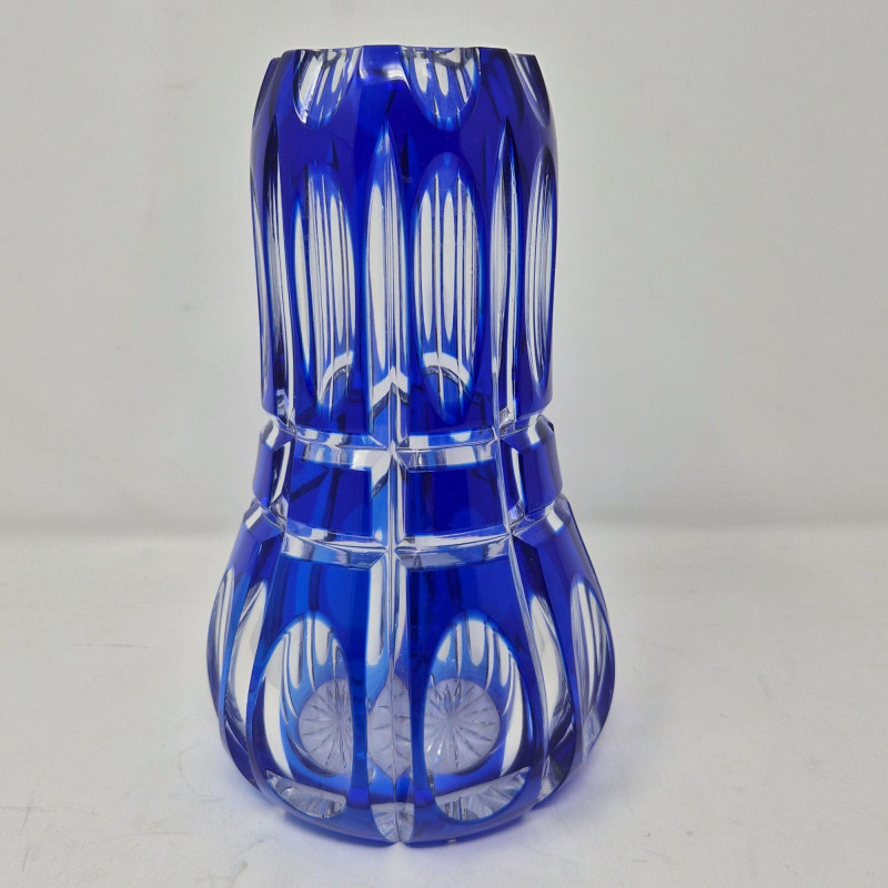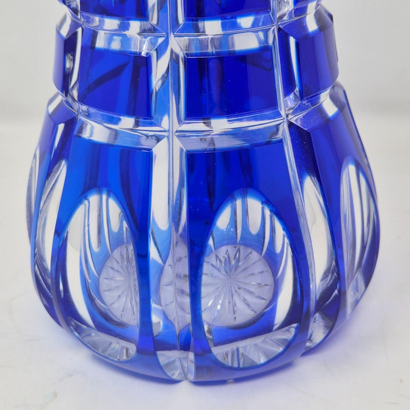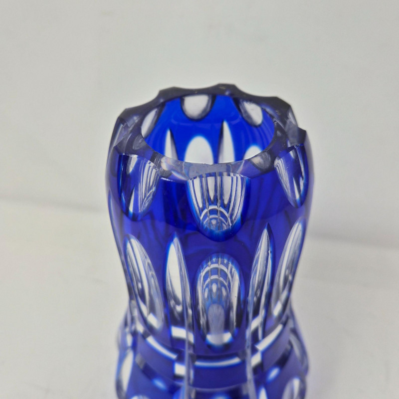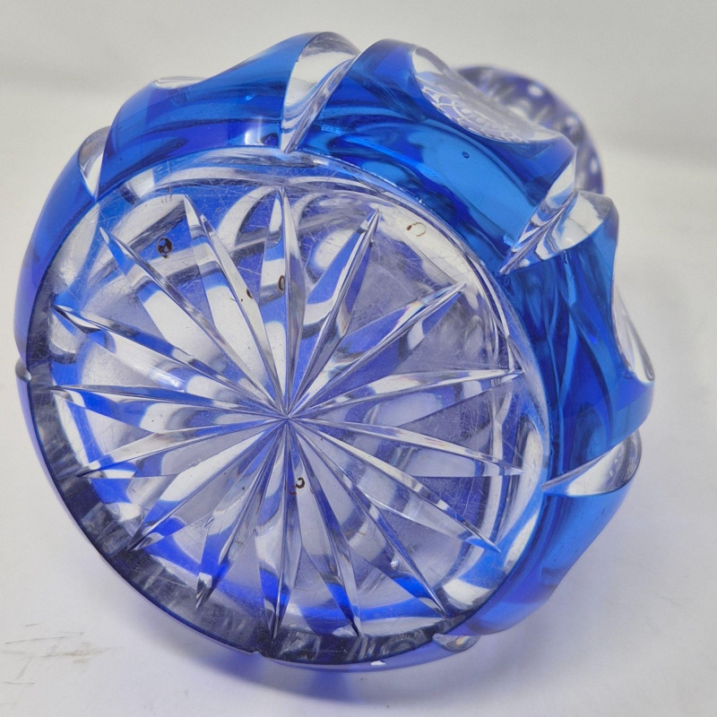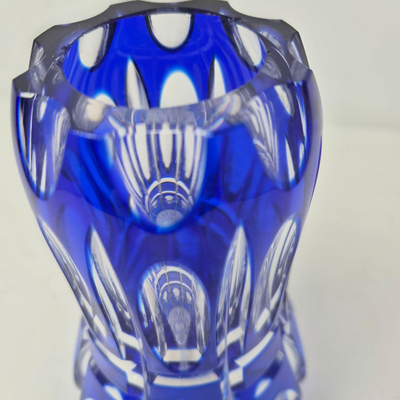 Bohemian glass vase crafted in rich cobalt blue with clear crystal accents. This elegant piece stands 8" tall and 5" wide, showcasing classic European artistry and vibrant color. There are a couple of small ‘flea bite’ chips on the inside rim—minor and typical for vintage glass, not distracting from its display appeal.