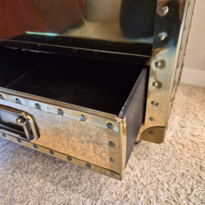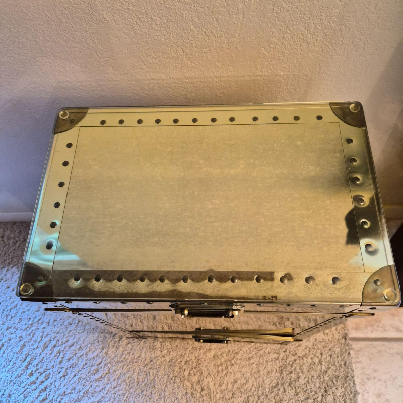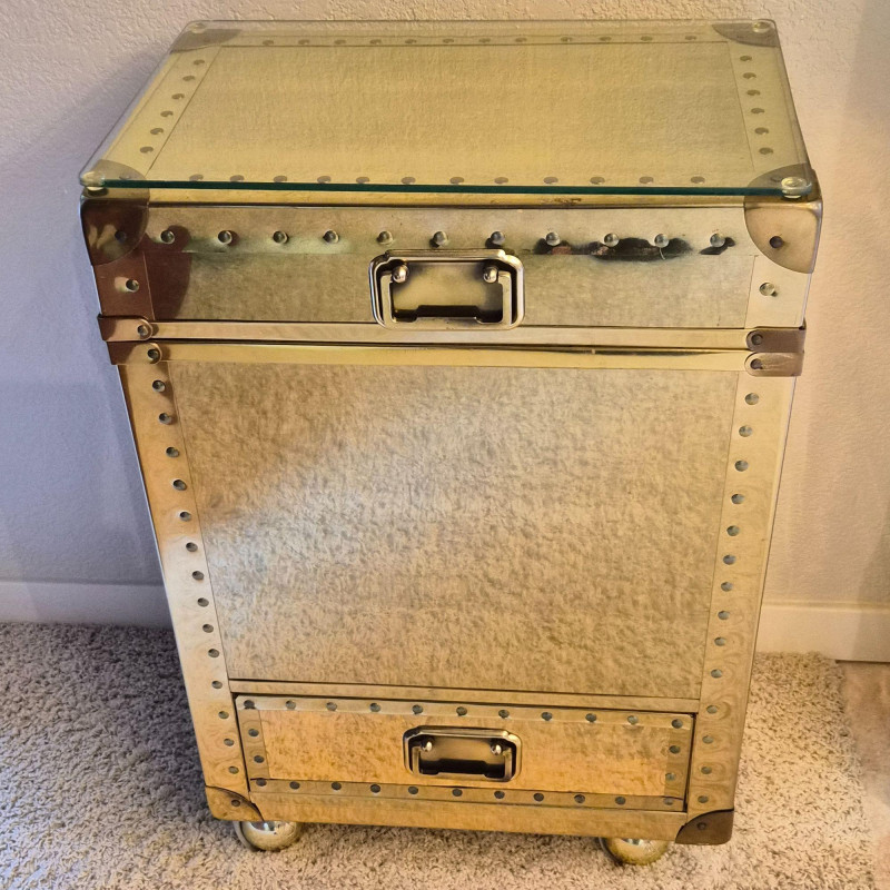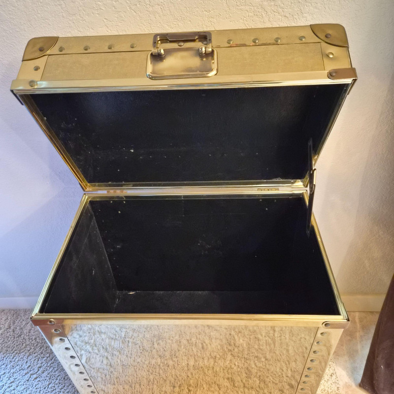 1970s brass-clad storage chest with a distinctive vintage glow and practical design: A stylish accent piece with warm metallic tones—ideal for storing keepsakes, staging in a boho or retro interior, or adding a touch of glam to any room.