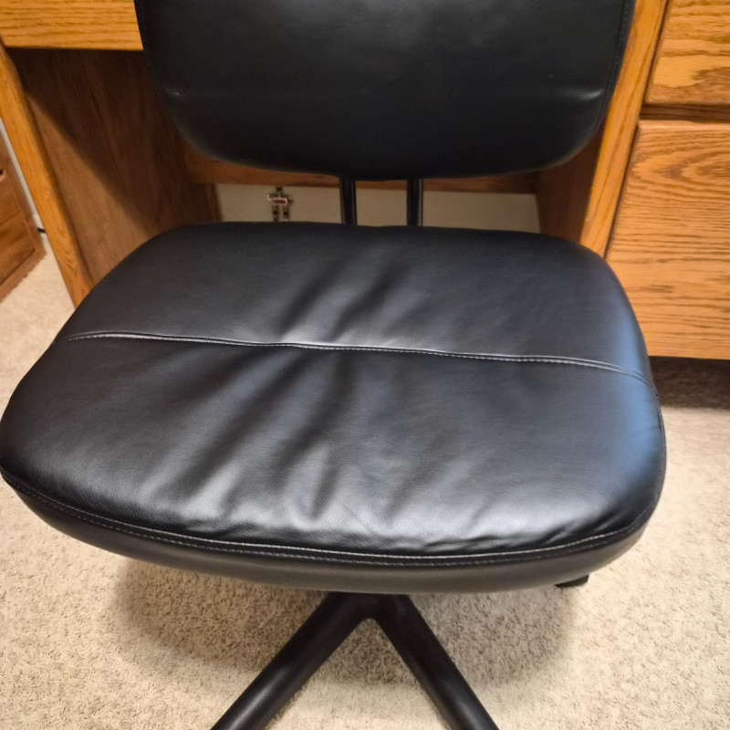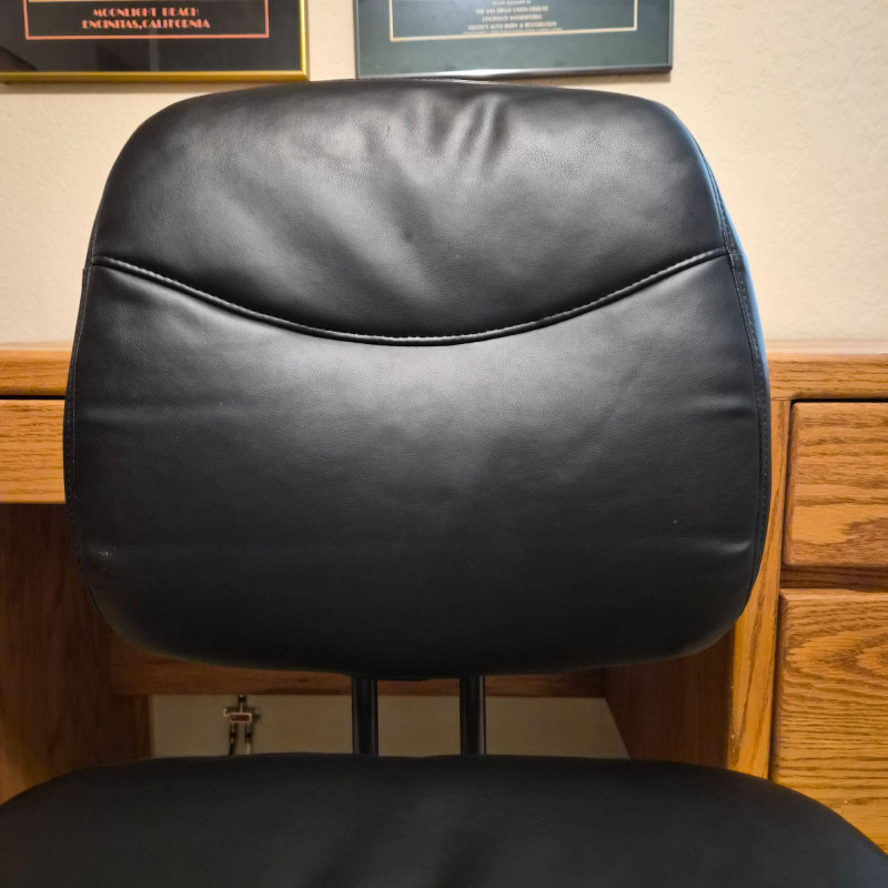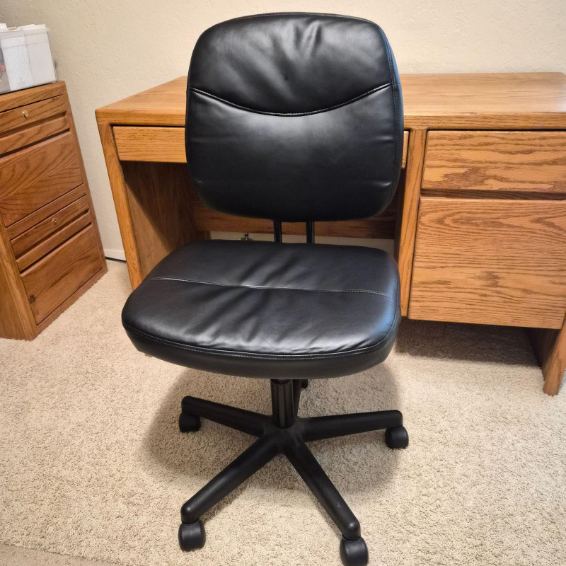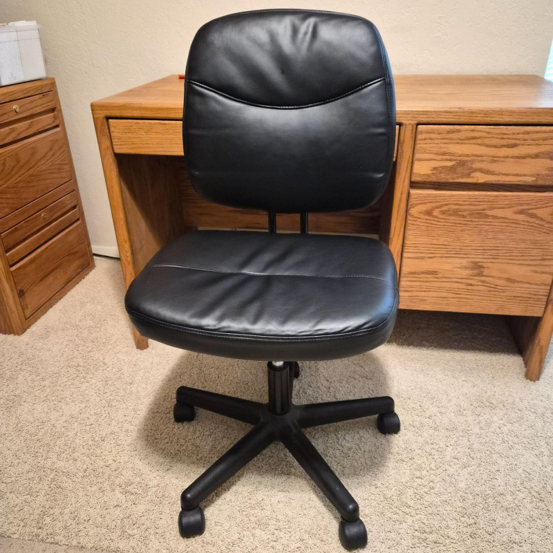 A sleek and functional black faux leather office desk chair by ESS Essentials, model ESS-6005-BLK. With a rolling base and ergonomic design, it offers comfort and mobility for daily work. Dimensions: 26" W (at base with wheels) x 38" H x 20" D. The smooth faux leather finish adds a professional touch, while the padded seat and back provide support for long hours at the desk. Ideal for home offices, studios, or workspace upgrades.