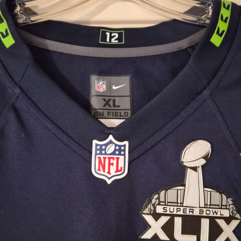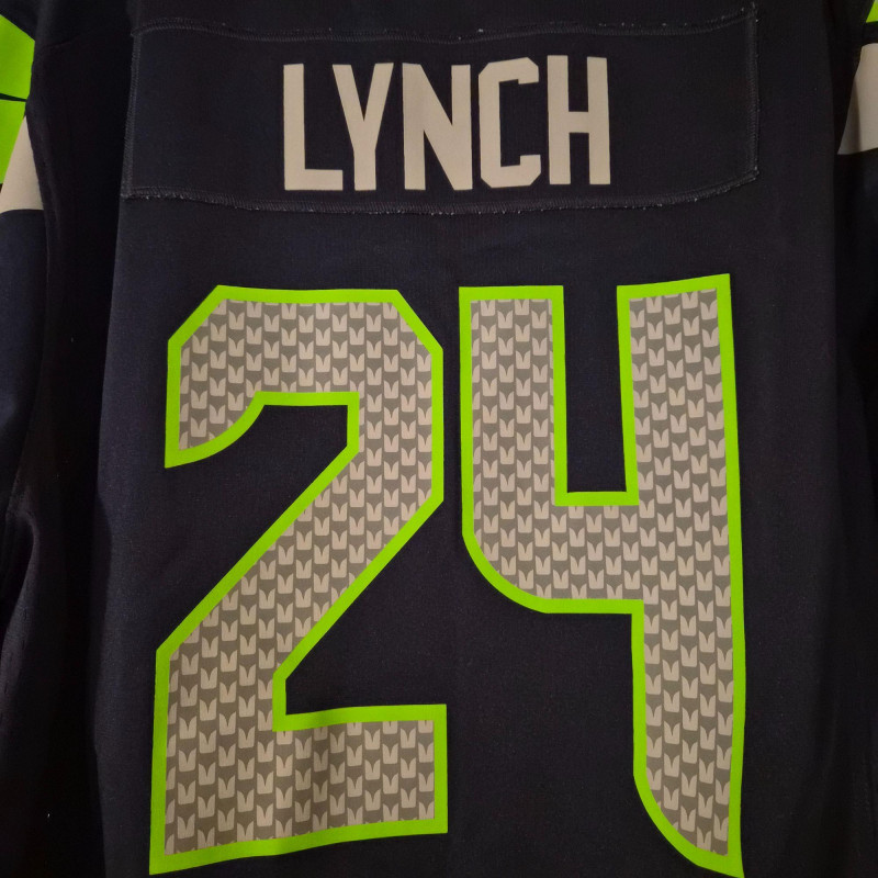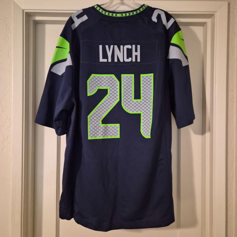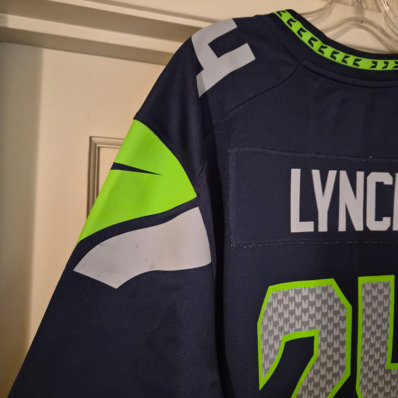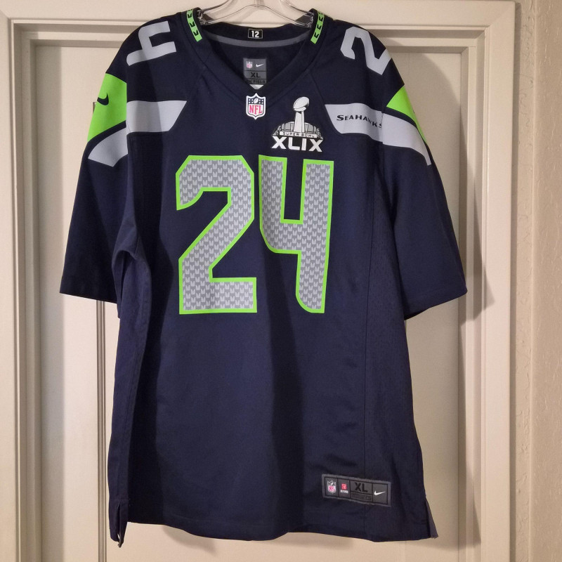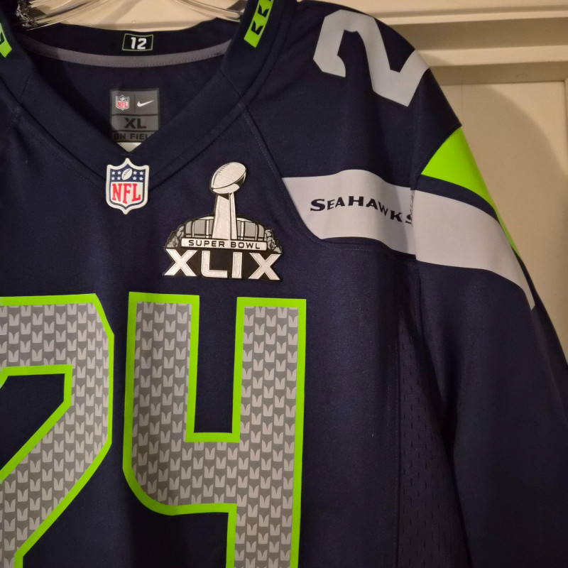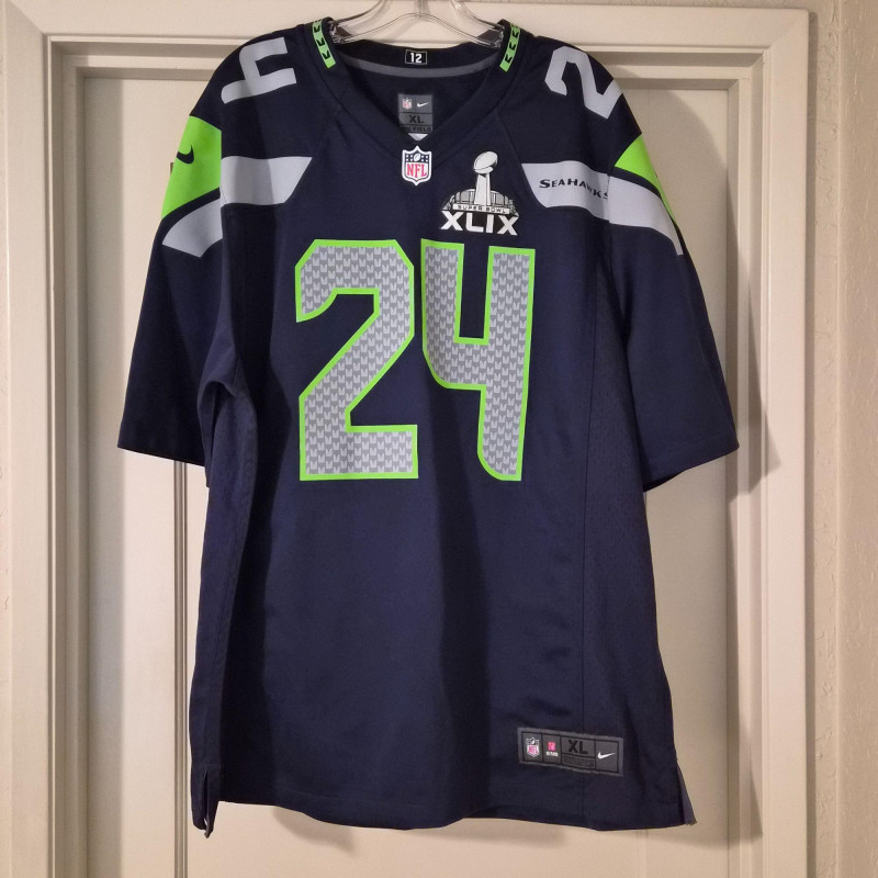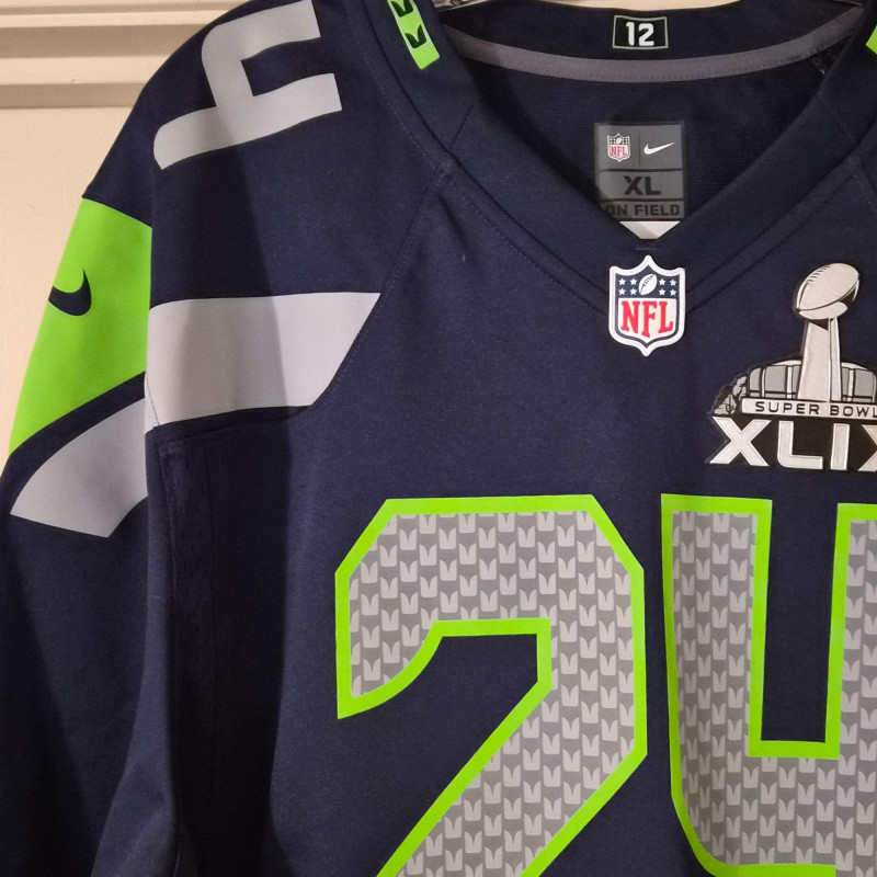 >Official Nike Seattle Seahawks jersey honoring powerhouse running back Marshawn Lynch, #24. This XL jersey commemorates Super Bowl XLIX and showcases the iconic navy, action green, and wolf gray colorway. A must-have for fans of Beast Mode and Seahawks history, it’s perfect for display, wear, or game-day pride. Whether you're reliving the 2015 showdown or celebrating Lynch’s legendary style, this jersey brings the energy.