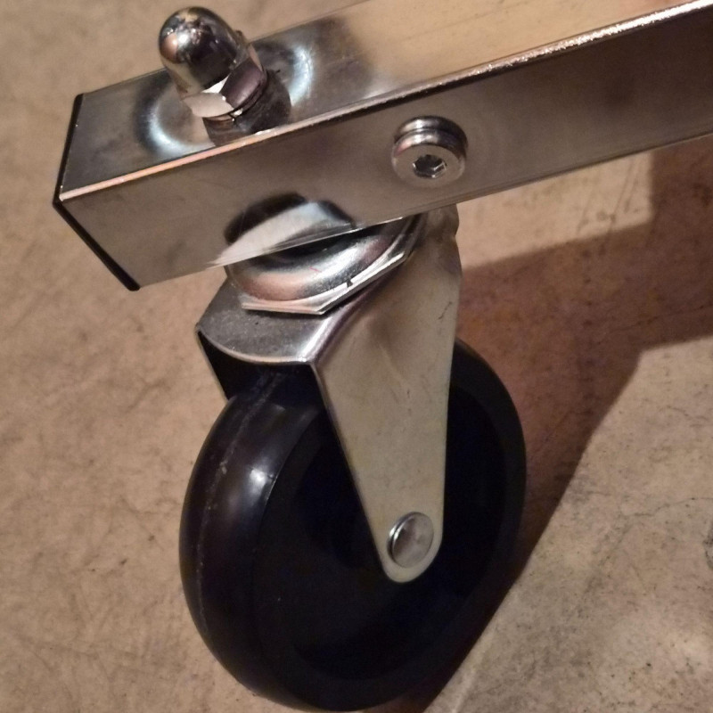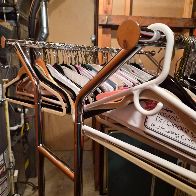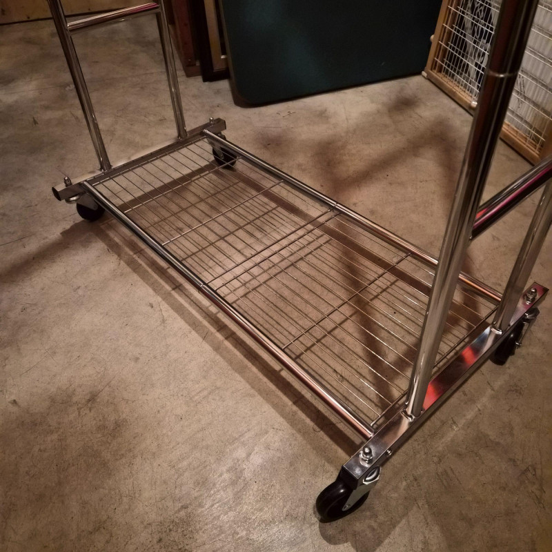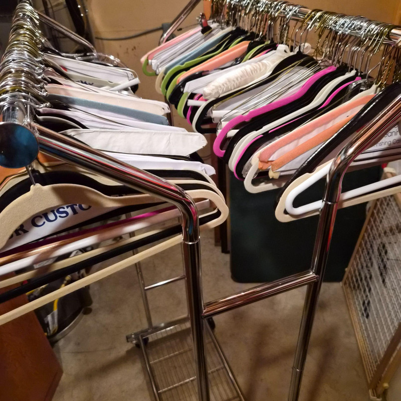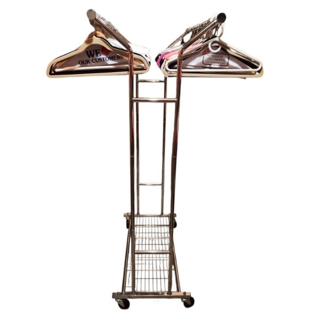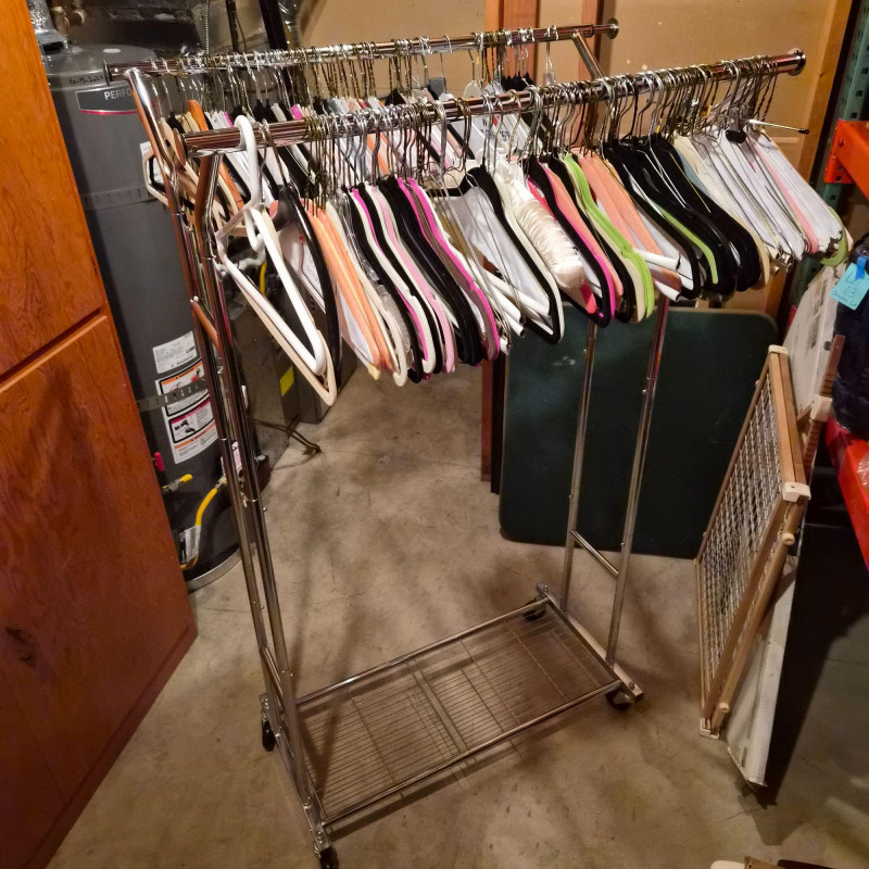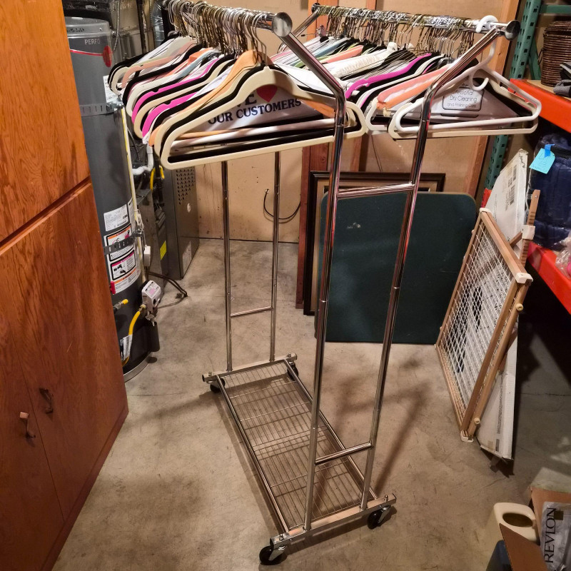 Streamlined and sturdy, this double-sided rolling garment rack is a versatile workhorse for wardrobe organization, retail display, or estate sale staging. Crafted from durable steel with a sleek silver-tone finish, it features adjustable height settings and smooth-gliding casters for effortless mobility. All the hangers are included. Measuring 35" long x 54" tall x 22" deep, it offers ample hanging space on both sides—perfect for showcasing vintage garments, seasonal collections, or everyday essentials with style and ease.