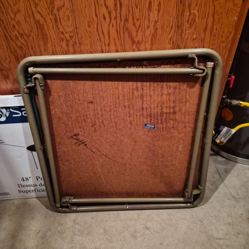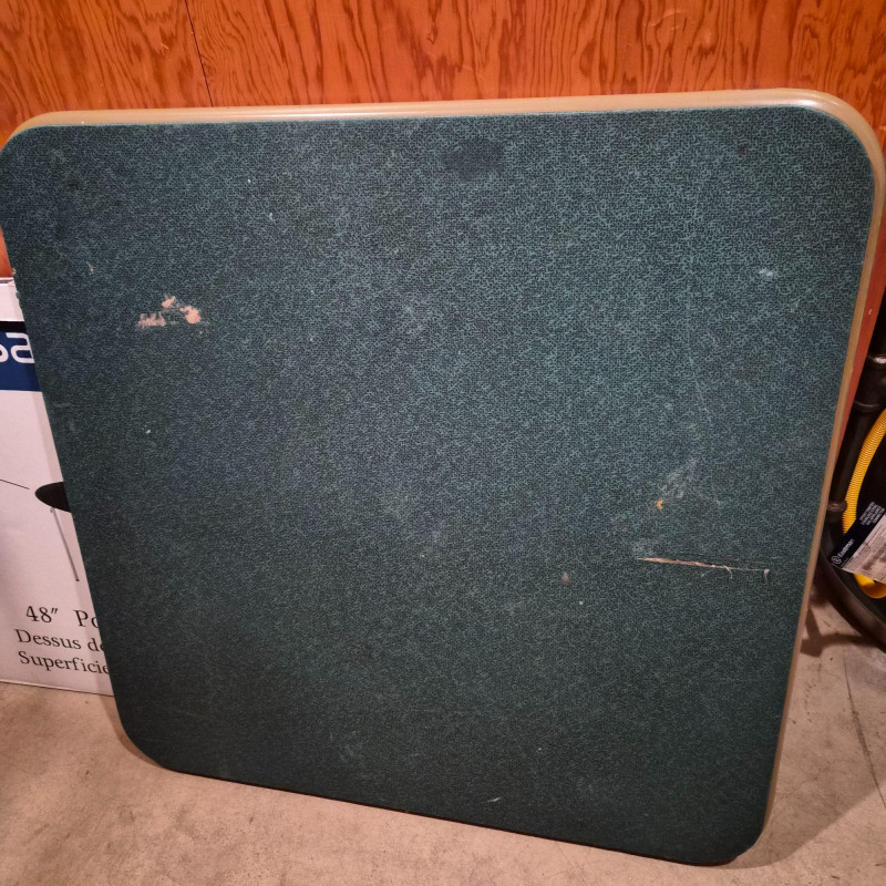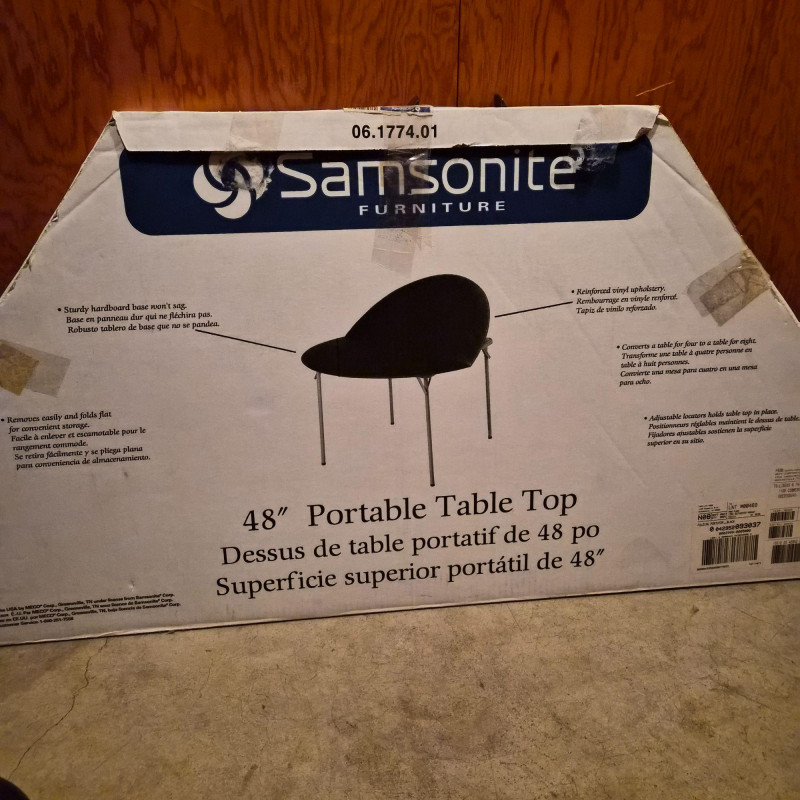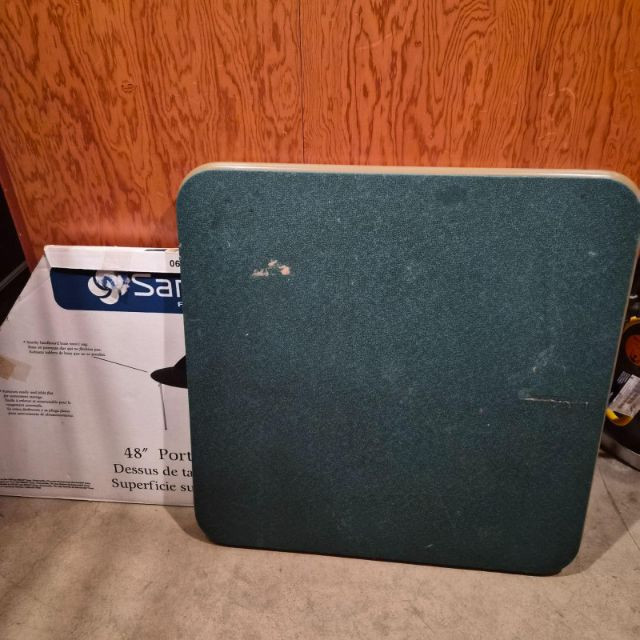 A flexible duo for entertaining, crafting, or pop-up sales: this lot includes a classic 32" x 32" Cosco card table with a sturdy metal frame and a 48" portable Samsonite tabletop. The Cosco table folds easily for storage and features a neutral surface ideal for games, snacks, or sorting estate sale finds. The Samsonite tabletop adds extra workspace wherever you need it—lightweight, durable, and ready to rest on any stable base.