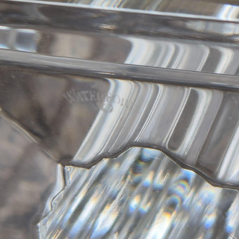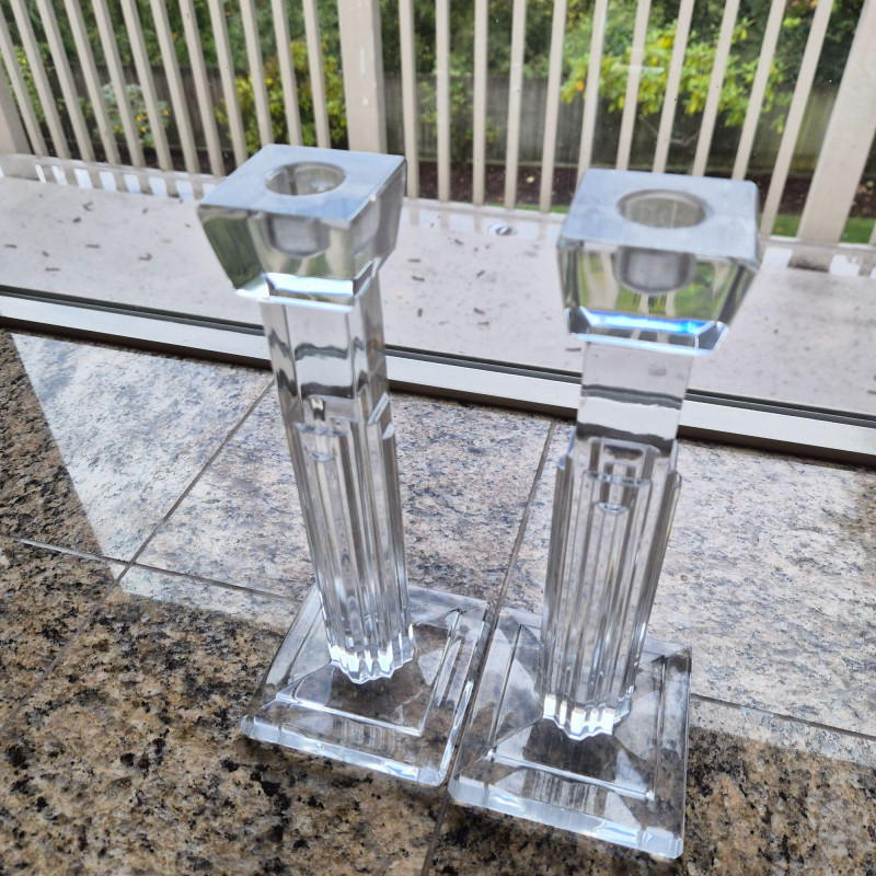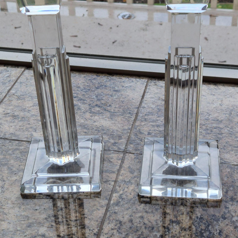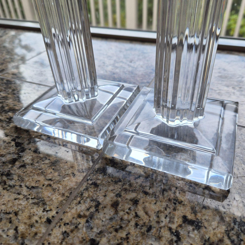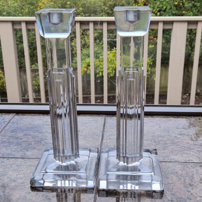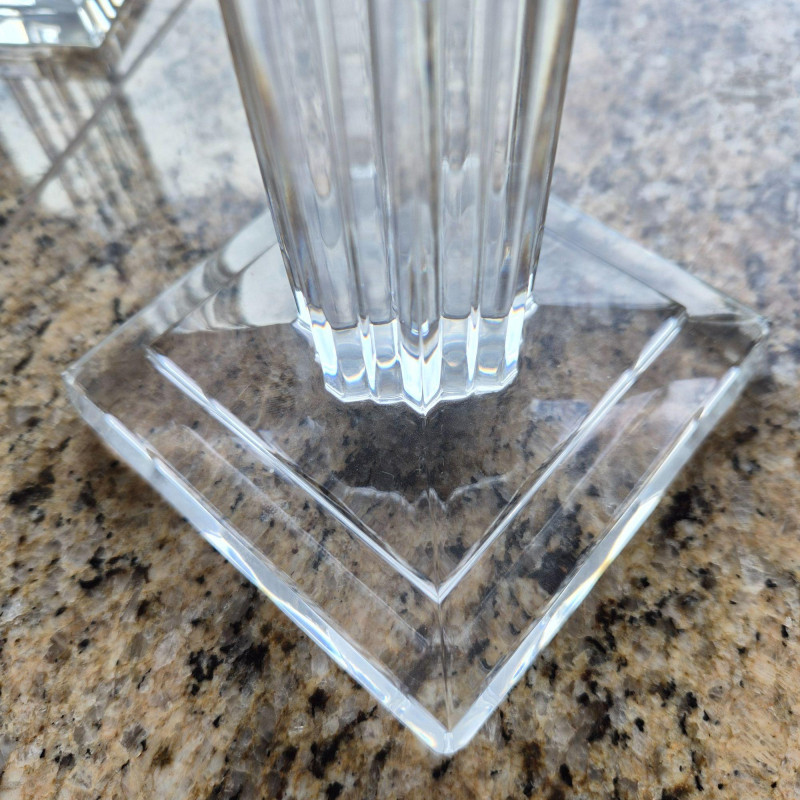 A striking pair of Waterford Metropolitan crystal pillar candlestick holders, each measuring 10" H x 4" W x 4" D. With a bold stepped design inspired by Art Deco architecture, these pieces offer sculptural elegance and radiant clarity. Crafted in fine crystal, they reflect Waterford’s legacy of timeless craftsmanship and modern sophistication. Perfect for formal tablescapes, mantle displays, or collector showcases.