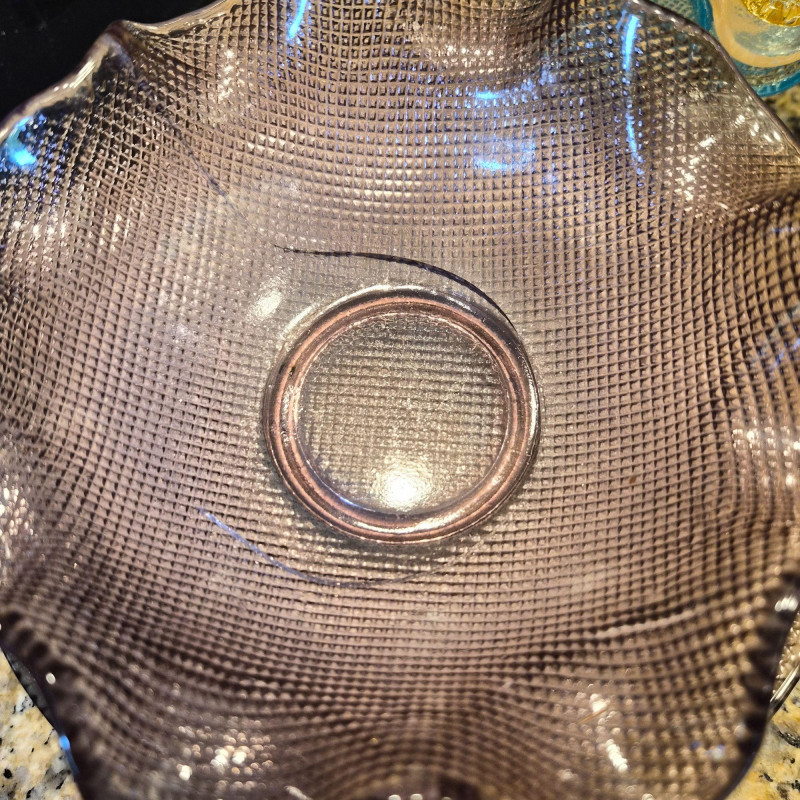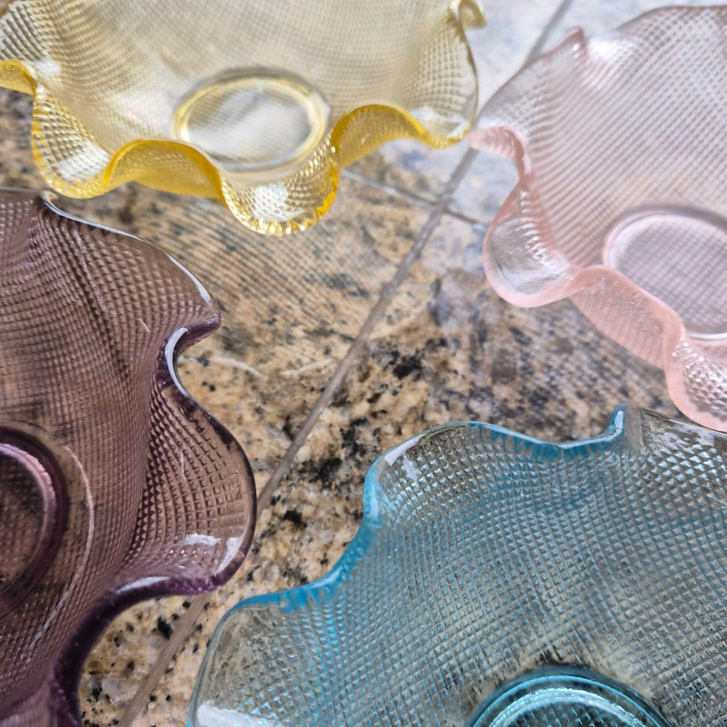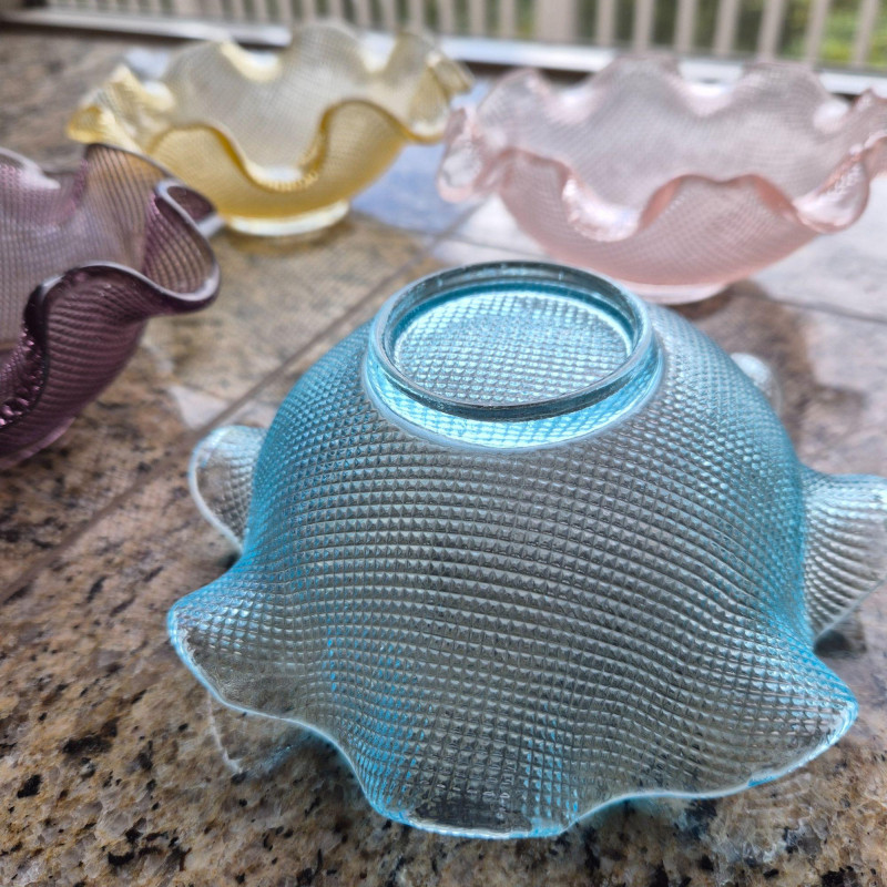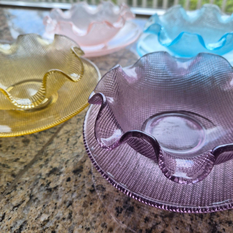 A darling mid-century dessert set with charm to spare. This 1960s vintage waffle glass collection includes scalloped bowls and matching saucer liners in vibrant textured glass. The set features: Each piece showcases the iconic waffle texture and rich color typical of the era—perfect for display, serving, or adding a pop of retro flair to your table. Kept together for their visual harmony and sentimental appeal.