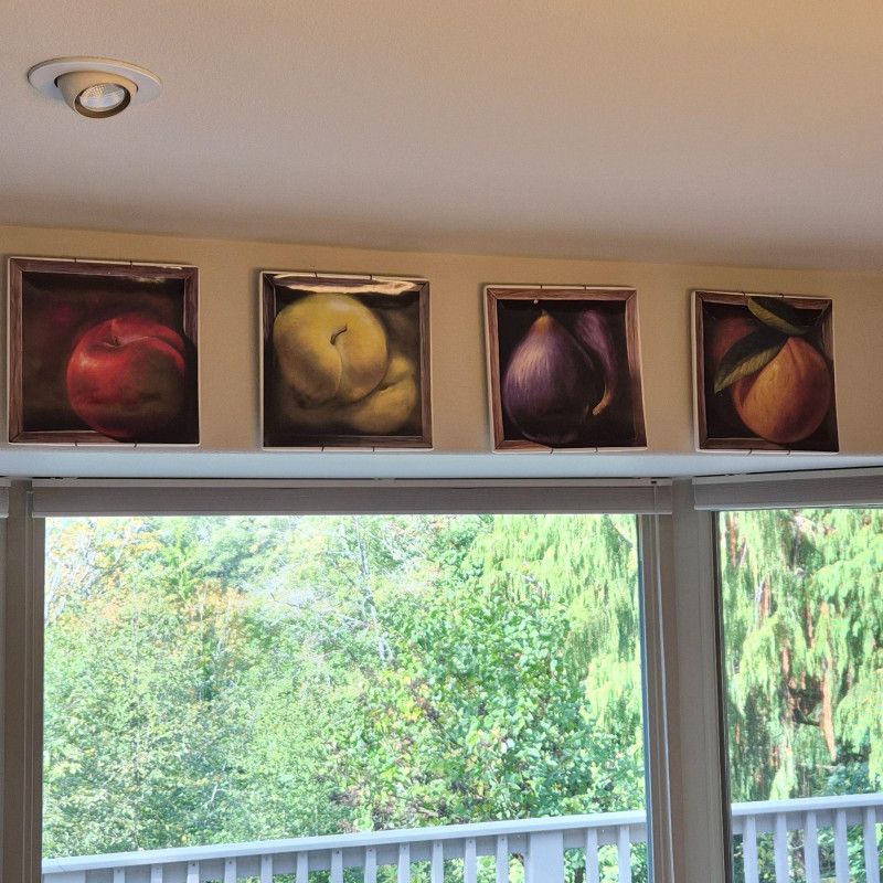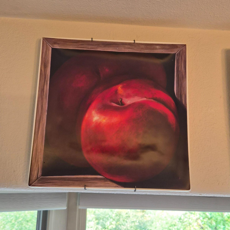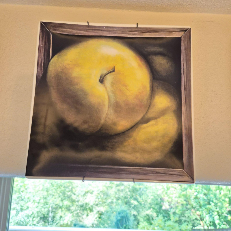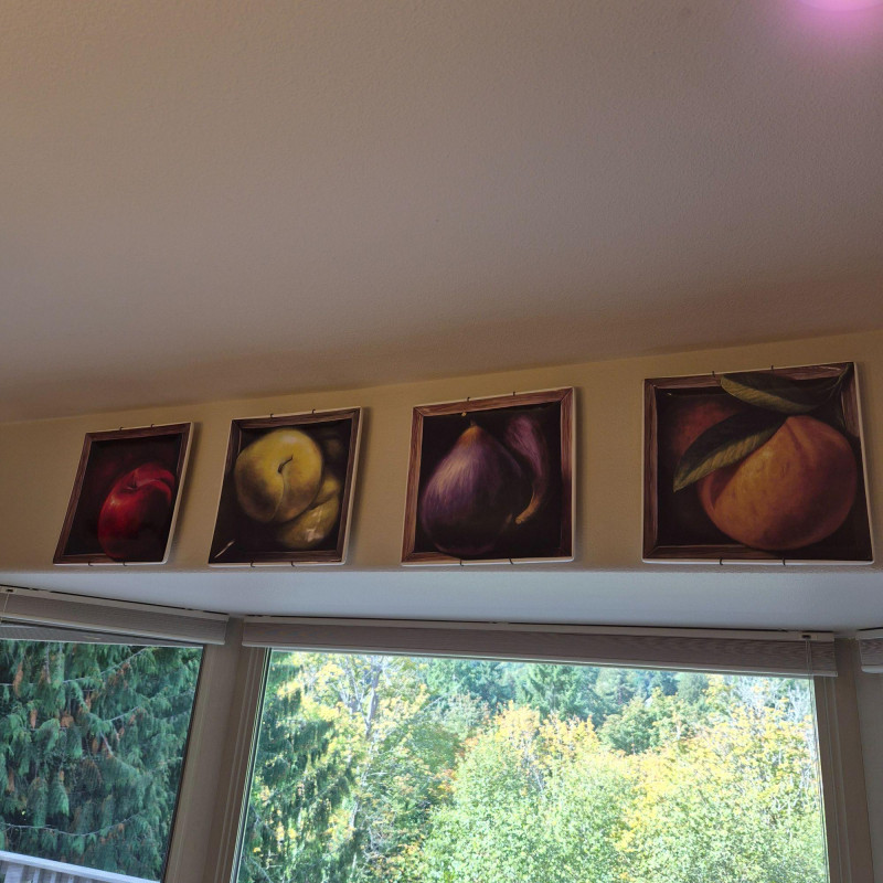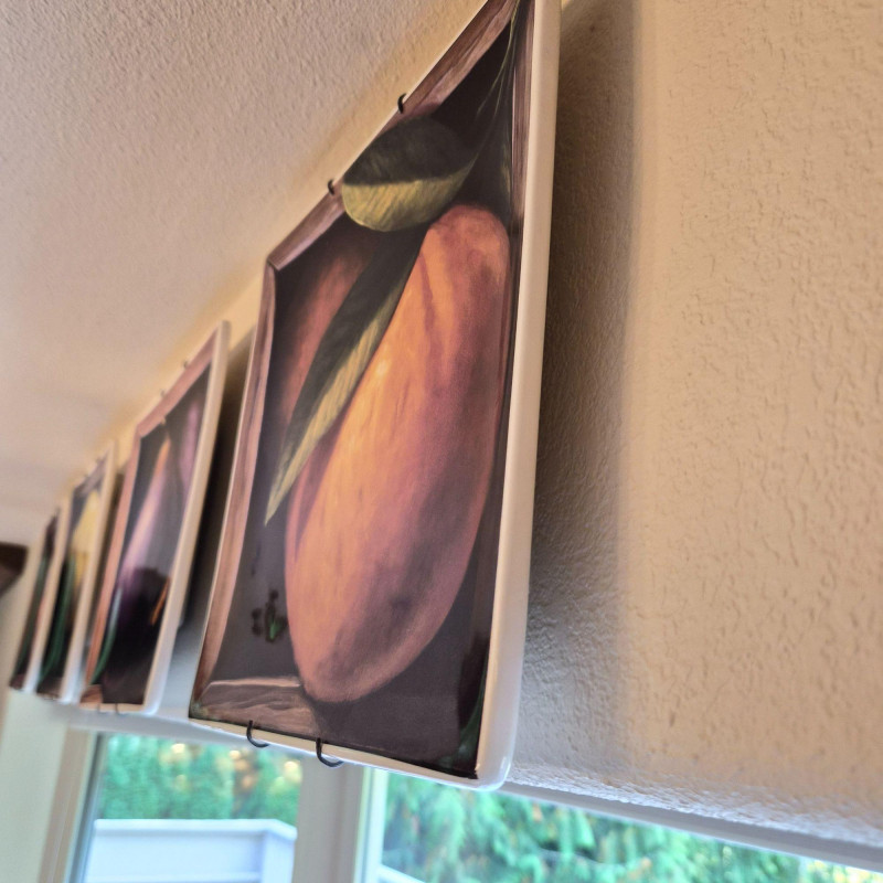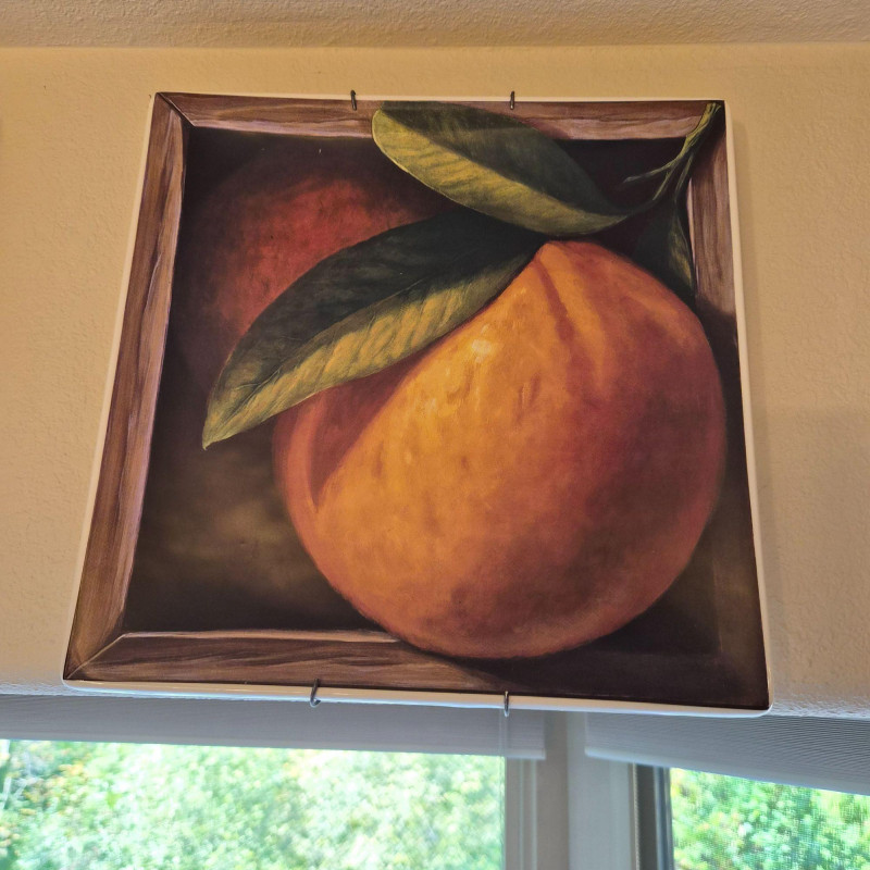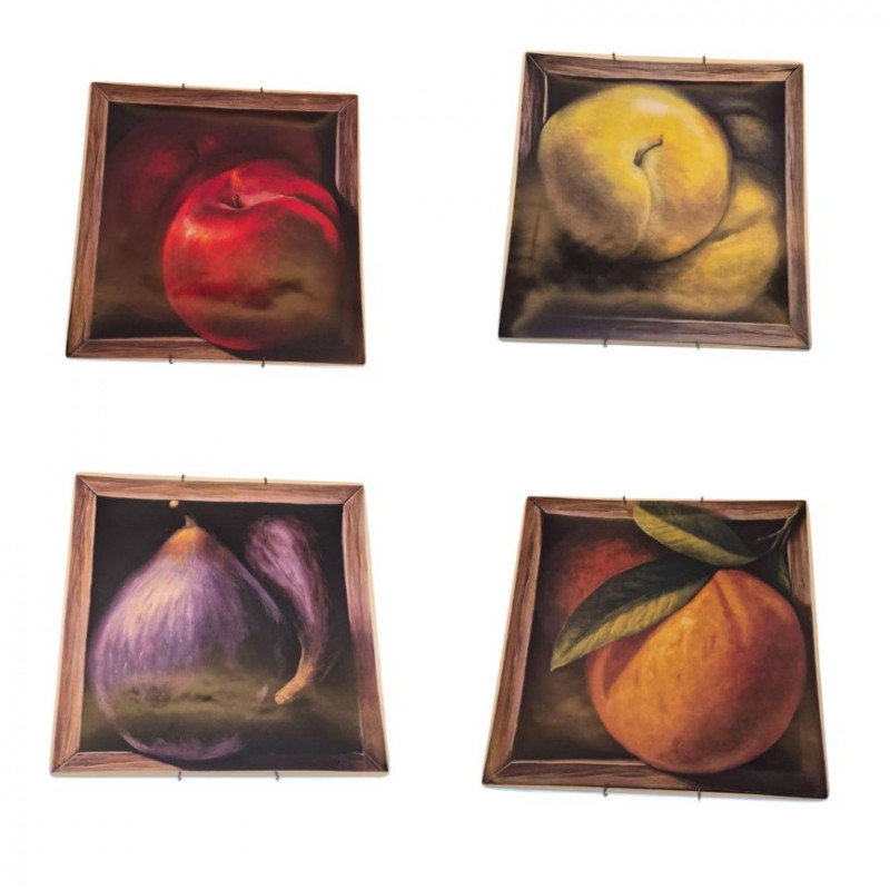 Add a splash of orchard charm to your kitchen or gallery wall with this set of four ceramic fruit plate wall hangers by Jay Mercado (Certified Internatinal). Each 10" x 10" square plaque features hand-painted fruit motifs in vivid, inviting tones—ripe with rustic elegance and artistic flair. Designed for wall mounting, these ceramic pieces offer a cheerful nod to farmhouse style and culinary nostalgia. A delightful blend of art and utility, perfect for collectors or decorators seeking a fresh-picked look.