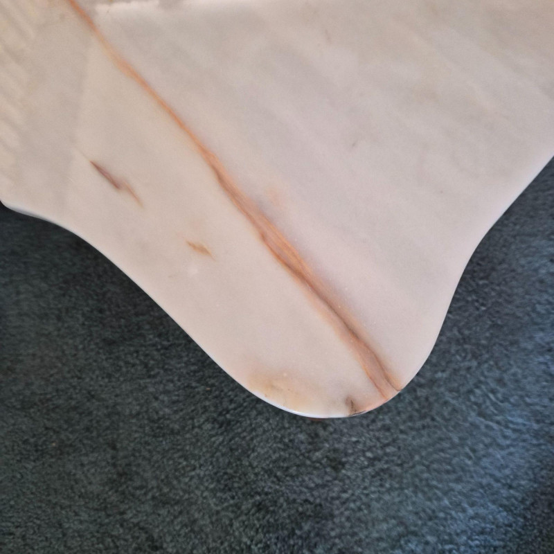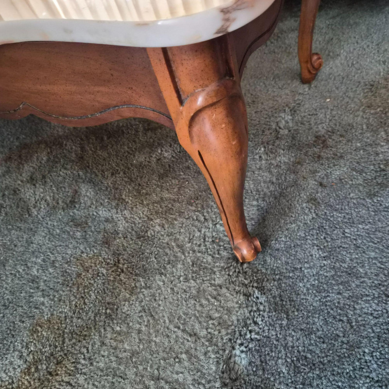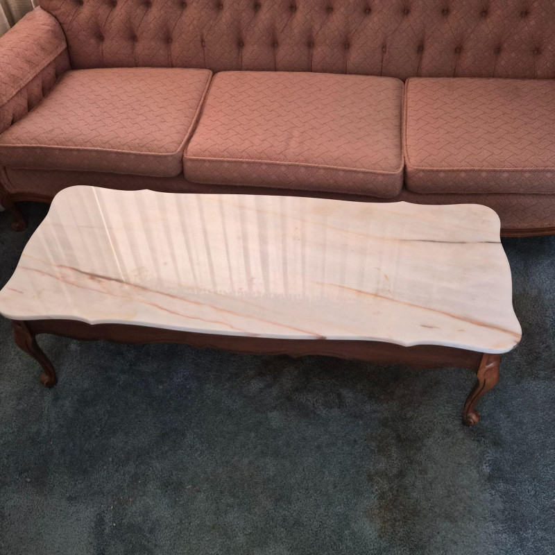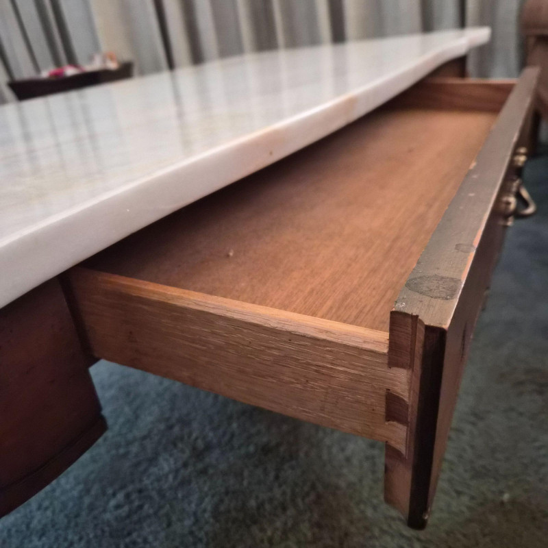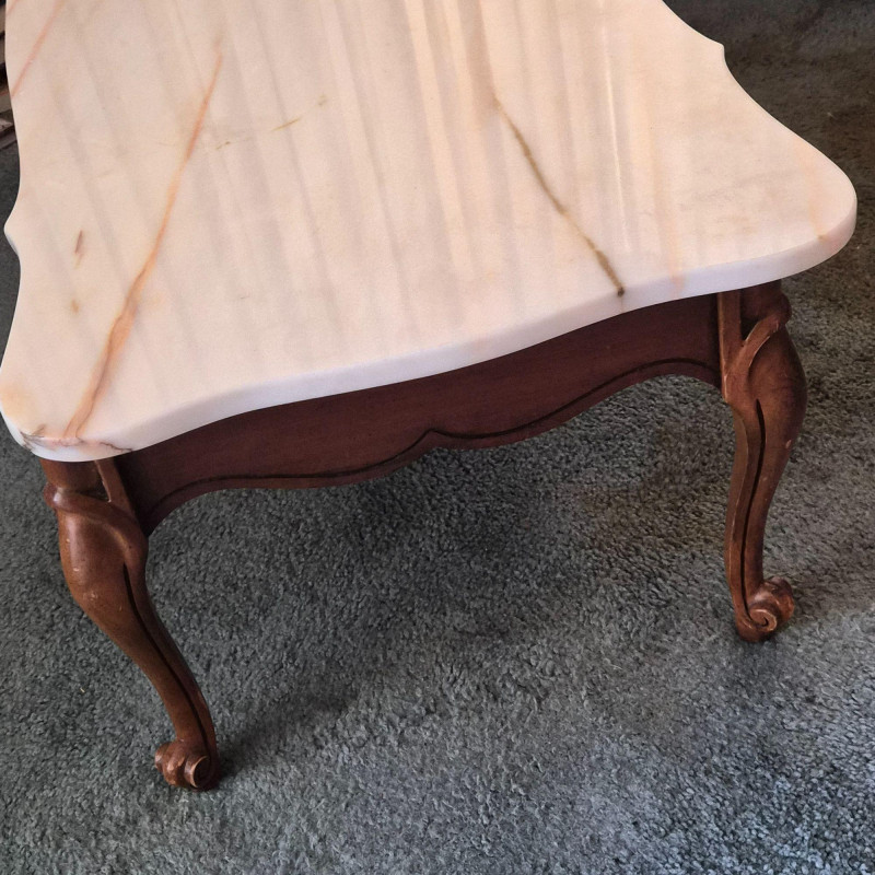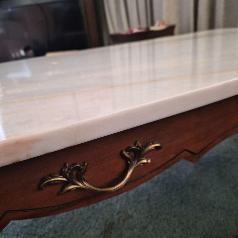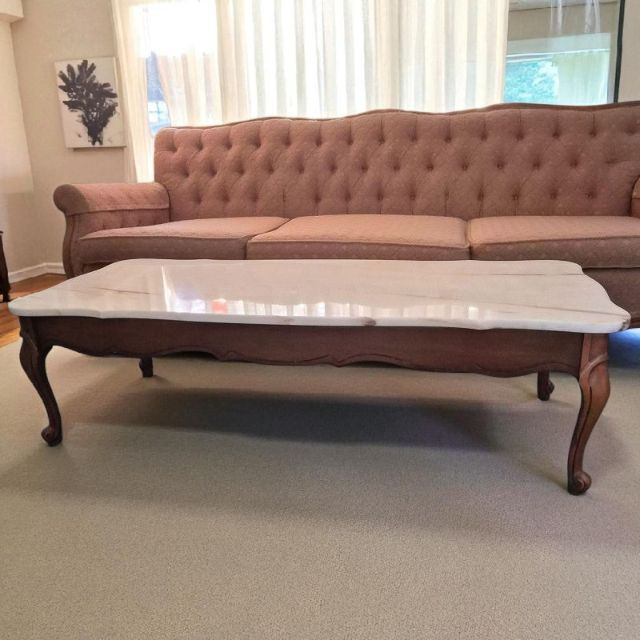 A graceful vintage coffee table in classic French Provincial style, featuring a smooth marble top and elegant carved wood legs with gentle curves. The warm wood base includes a single - dovetailed construction - storage drawer, blending beauty with function. The marble surface adds timeless sophistication, perfect for anchoring a sitting room or adding a touch of European charm to any interior. Due to its size and weight, bidding on this lot confirms agreement to bring at least two or more able-bodied individuals, an appropriate sized moving vehicle (NOTE MEASUREMENTS) and appropriate equipment (e.g., dollie, hand truck) for safe removal. Failure to comply may result in forfeiture without refund. No staff on site to assist with moving this item.