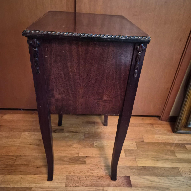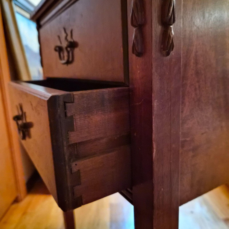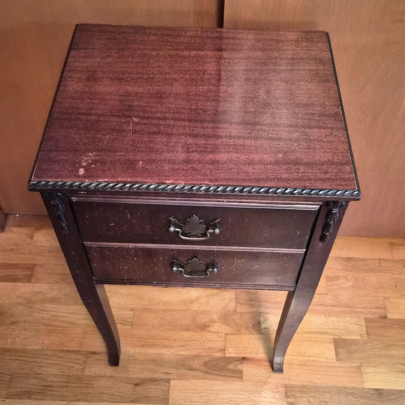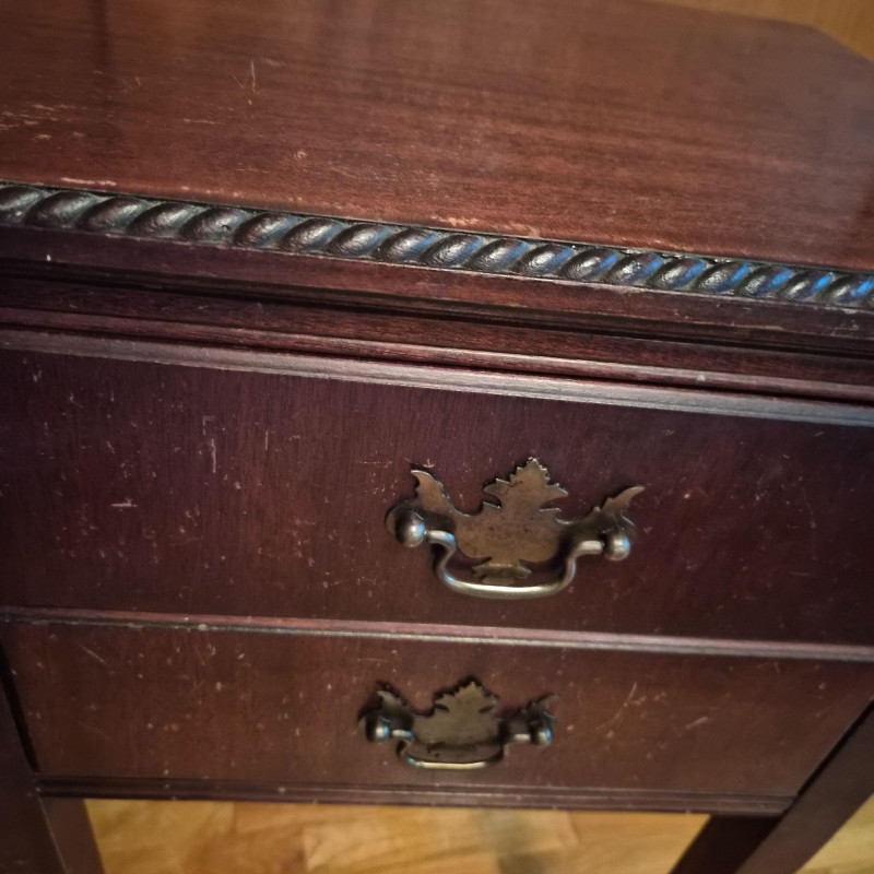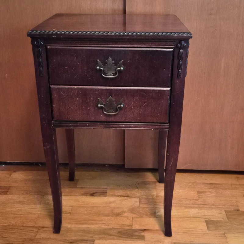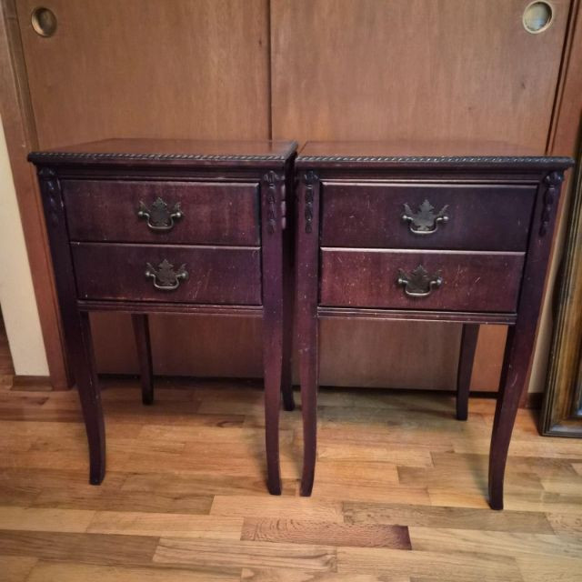A pair of dark wood side tables, built with solid construction and featuring elegant carved trim and dovetailed drawers—hallmarks of quality craftsmanship. Each table is accented with brass hardware and two drawers, offering timeless utility with vintage charm. Perfect for collectors, decorators, or anyone seeking vintage furniture with character and restoration potential.