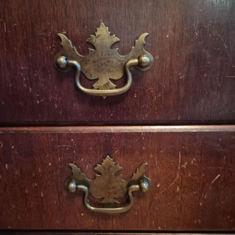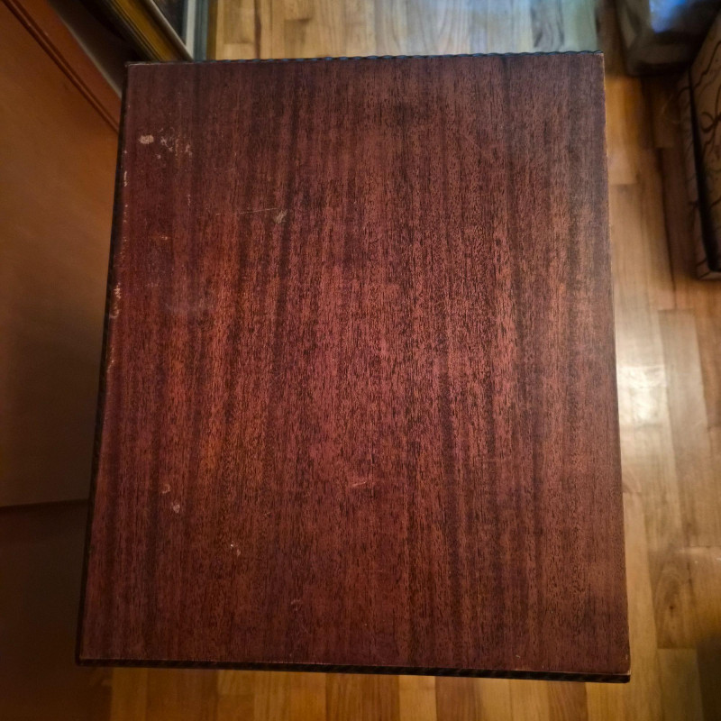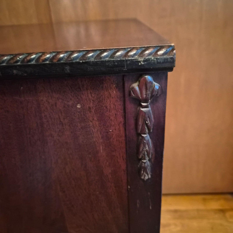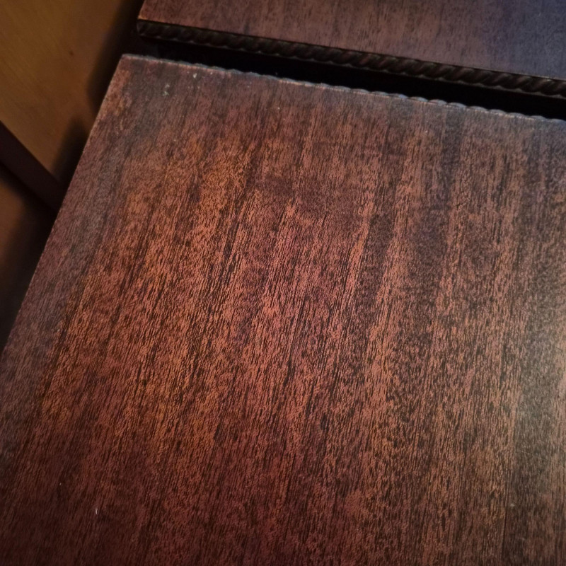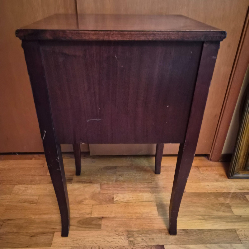 A pair of dark wood side tables, built with solid construction and featuring elegant carved trim and dovetailed drawers—hallmarks of quality craftsmanship. Each table is accented with brass hardware and two drawers, offering timeless utility with vintage charm. Perfect for collectors, decorators, or anyone seeking vintage furniture with character and restoration potential.
