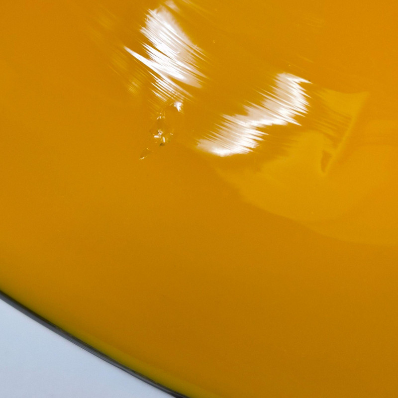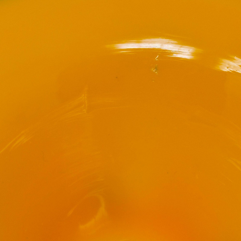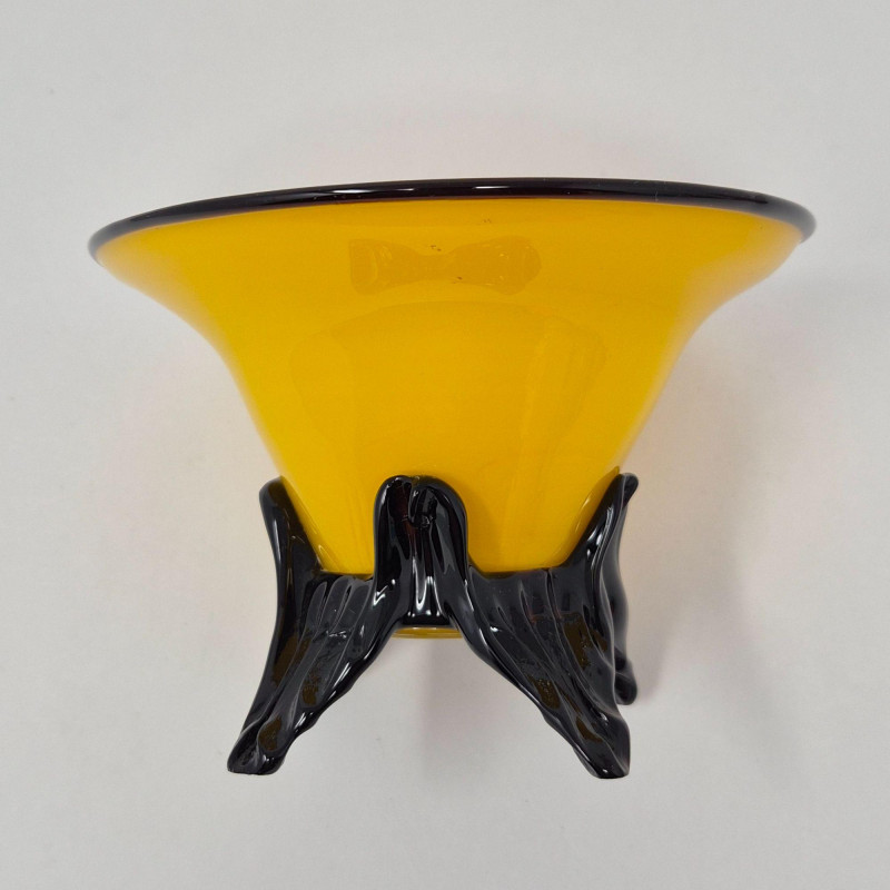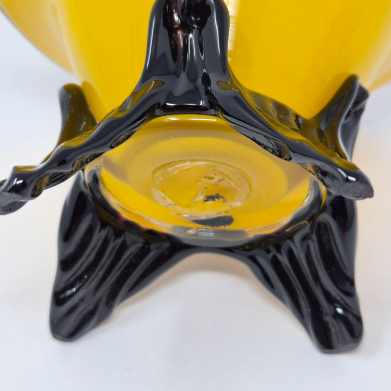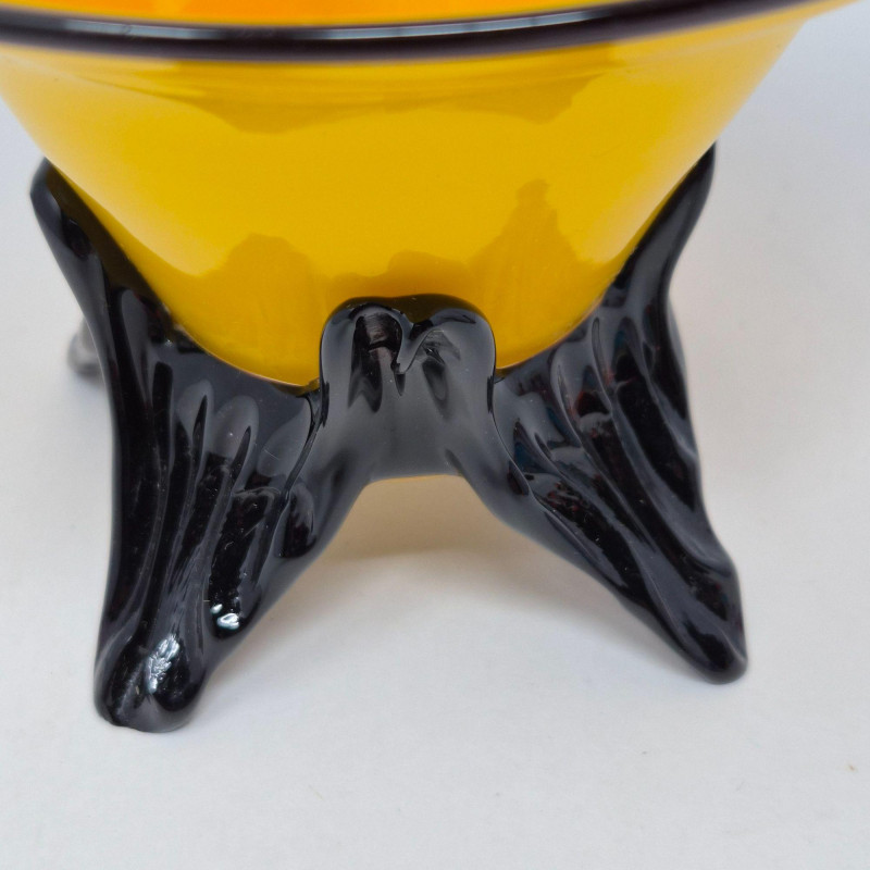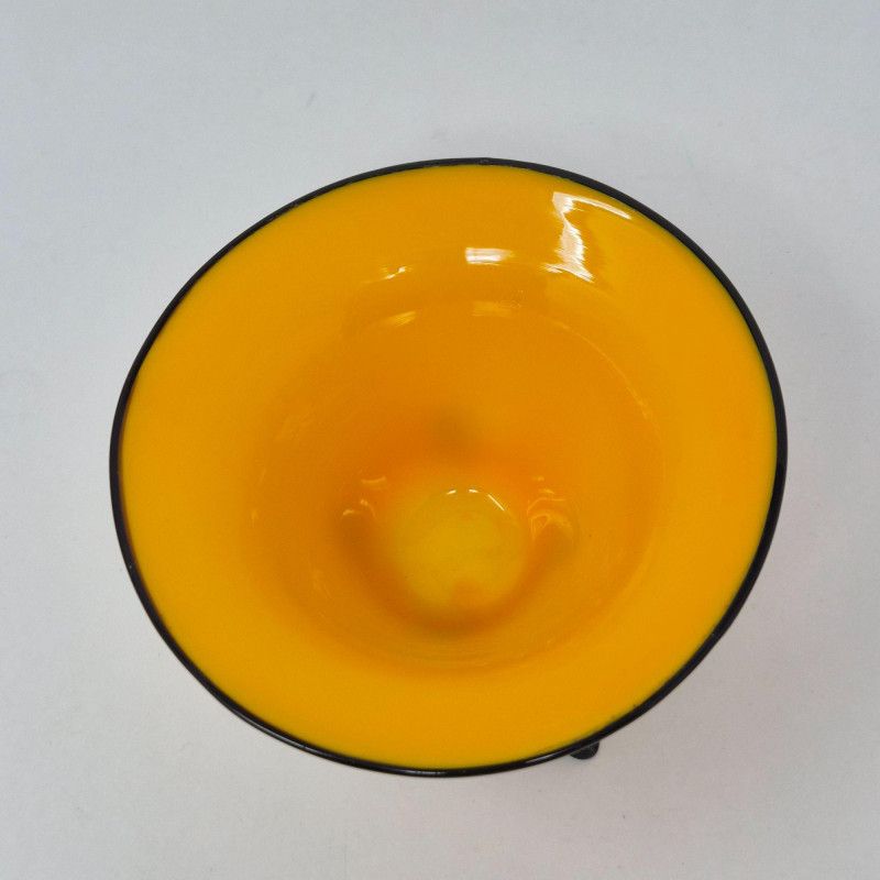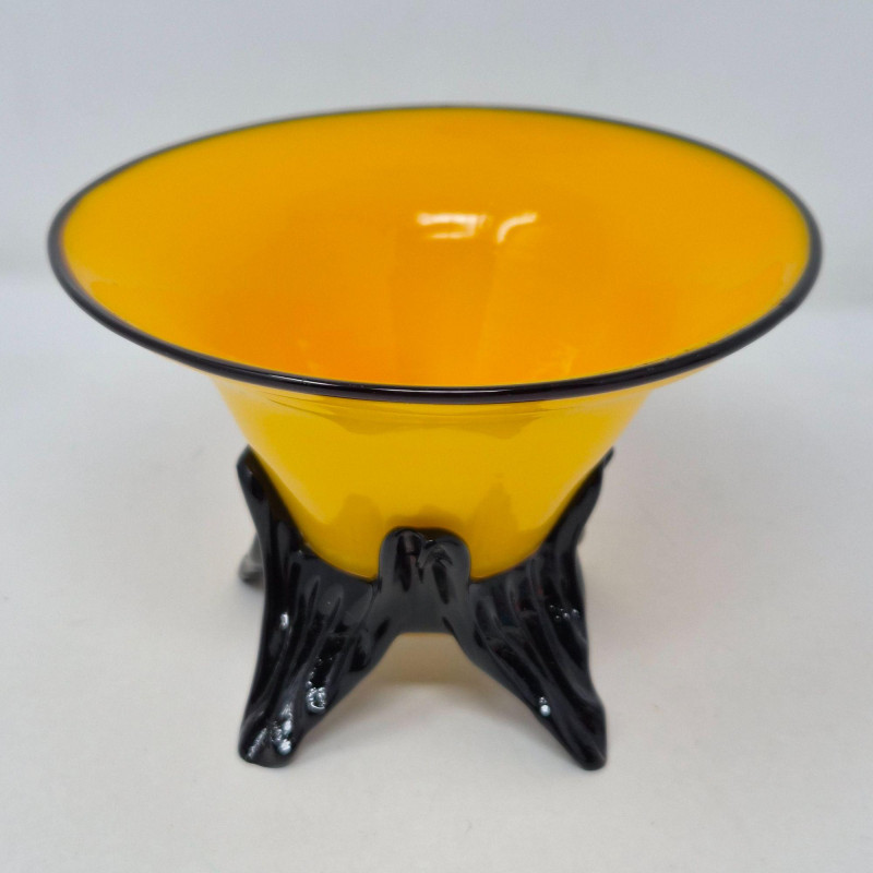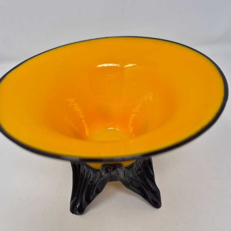 A vibrant Loetz-style footed glass vessel in the iconic Tango tradition, known for bold color and striking form. Measuring 5" wide, 5" deep, and 3.5" tall, this compact piece features a sculptural silhouette with rich coloration and classic Art Deco flair. A small interior “flea bite” knick is present—possibly a production flaw—adding character without compromising display appeal. Ideal for collectors of Bohemian glass, Art Deco design, or Loetz-inspired artistry.