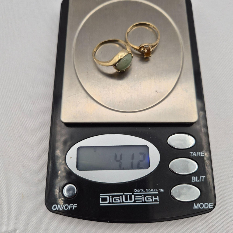 A radiant pair of 10k gold rings, each showcasing a distinct gemstone and elegant design: Together, these rings weigh 4.1 grams.