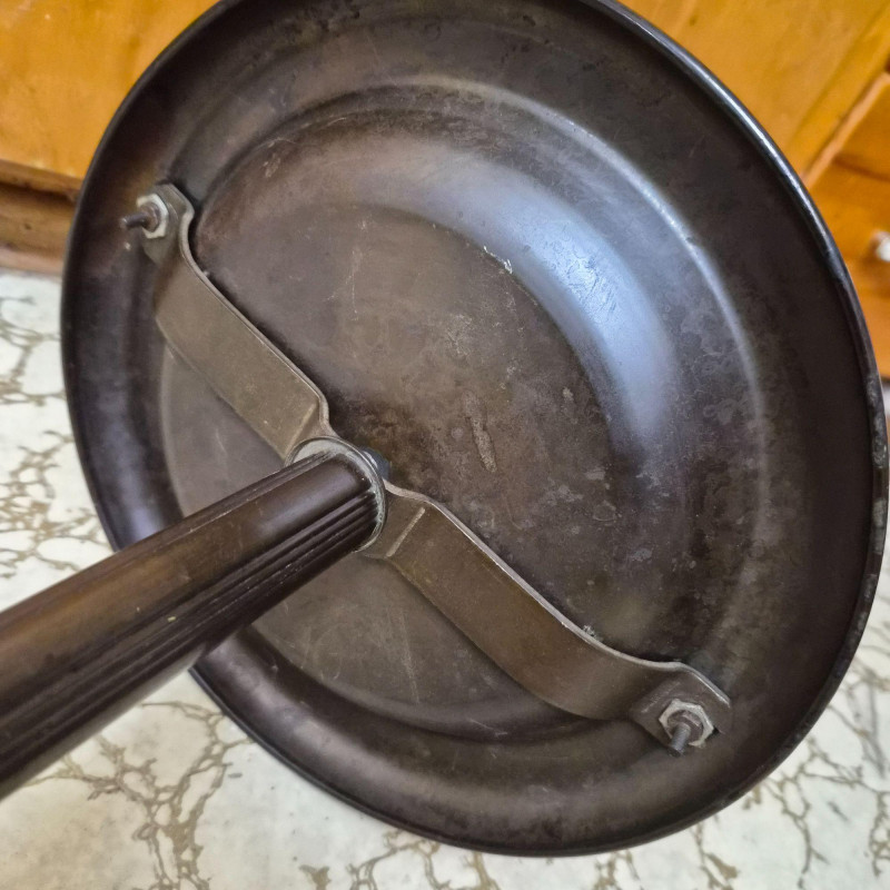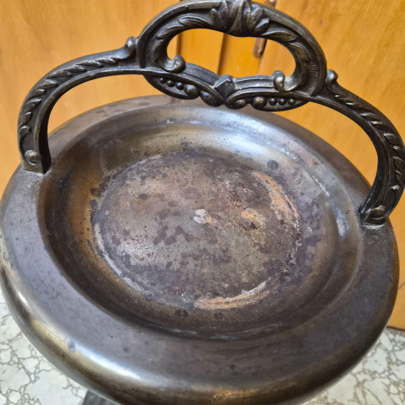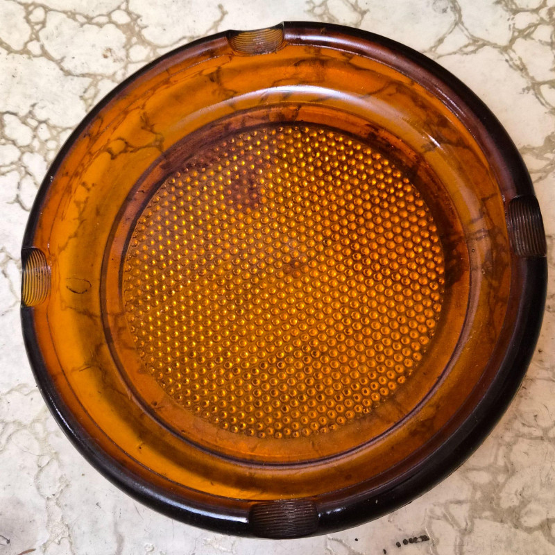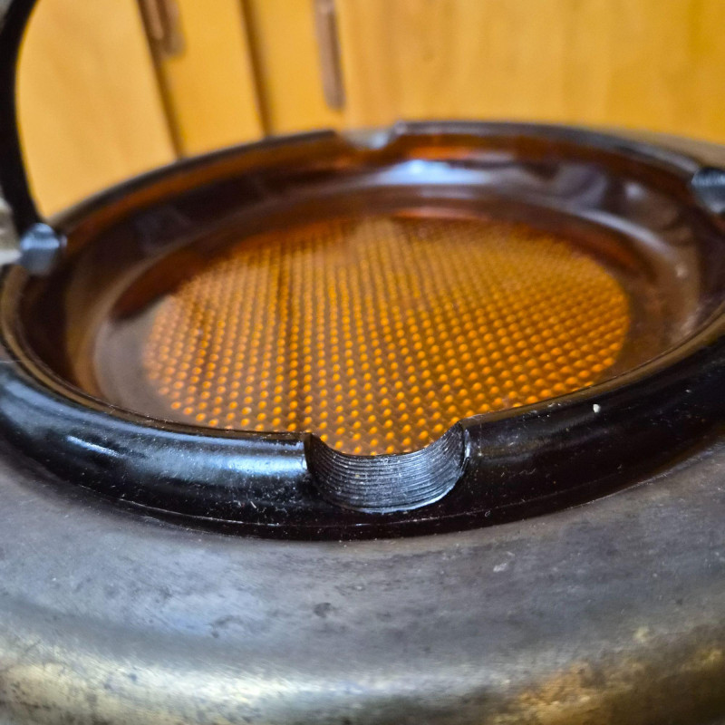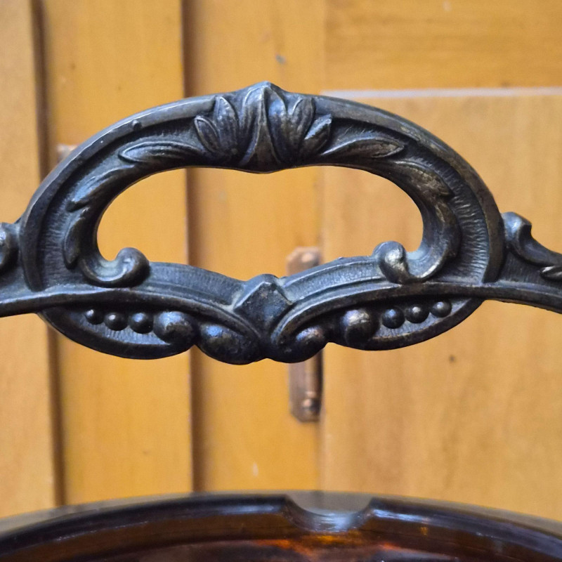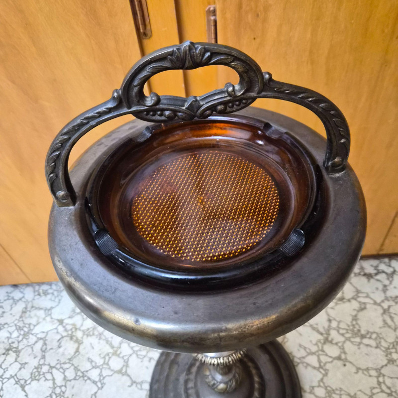A striking 1940s brass stand featuring a warm amber glass ashtray, blending sculptural elegance with mid-century charm. Standing 28" tall and 12" wide, this piece evokes the era’s refined leisure and decorative flair. Brass shows nice, aged patina. The amber glass bowl nestles securely within the brass frame, offering a rich glow and vintage appeal. Whether used as a statement accent, catchall, or nostalgic collectible, it’s a timeless nod to cocktail culture and classic interiors.