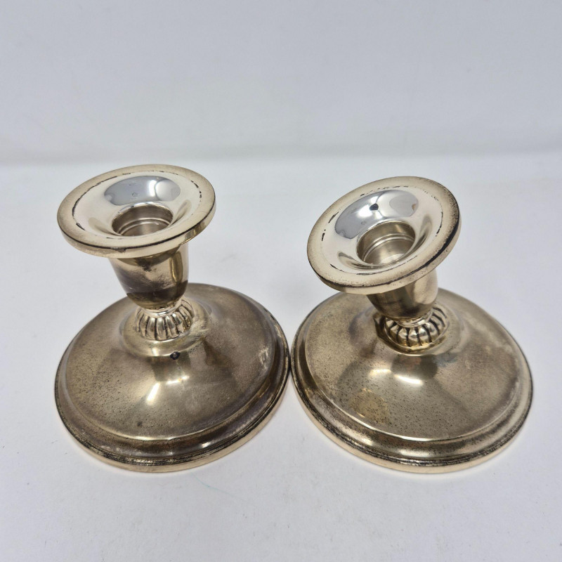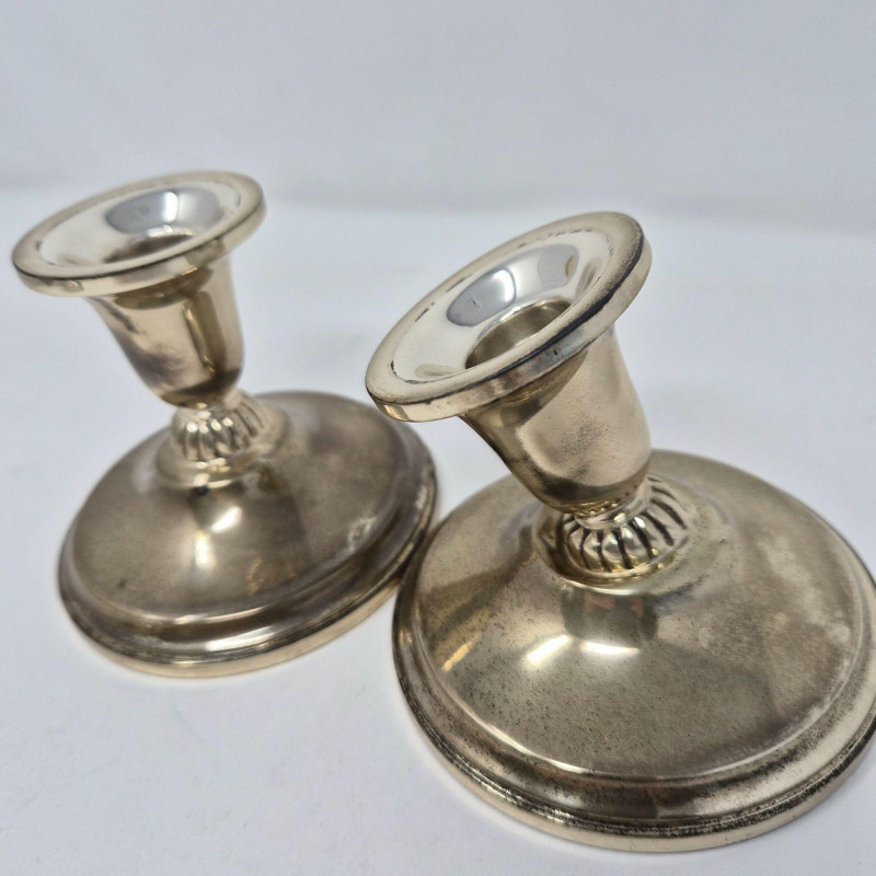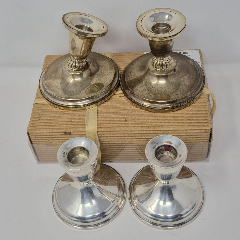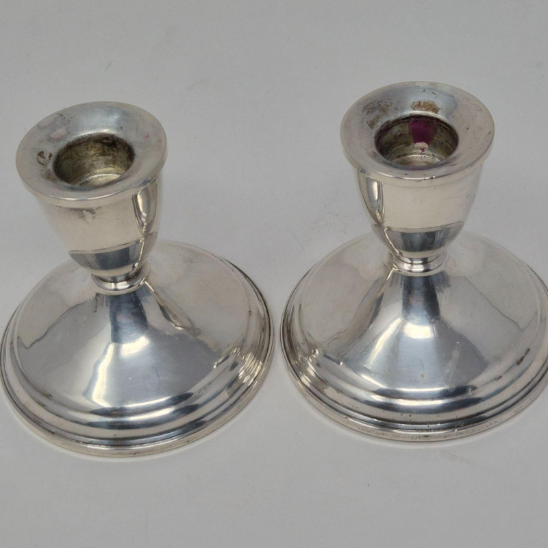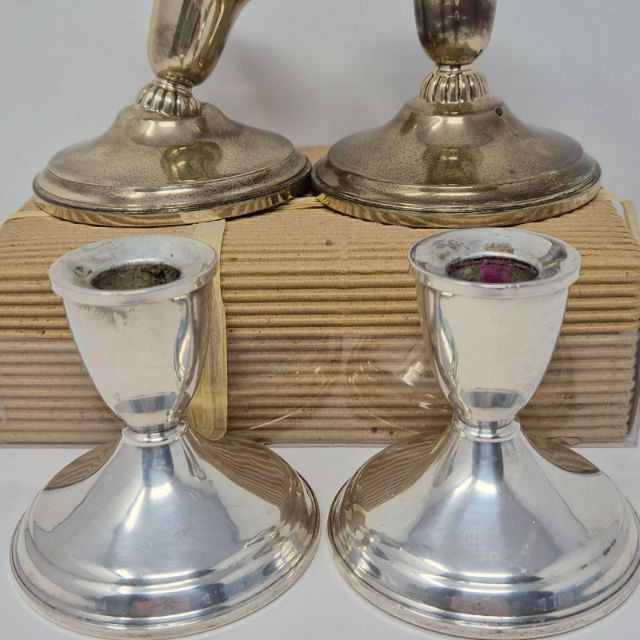 Two sets of 3.5" tall sterling weighted candlestick holders, each offering vintage charm and silver value: Both sets show natural patina consistent with age. Whether polished for shine or kept as-is for authenticity, these candlesticks offer versatility for display, use, or silver salvage
