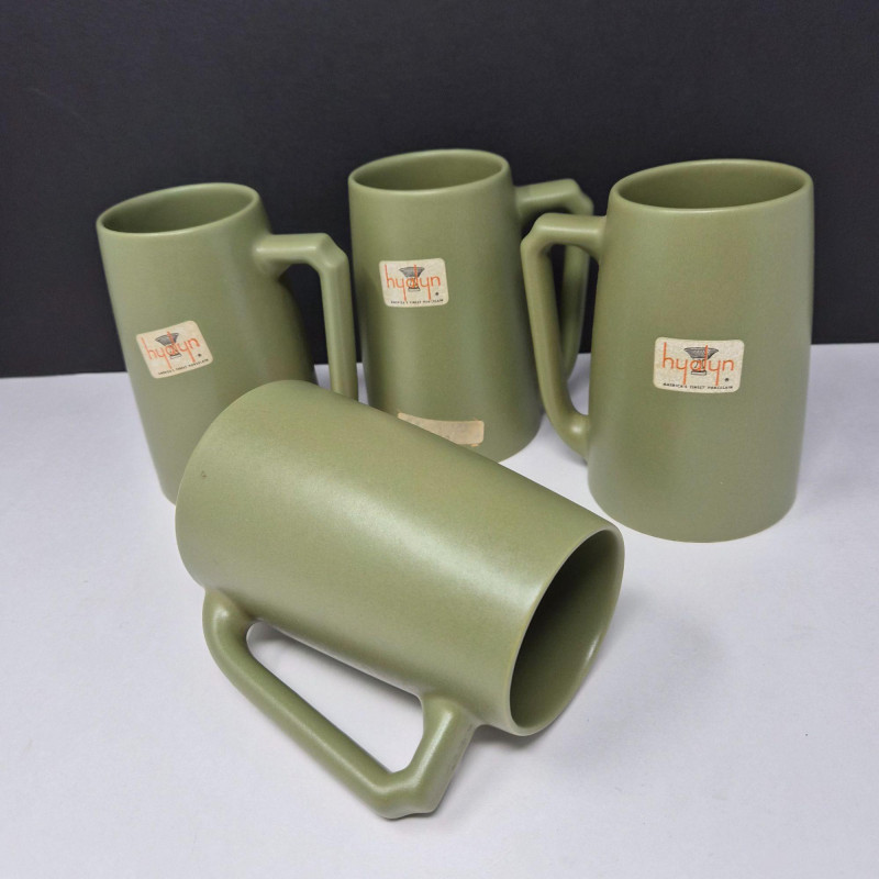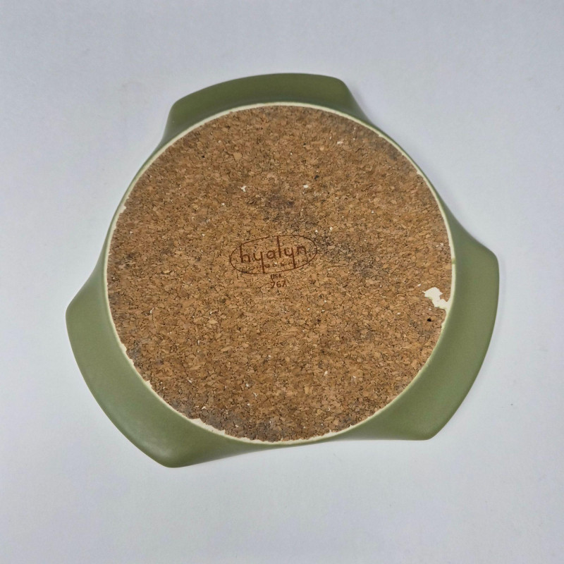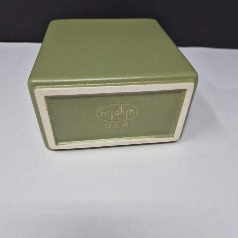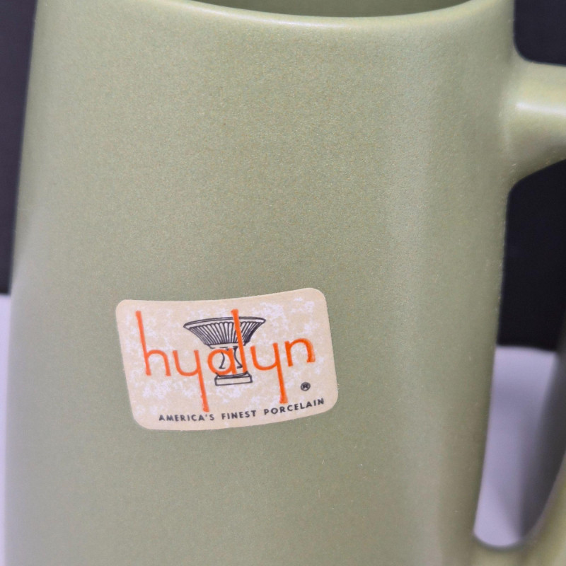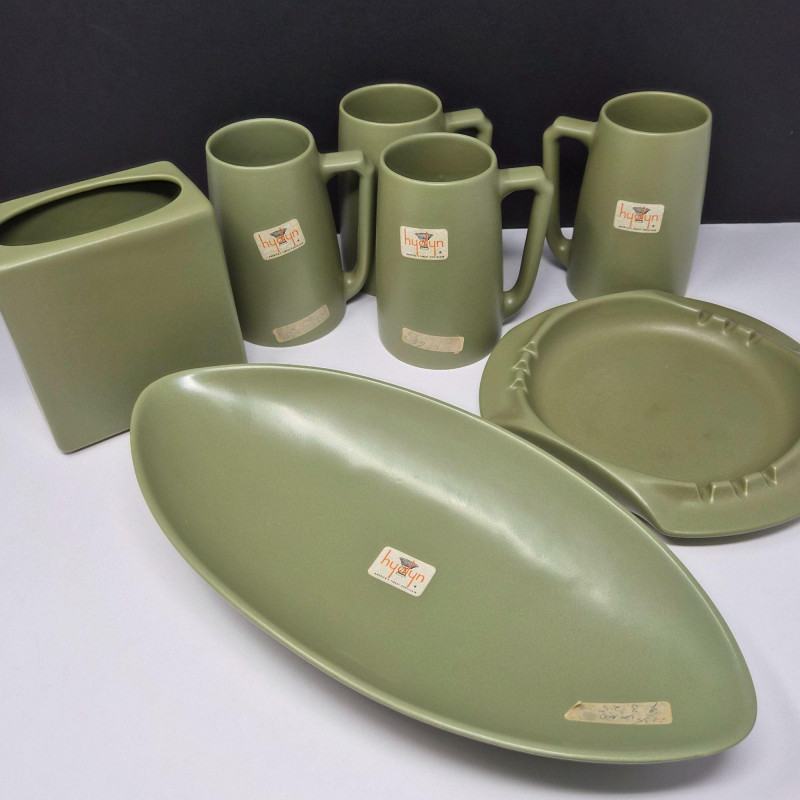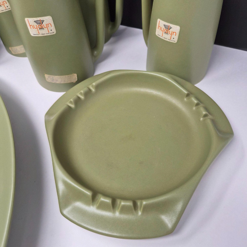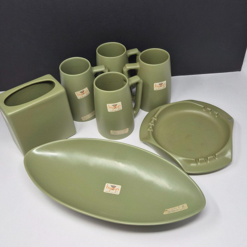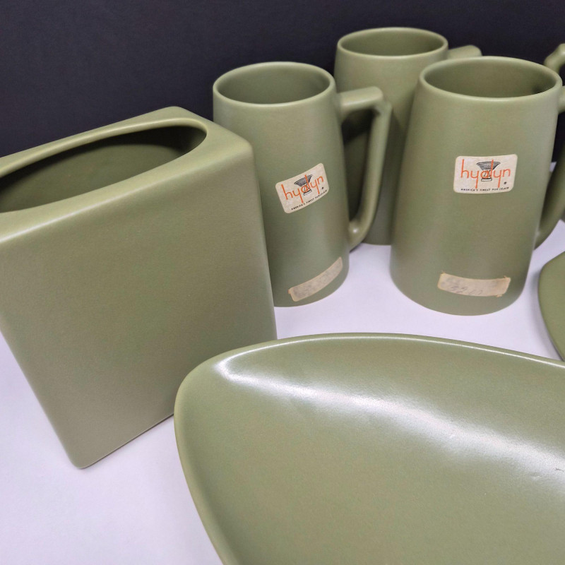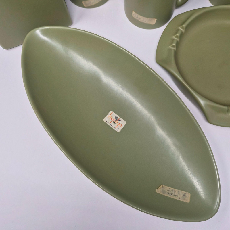 A cohesive set of seven mid-century Hyalyn USA fine porcelain pieces in a smooth, soft sage green glaze, showcasing clean lines and mid-century form: Known for its modernist silhouettes and subtle color palette, Hyalyn porcelain was produced in North Carolina and favored by designers for its understated elegance. This set offers a harmonious mix of function and form—perfect for collectors, stylists, or lovers of American studio ceramics.
