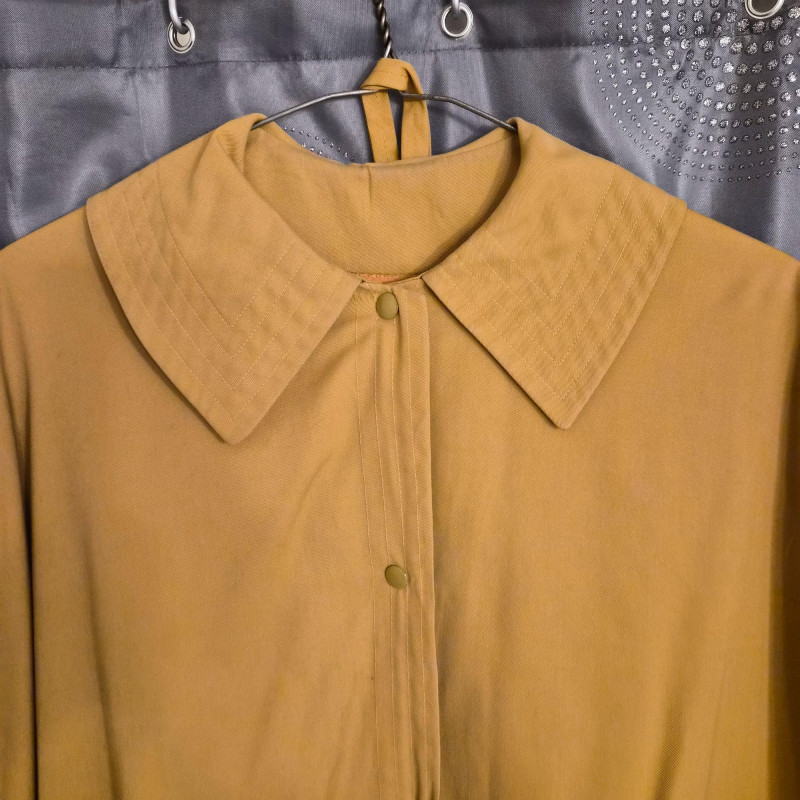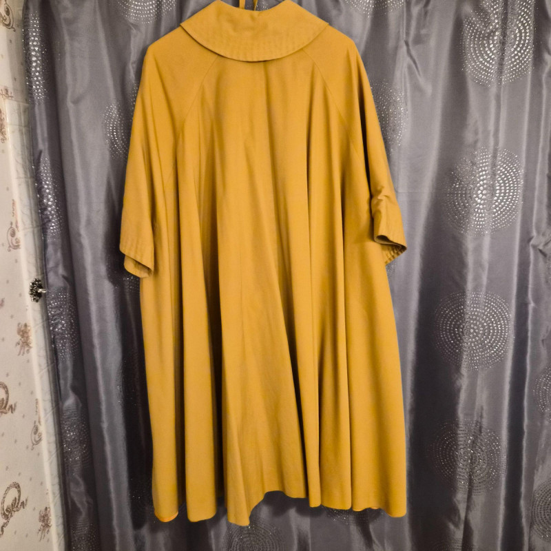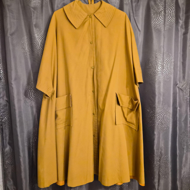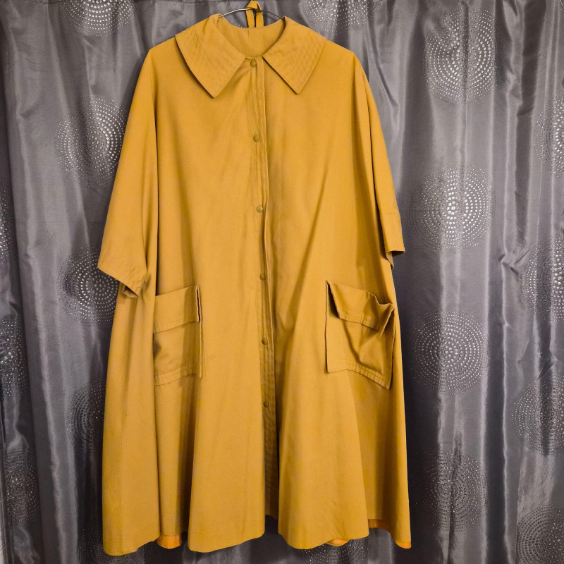 A bold and playful 1960s Mainstreet coat in mustard yellow, featuring a dramatic flared silhouette and 3/4 sleeves. This vintage piece includes: The coat’s swingy shape and saturated color channel mid-century optimism and style. A standout piece for collectors, stylists, or anyone curating a retro wardrobe with personality.