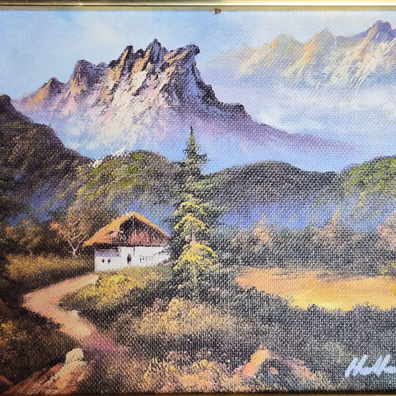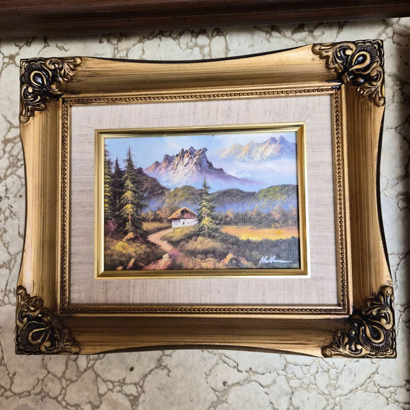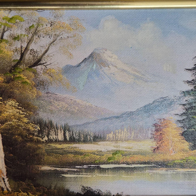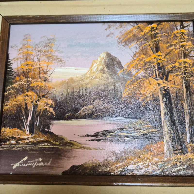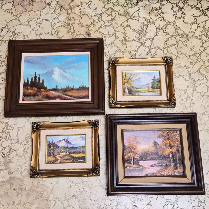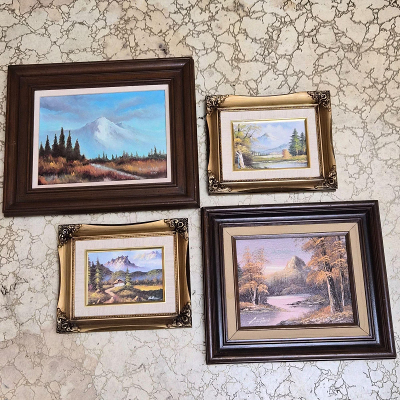 A set of four framed and signed oil paintings, each capturing a serene mountain landscape with expressive brushwork and atmospheric depth. The collection includes: Each painting is signed by the artist and housed in complementary frames, ranging from ornate gold to textured wood. The scenes evoke alpine paths, quiet lakes, and autumn forests—perfect for cabin walls, nature-inspired interiors, or collectors of regional landscape art.