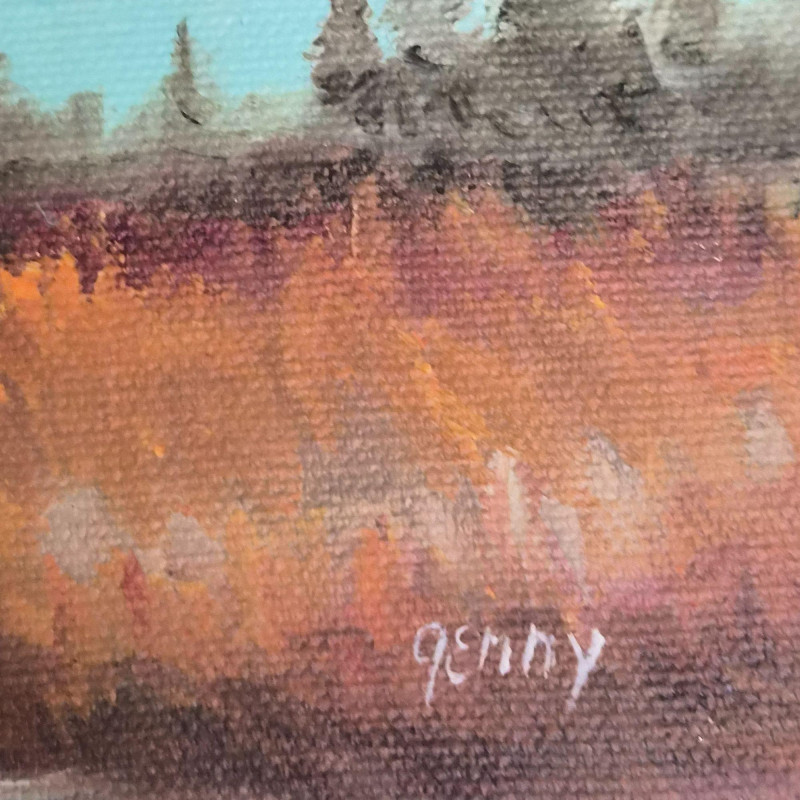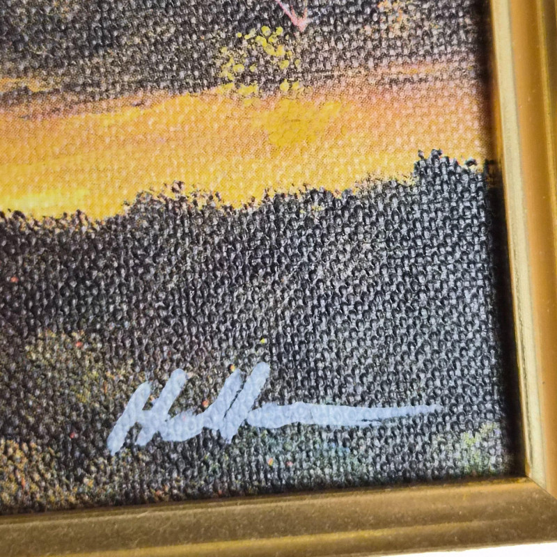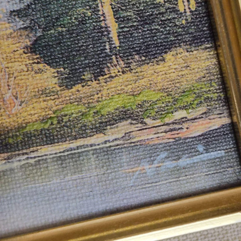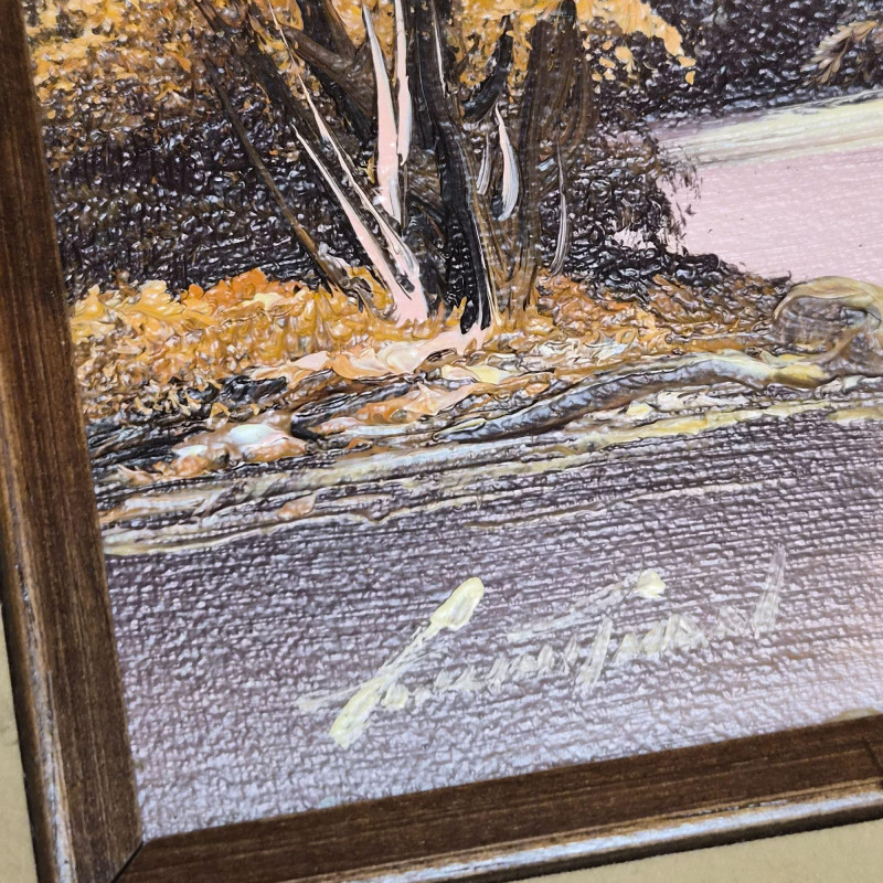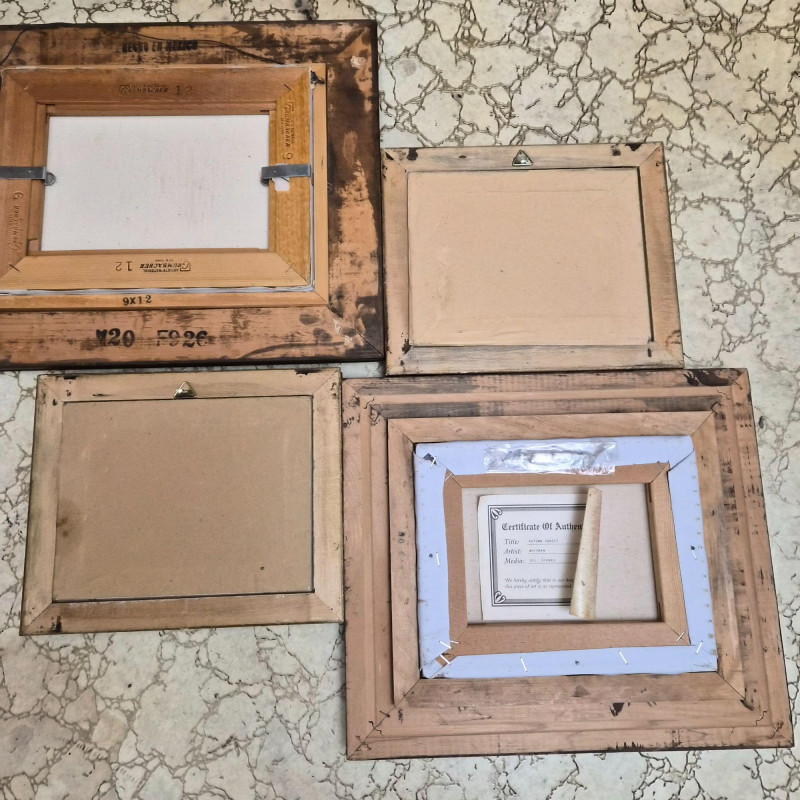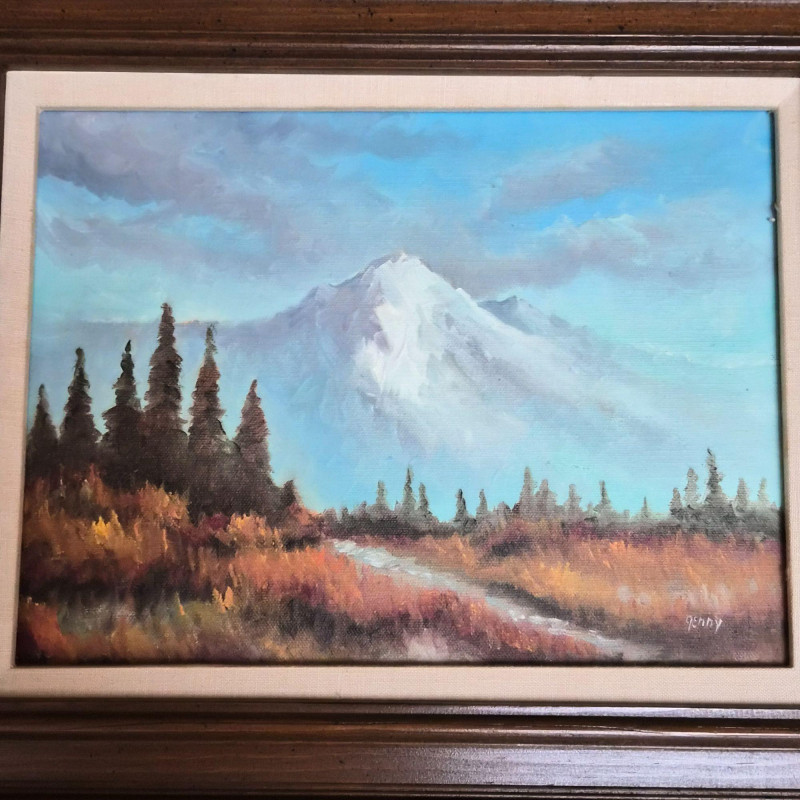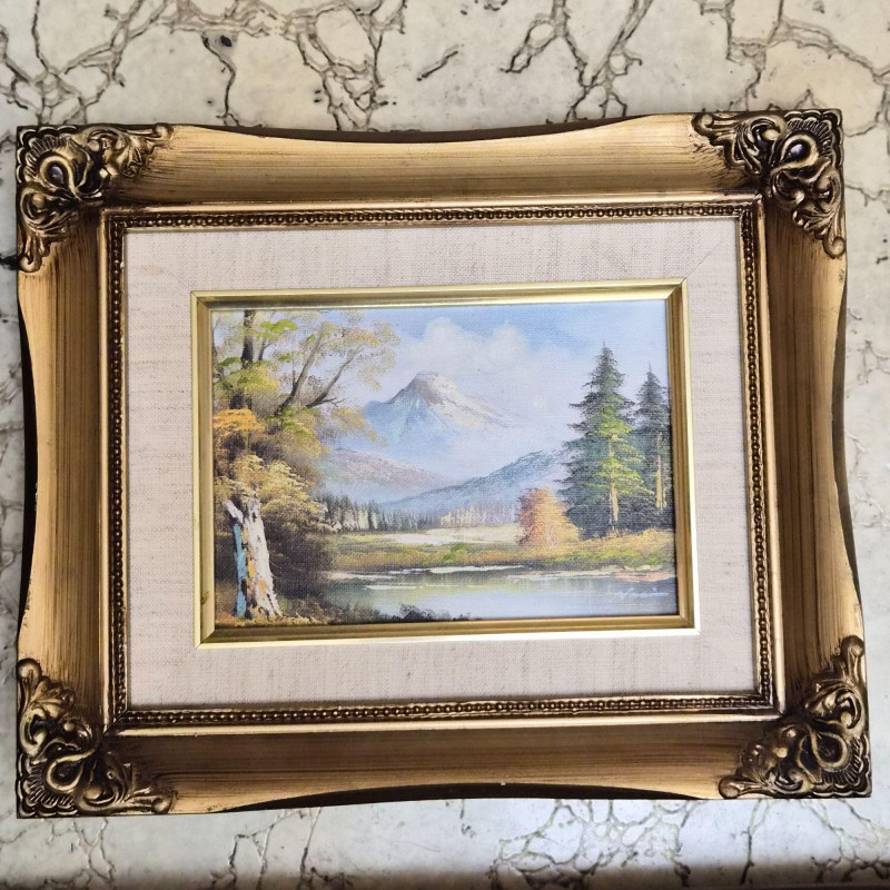 A set of four framed and signed oil paintings, each capturing a serene mountain landscape with expressive brushwork and atmospheric depth. The collection includes: Each painting is signed by the artist and housed in complementary frames, ranging from ornate gold to textured wood. The scenes evoke alpine paths, quiet lakes, and autumn forests—perfect for cabin walls, nature-inspired interiors, or collectors of regional landscape art.
