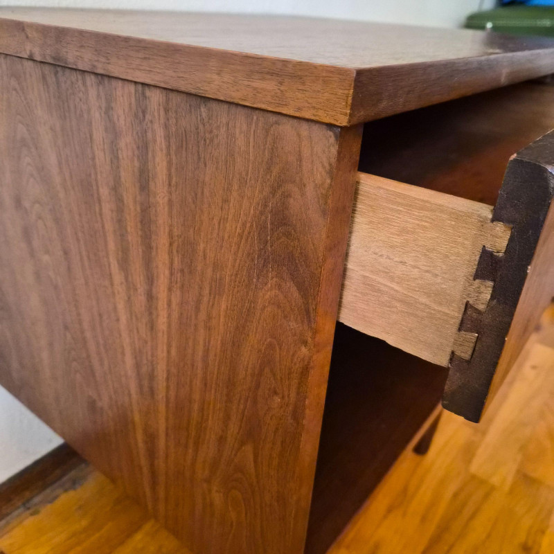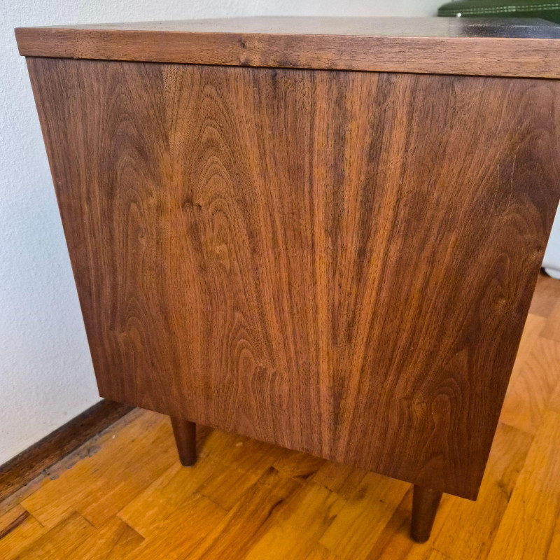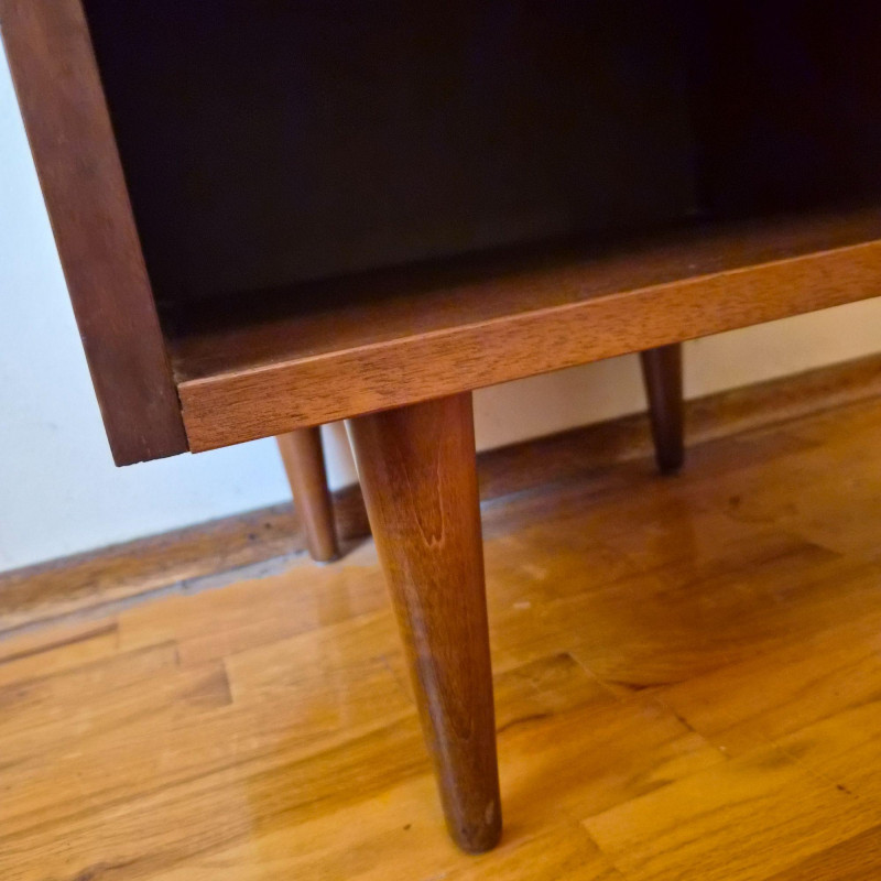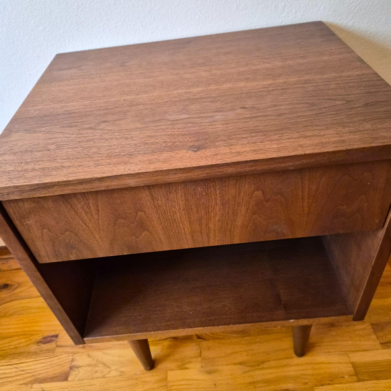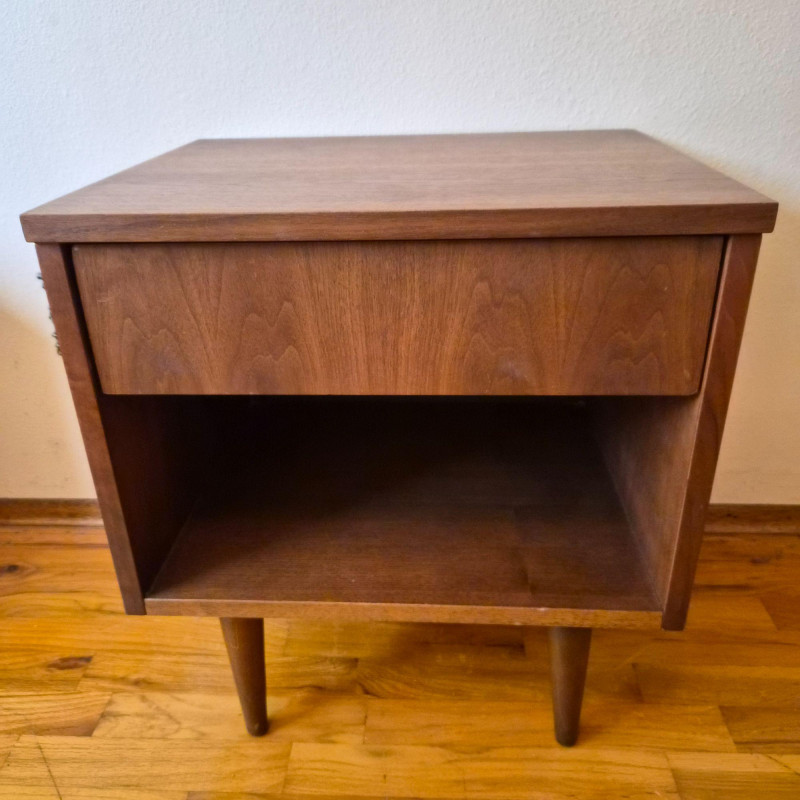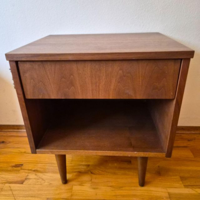 A classic mid-century modern nightstand in solid wood, featuring clean lines and practical design. The piece includes: Compact and versatile, this nightstand offers timeless MCM styling with warm wood grain and minimalist charm. Ideal for bedside use, studio storage, or restoration projects.