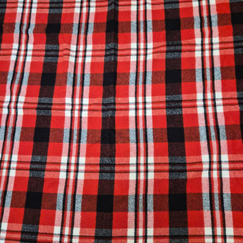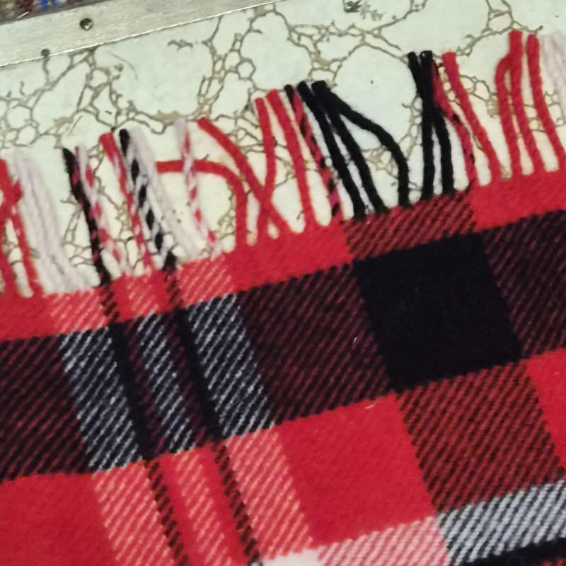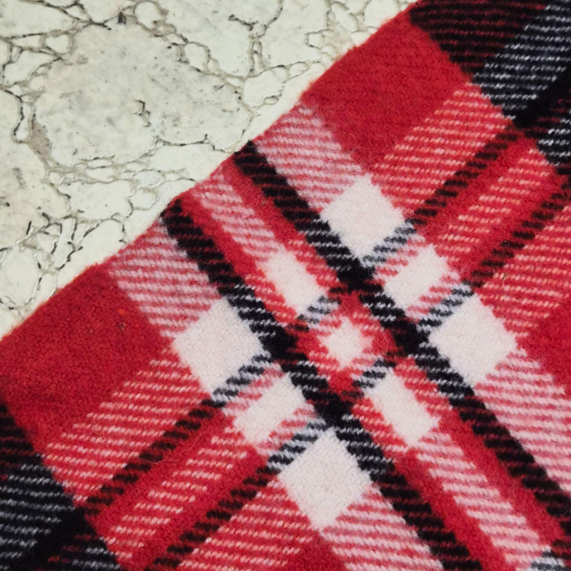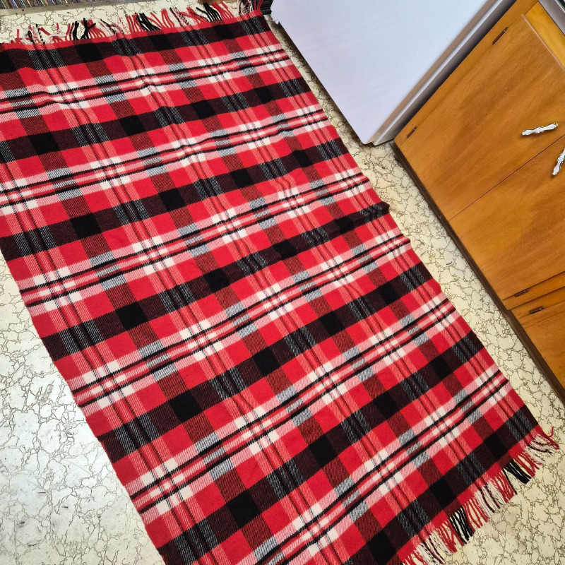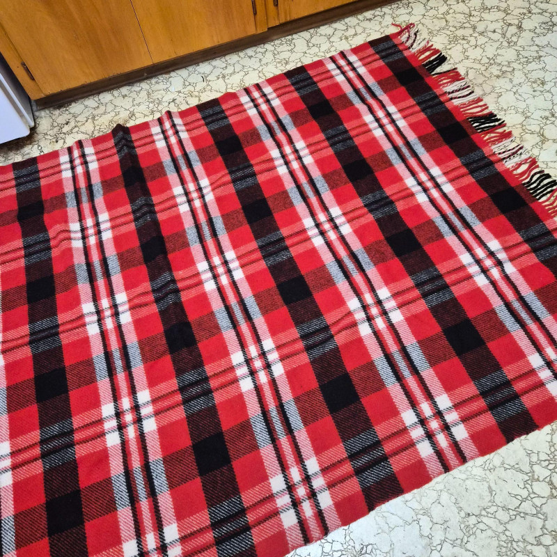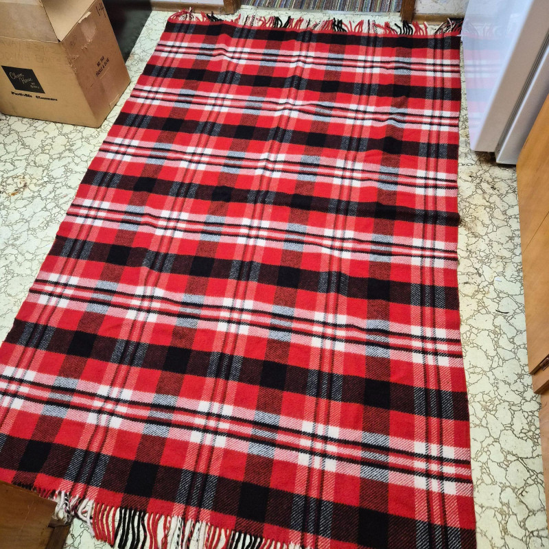 A classic red plaid wool throw blanket with fringe ends, measuring a generous 80" x 52". Though it has no maker’s tag, the craftsmanship is evident in its tight weave, soft texture, and well-finished edges, Pendleton-style. Perfect for collectors of heritage textiles or anyone seeking a timeless accent for cozy spaces.