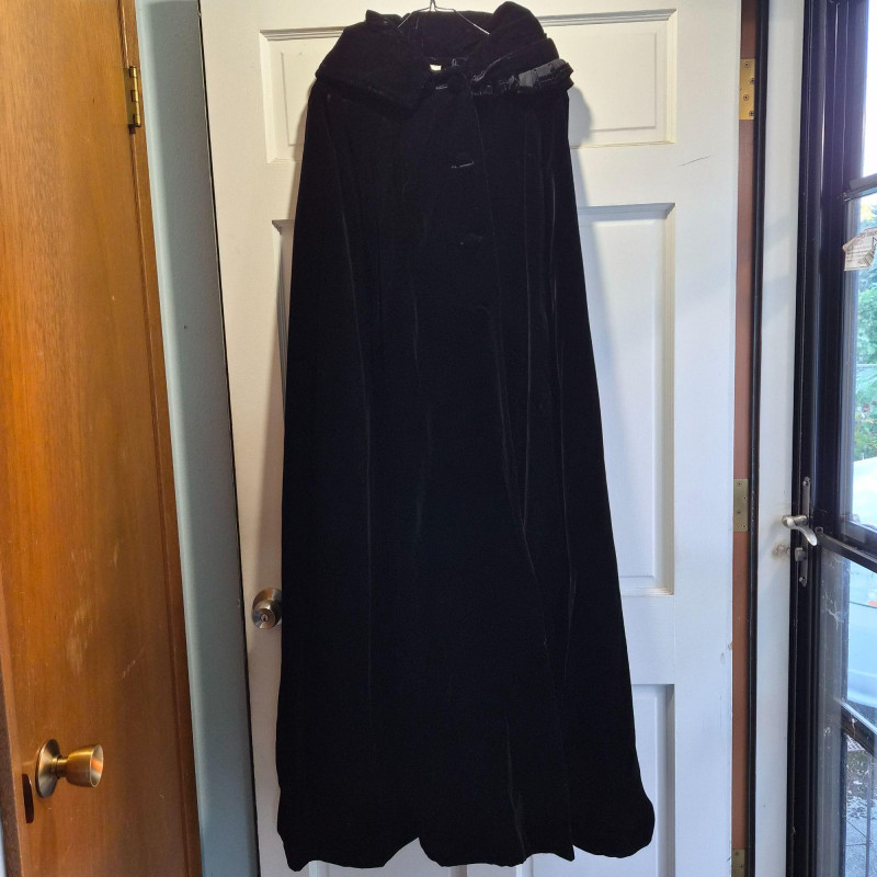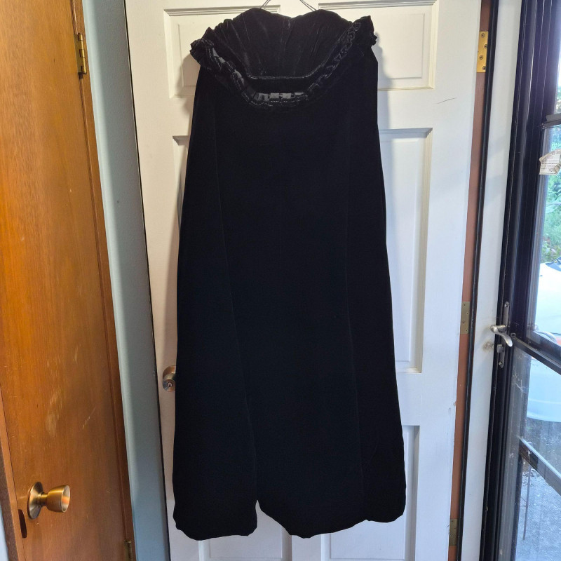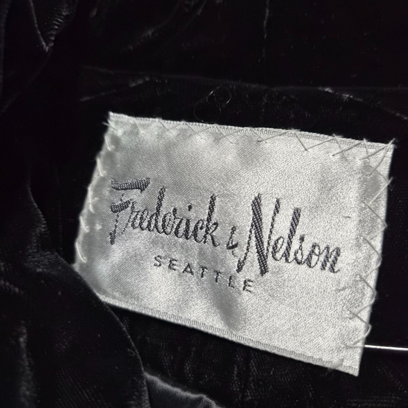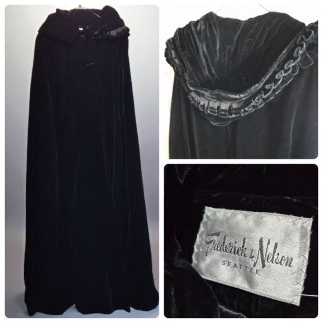 A stunning black velvet cape by Frederick & Nelson, Seattle’s iconic department store, known for timeless elegance and luxury. This full-length piece features: Perfect for collectors of vintage outerwear, costume designers, or anyone curating a wardrobe with gothic glamour and Pacific Northwest provenance