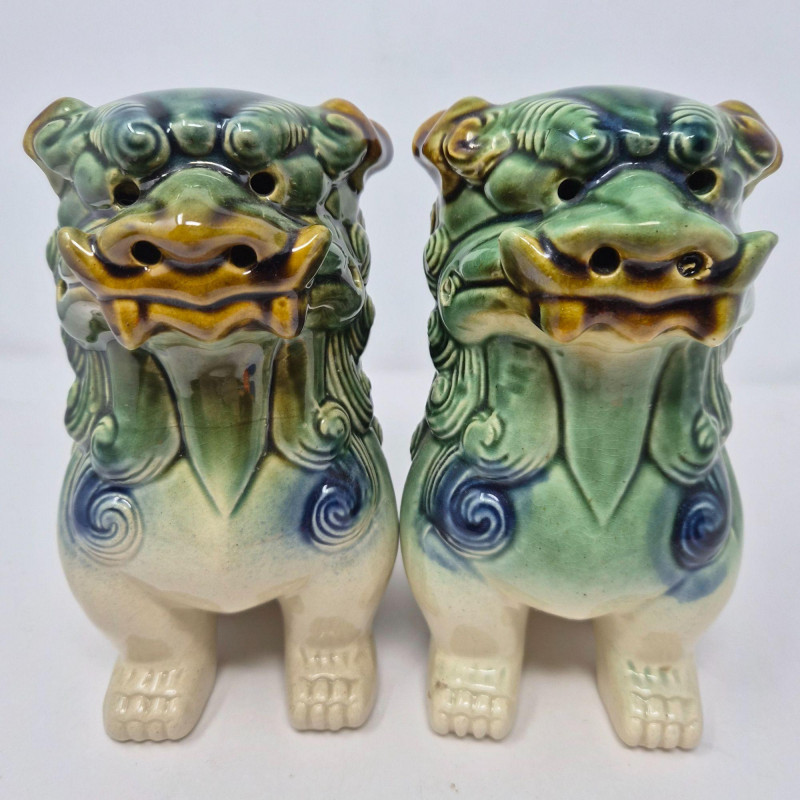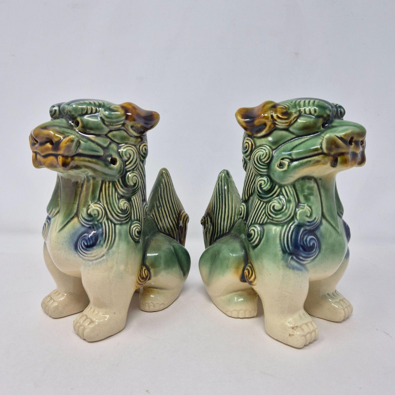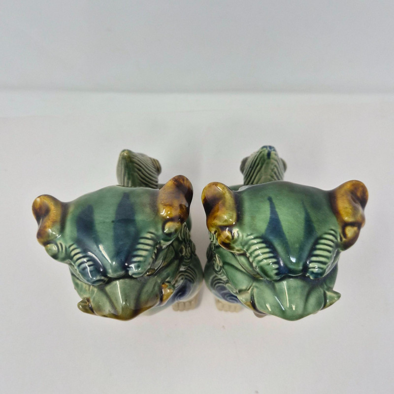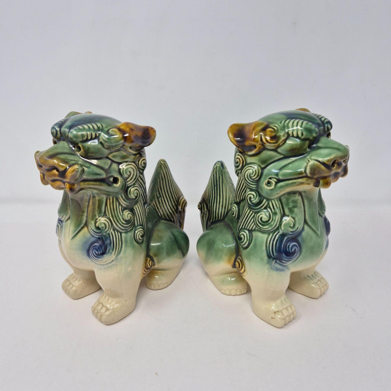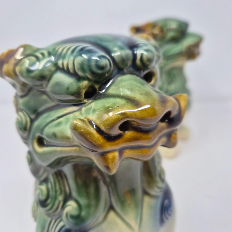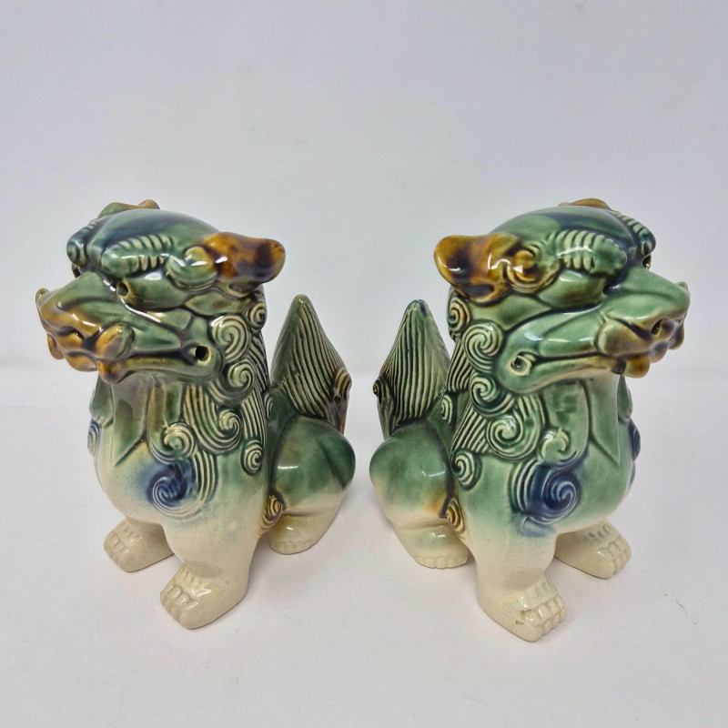 A spirited duo of ceramic Foo Dogs, standing proud at 7.5" tall with a footprint of 5.5" x 3.5". This pair is richly glazed in earthy tones of green, brown, and beige—each figure a fierce yet charming sentinel of style. Traditionally symbols of protection and prosperity, these mythical lion-dogs bring a touch of Eastern mystique to any shelf, mantle, or entryway. Their expressive faces and stylized manes evoke centuries of folklore, while the glaze work adds a warm, organic patina.