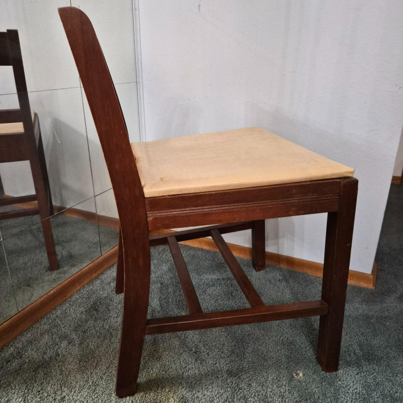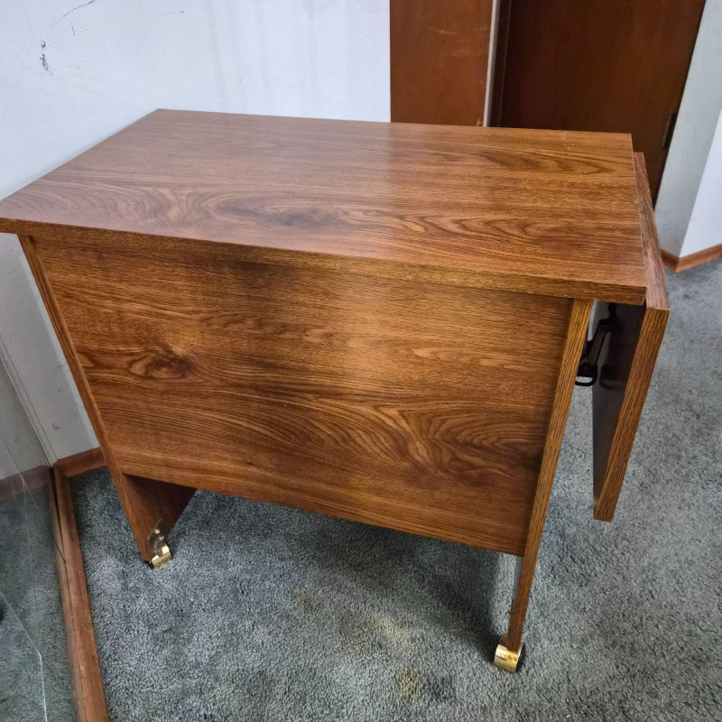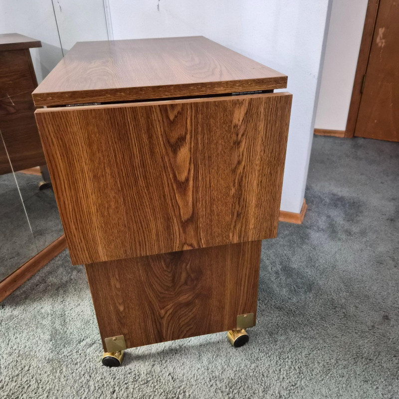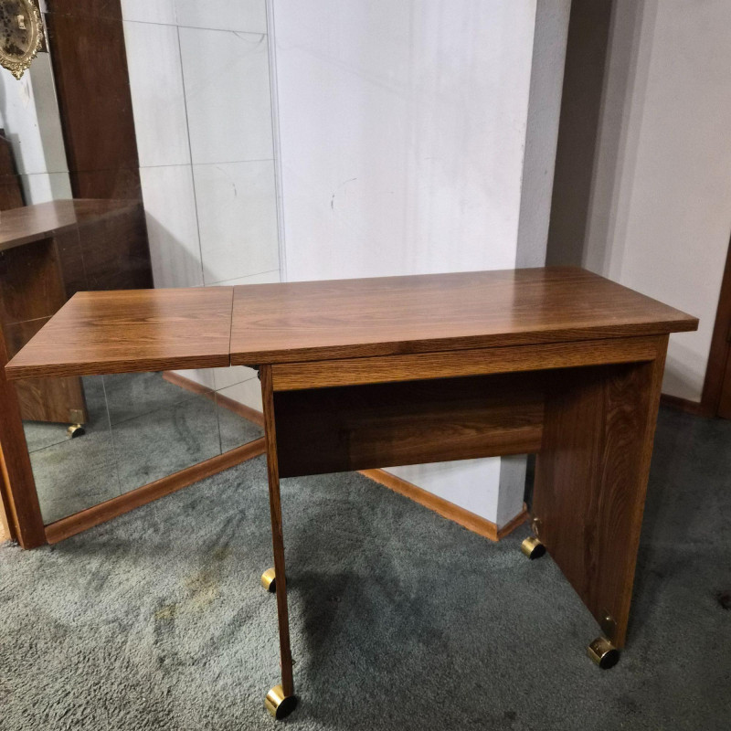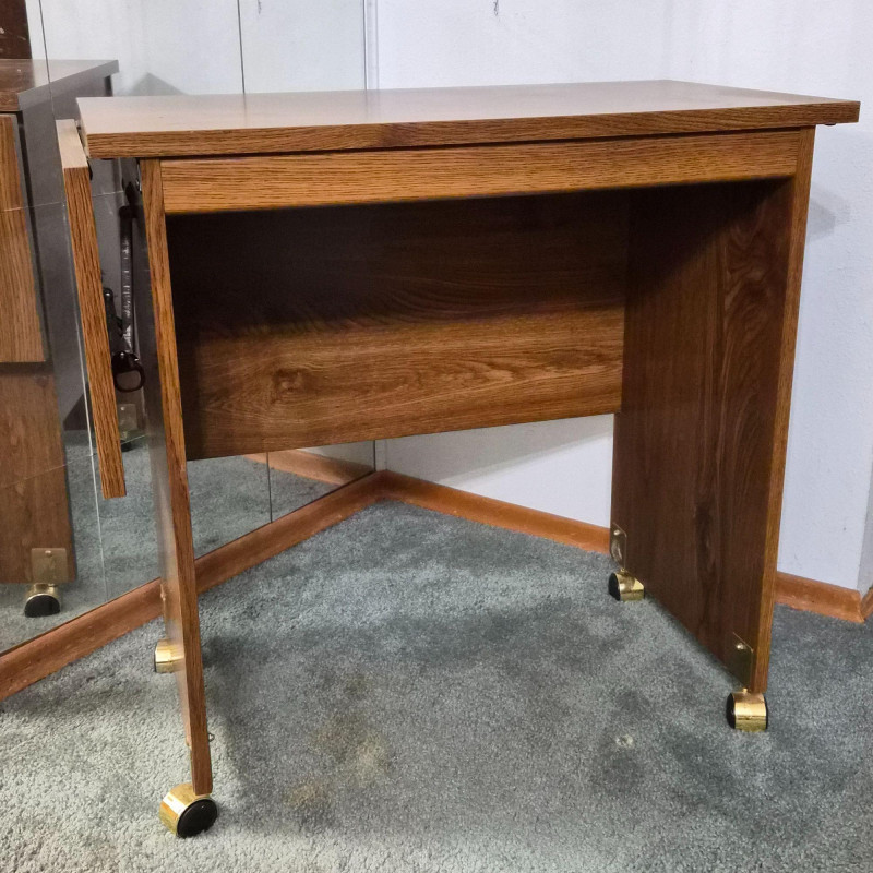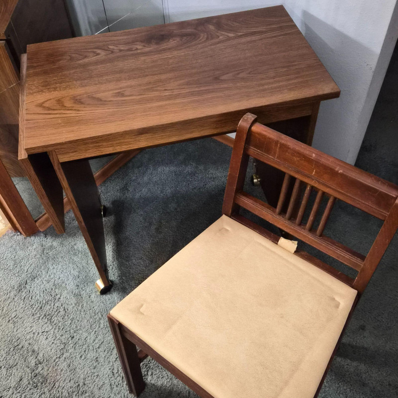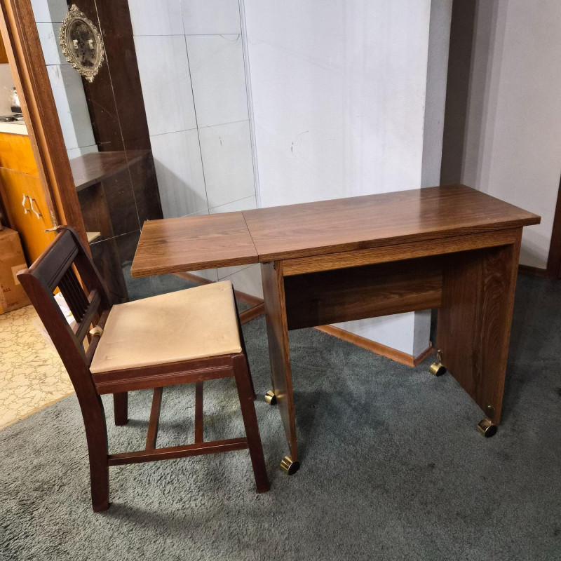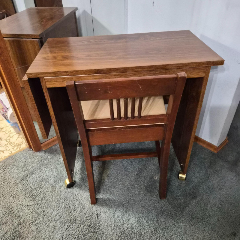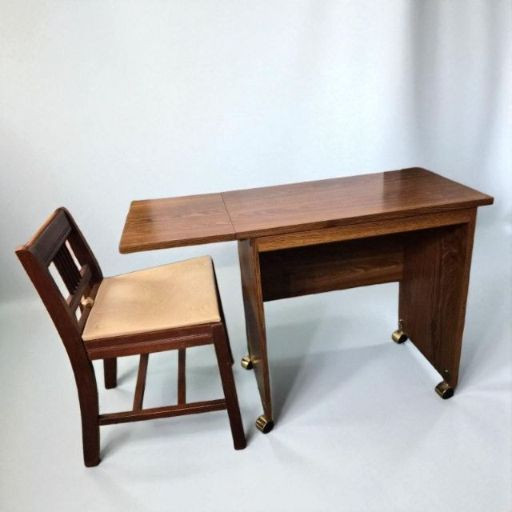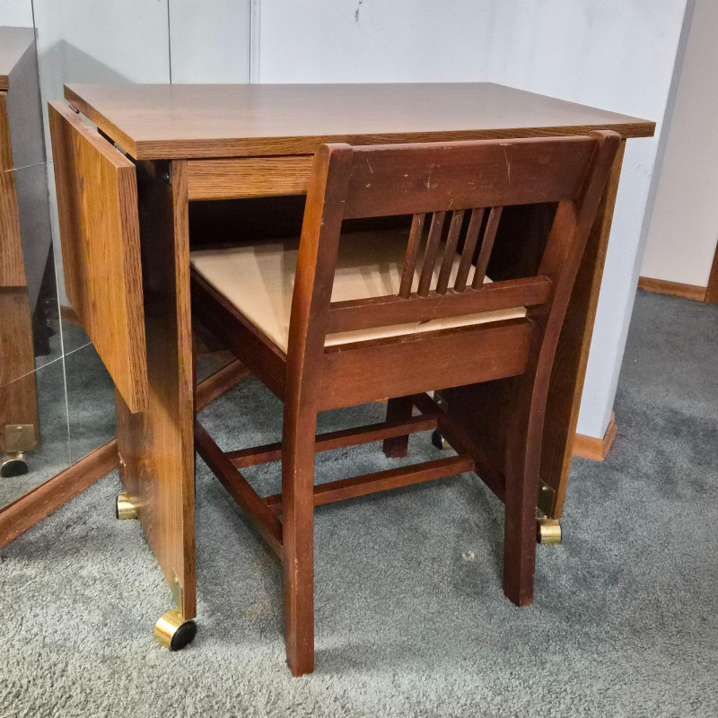 A space-savvy fold-down writing table on wheels, paired with a compact size vintage wood chair—perfect for small spaces, dorms, or creative corners.