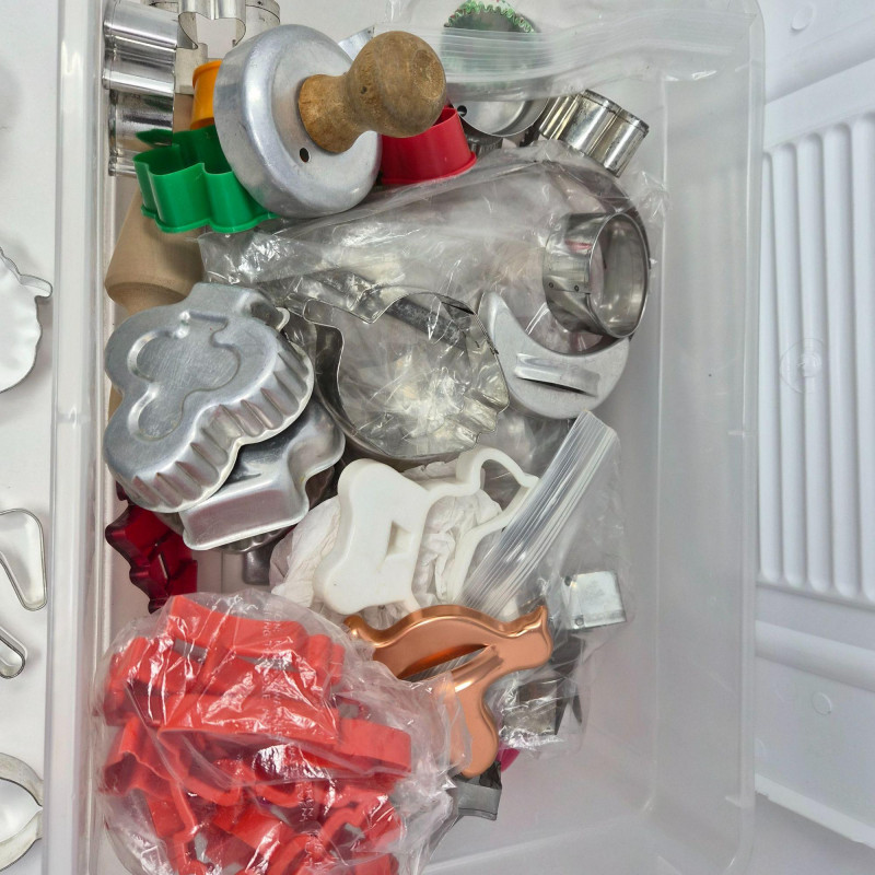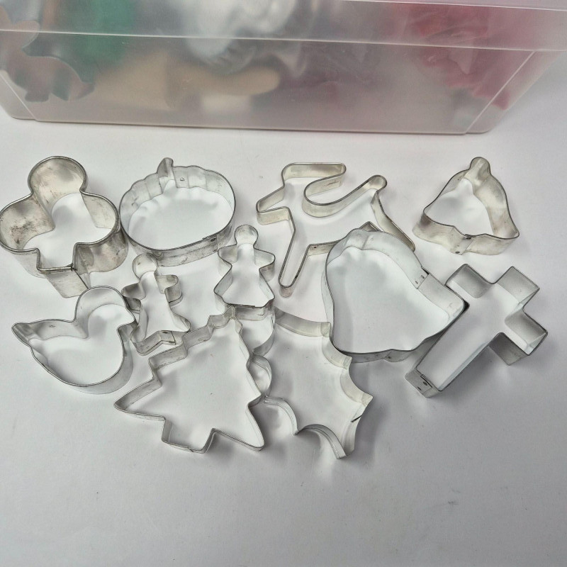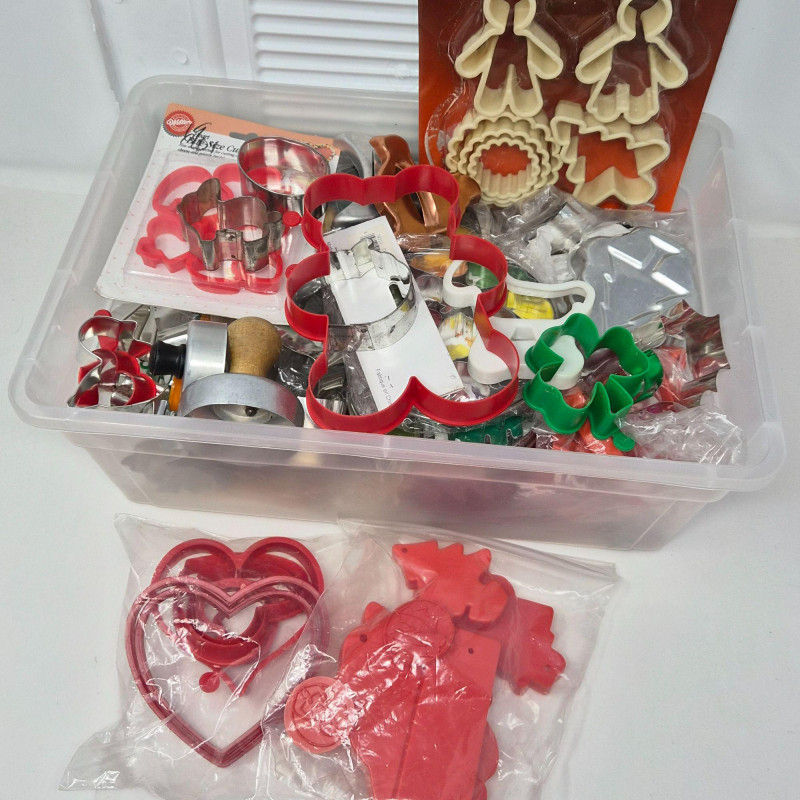 A delightful treasure trove of vintage cookie cutters in both plastic and metal, offering a whimsical mix of shapes, eras, and baking nostalgia. This mega lot includes: Whether you're baking with grandkids, staging a retro kitchen display, or harvesting for craft projects, this lot delivers a joyful mix of form and function—with a dash of vintage magic.