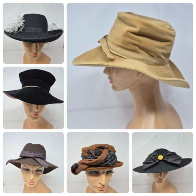 A sophisticated set of six vintage women’s dress hats, each with its own flair—from classic millinery to designer drama: This curated lot offers a glimpse into mid-century and late 20th-century women’s fashion, ideal for collectors, stylists, or anyone drawn to the elegance of vintage headwear.