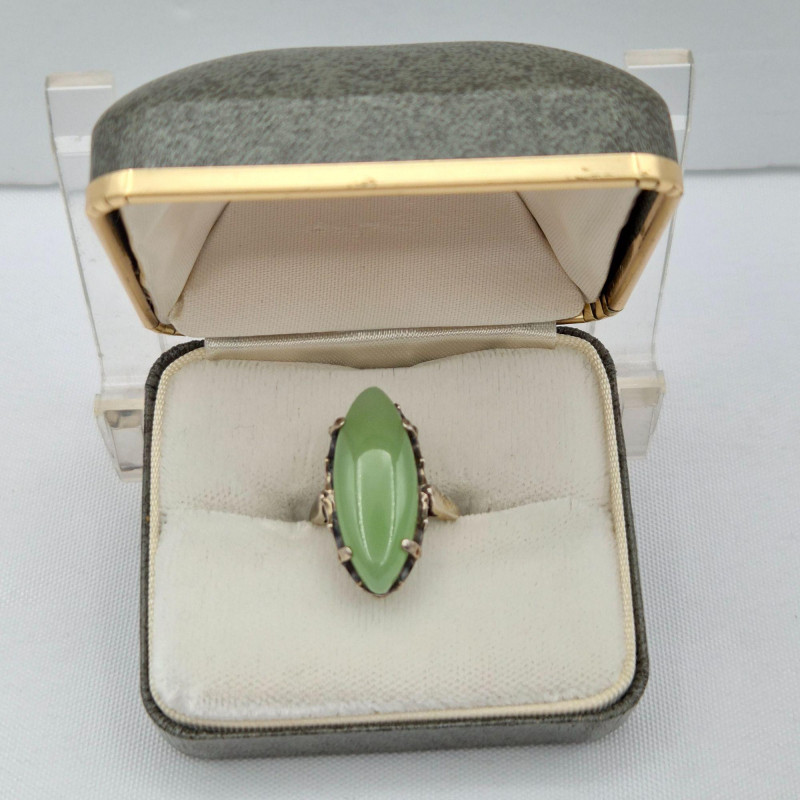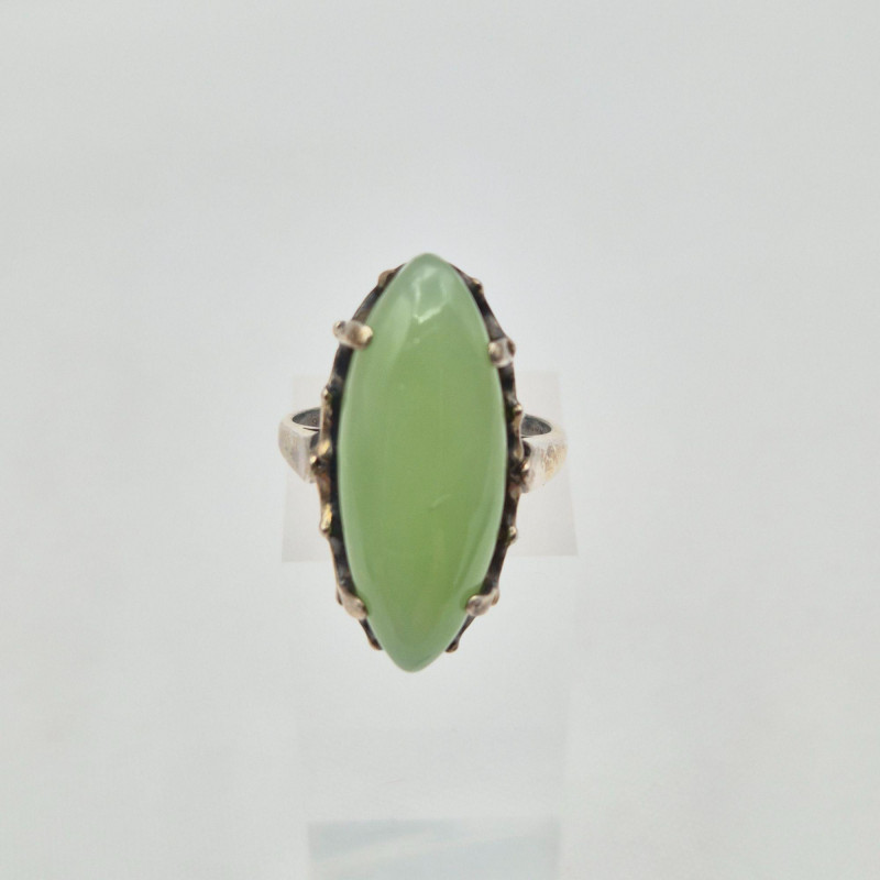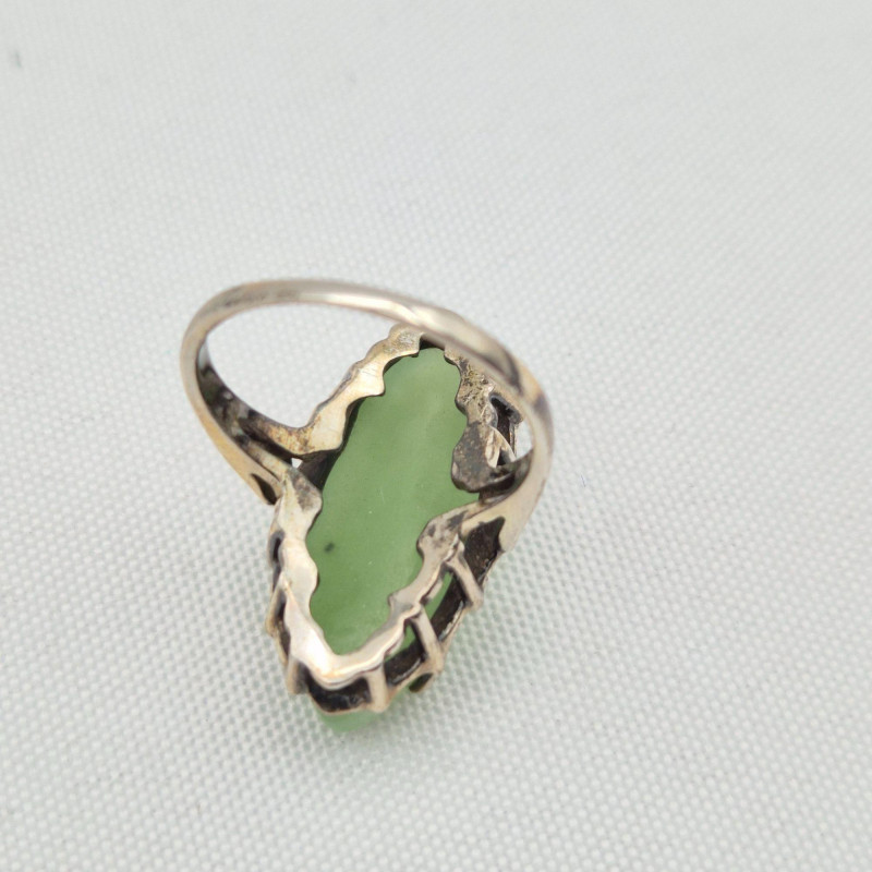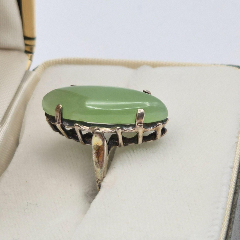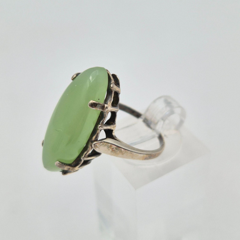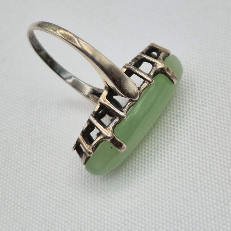 A graceful sterling silver ring, featuring a bold, prong-set jade cabochon measuring 1" x 0.5". The silver stamp is faint but reads Sterling, suggesting vintage craftsmanship and hand-set detail.