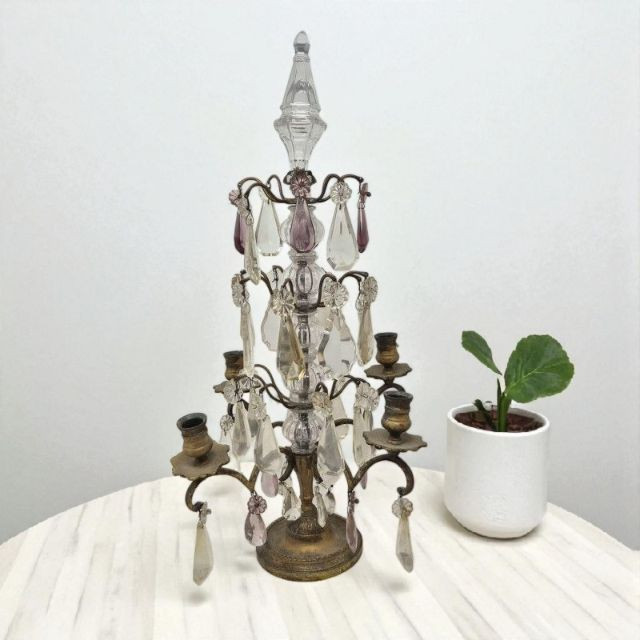 A graceful Art Nouveau-style brass candelabra adorned with hanging crystals and flowing lines. The base measures 4.5" across, anchoring the piece with classic charm. Only one crystal appears to be a different style. The overall silhouette is intact, so the different piece is very hard to see. Perfect for romantic interiors, vintage-inspired tablescapes, stage prop or collectors of decorative lighting. Its sculptural form and warm brass patina evoke turn-of-the-century elegance with a touch of sparkle.