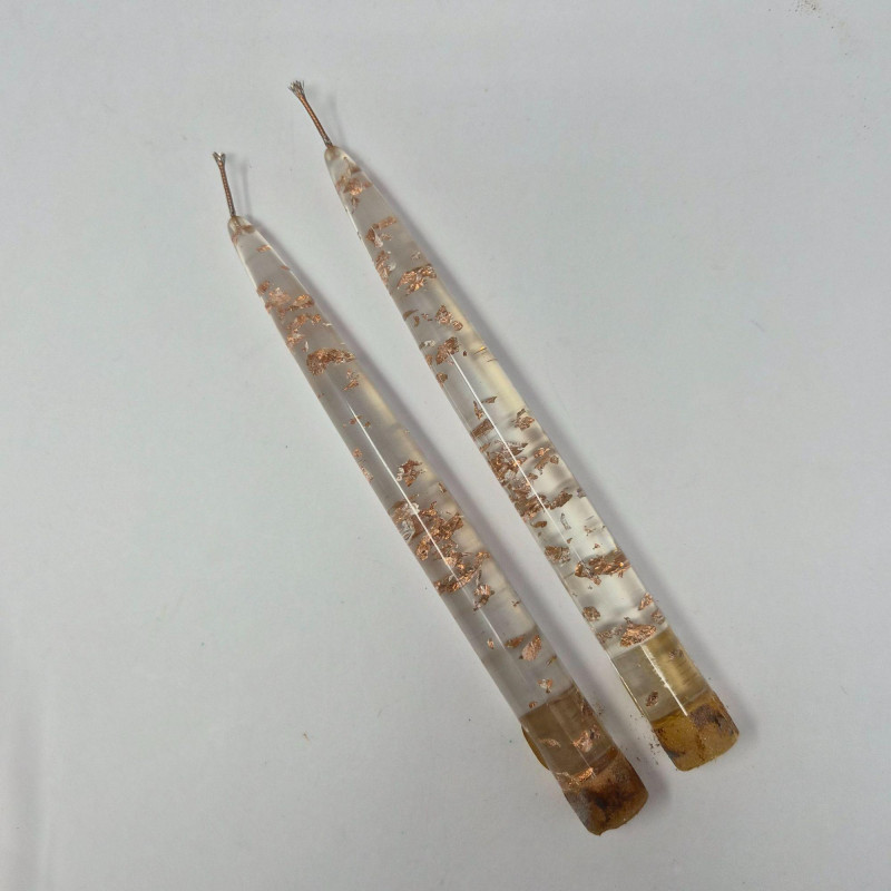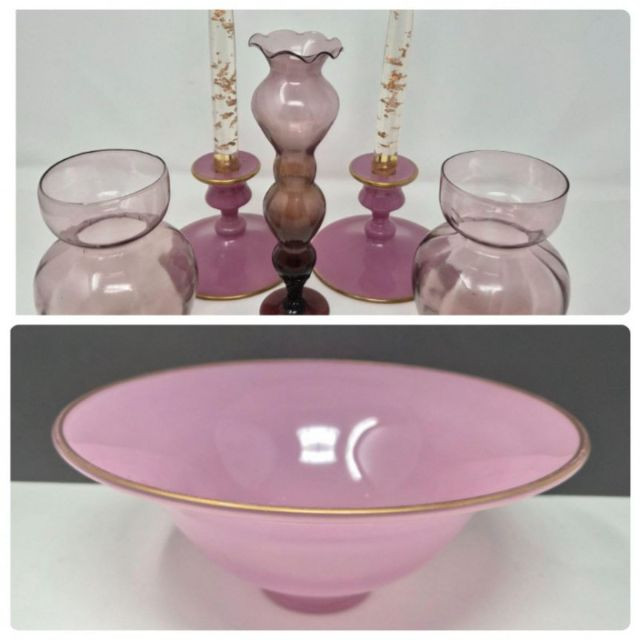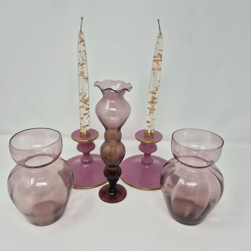 A radiant and coordinated purple glass décor collection, paired with shimmering decorative gold flake candles for a luxe, layered look. This lot includes: