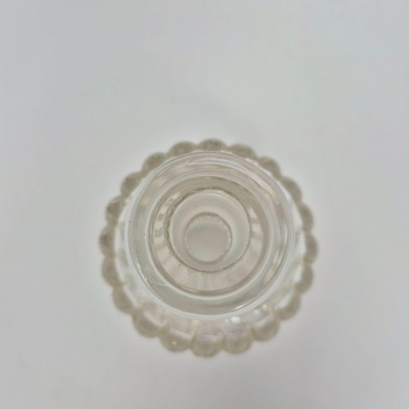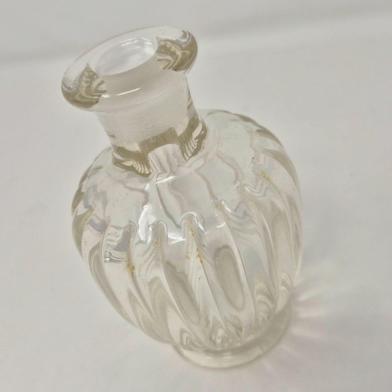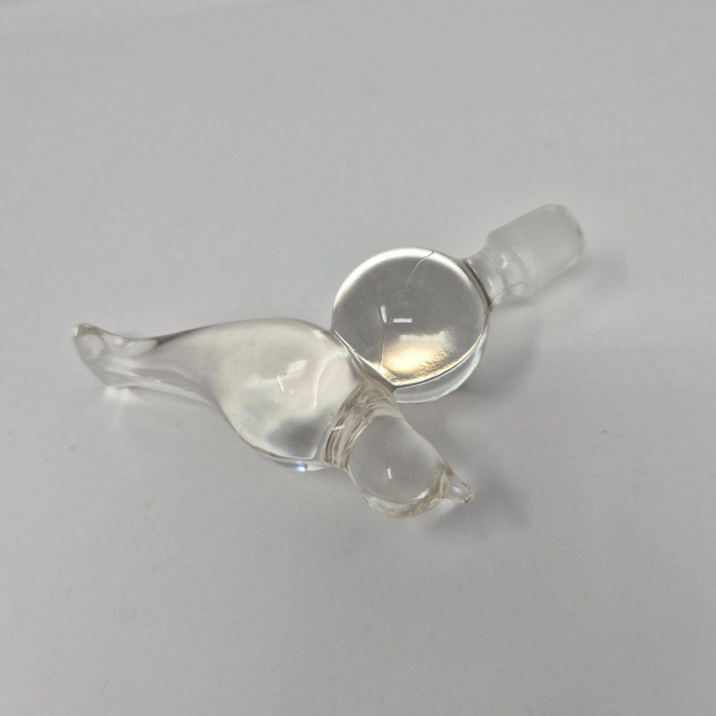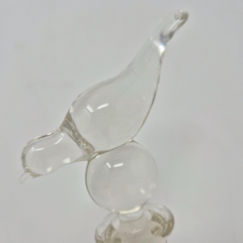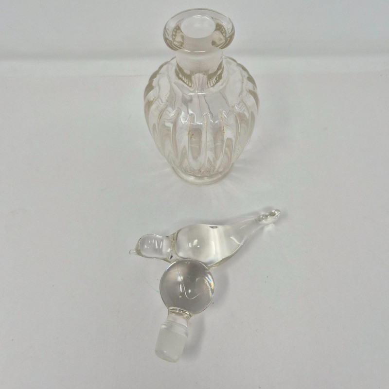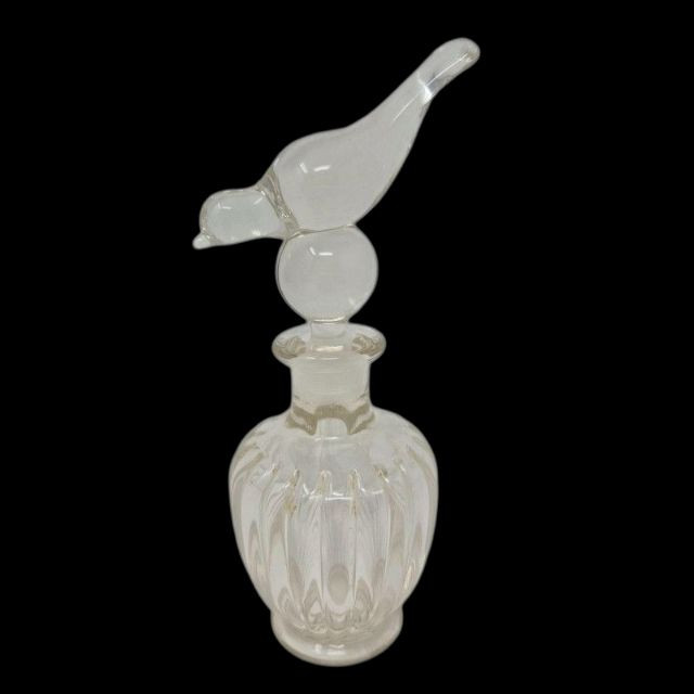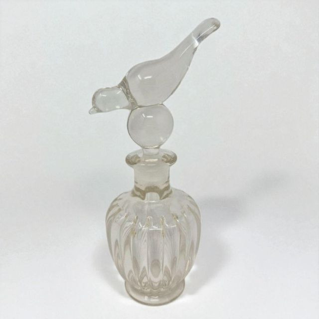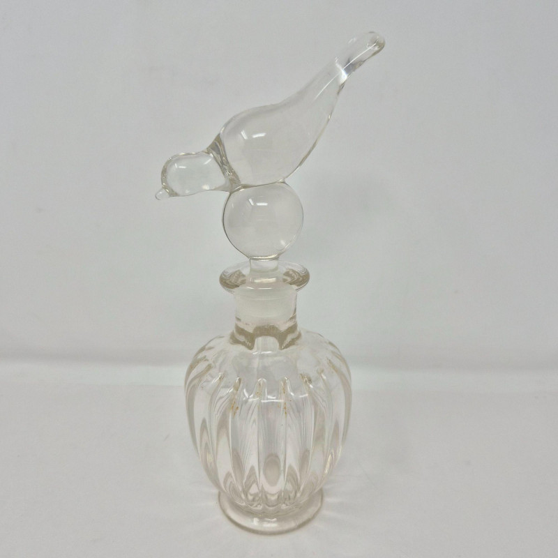 A sculptural and elegant Art Deco-style glass scent bottle, featuring a vintage bird-shaped stopper perched atop a clear, tapered base. This piece offers: Whether styled solo or grouped with other vanity glass, this bottle brings a touch of nostalgia and avian elegance to any setting.