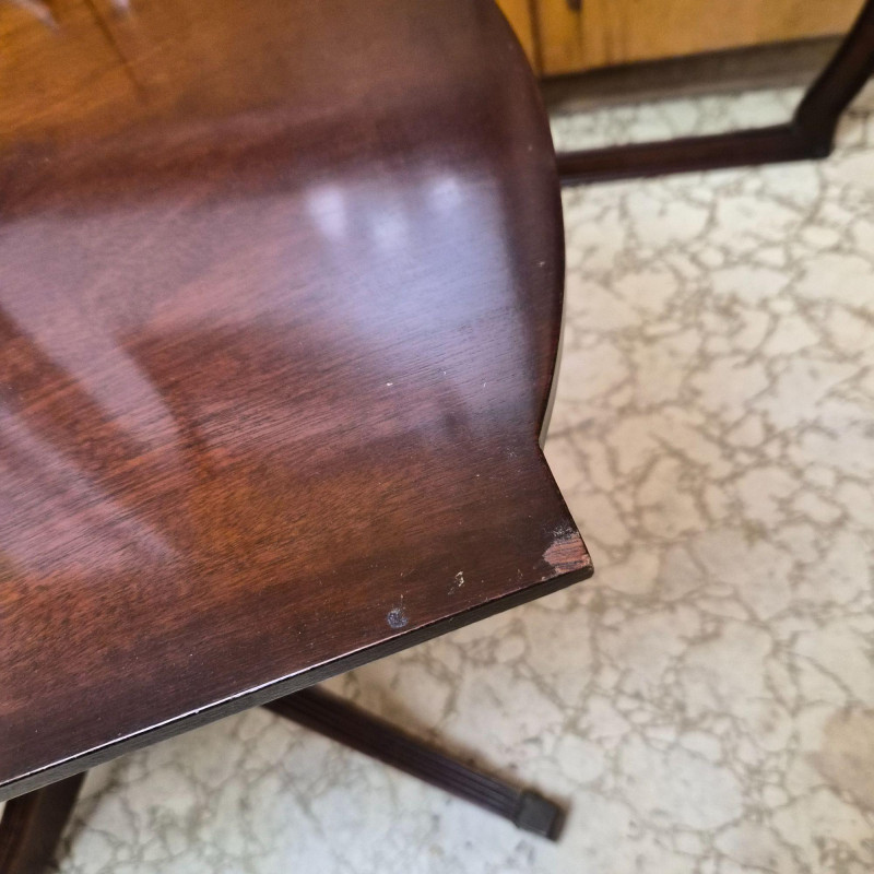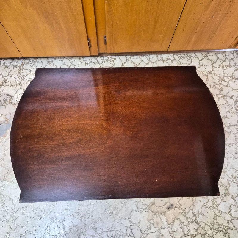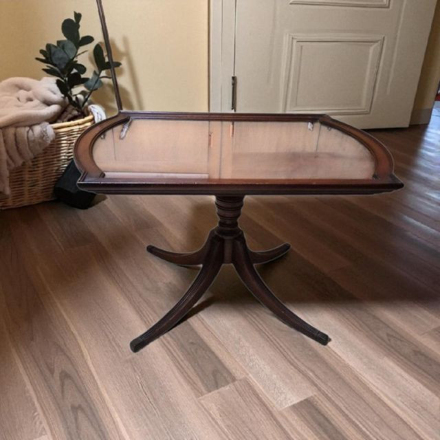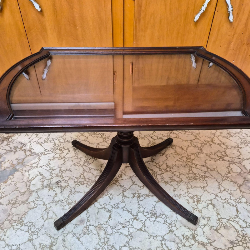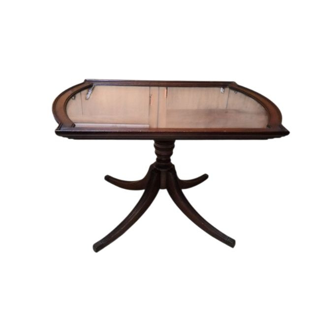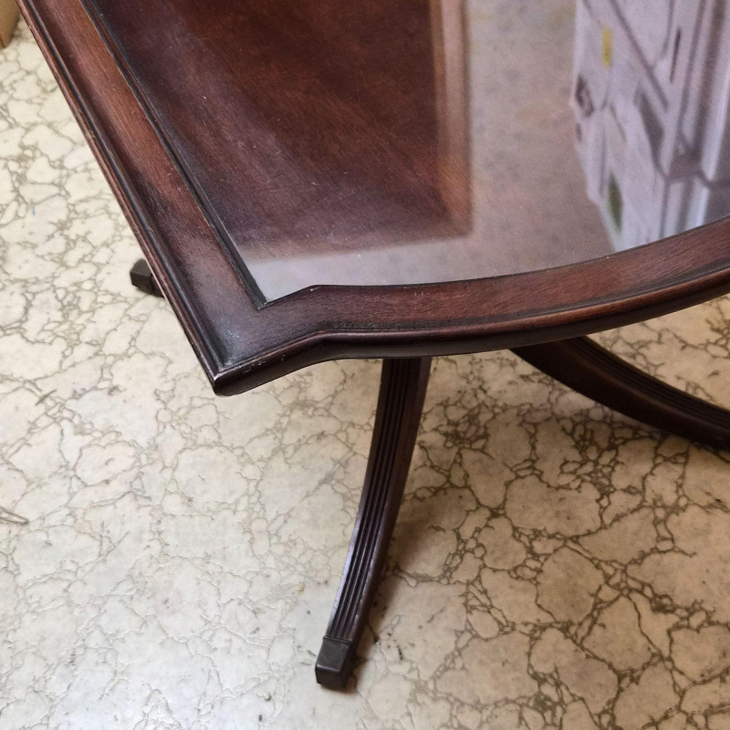 A classic and functional antique mahogany side table, featuring a removable framed glass top for easy cleaning or display versatility. This compact piece offers: